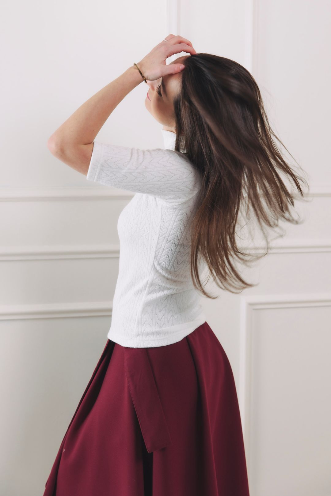 - Střih: Jednoduchý, přiléhavý střih s raglánovými rukávy jemně kopíruje postavu, aniž by zdůrazňoval její nedostatky. Zkrácené rukávy sahající k loktům dodávají roláku nečekaný šmrnc a opticky zeštíhlují ruce.