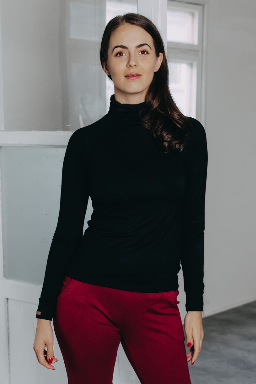 Bambus jsme si mimořádně oblíbili, proto jsme jeho výjimečné vlastnosti využili i pro tento rolák. Má vyšší gramáž, je teplejší než používáme v létě, ale rovněž jemný a příjemný na dotek. Bambusový materiál je příjemně vzdušný, přizpůsobí se konturám těla, odvádí vlhkost z těla a udržuje stálou tělesnou teplotu. Na podzim a v zimě je rolák skvělým parťákem jak samostatně se sukní či kalhotami, tak na vrstvení.