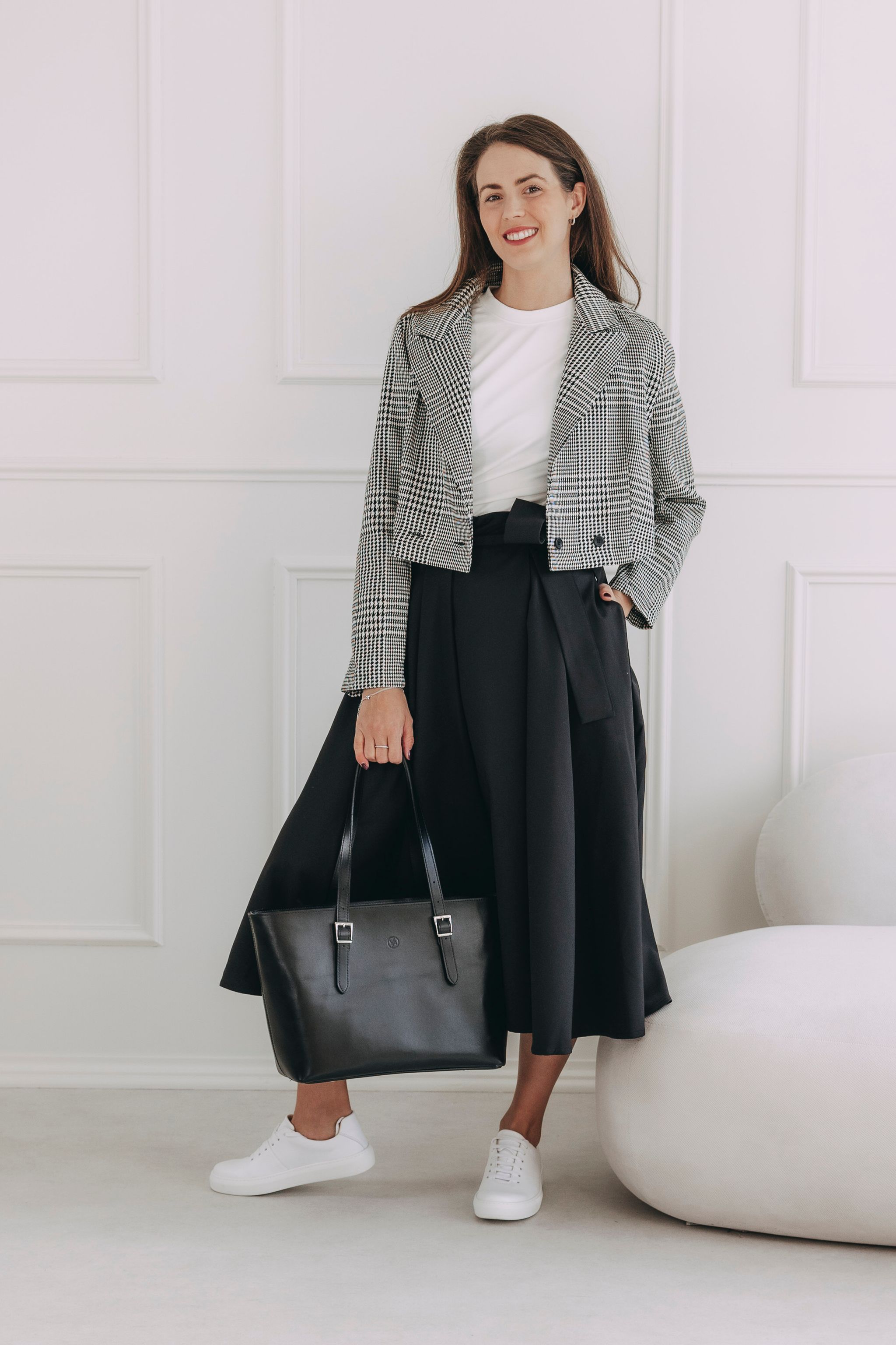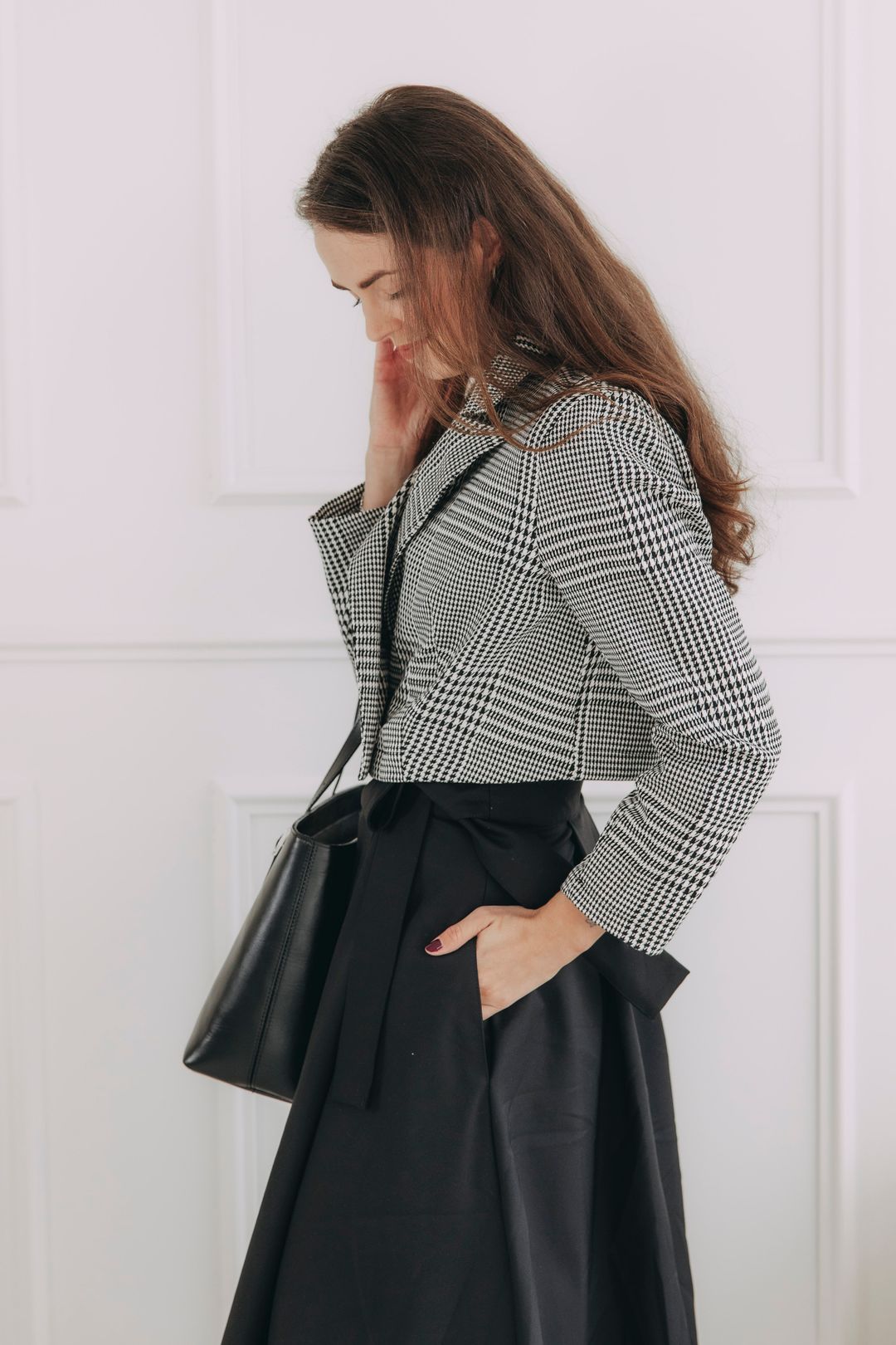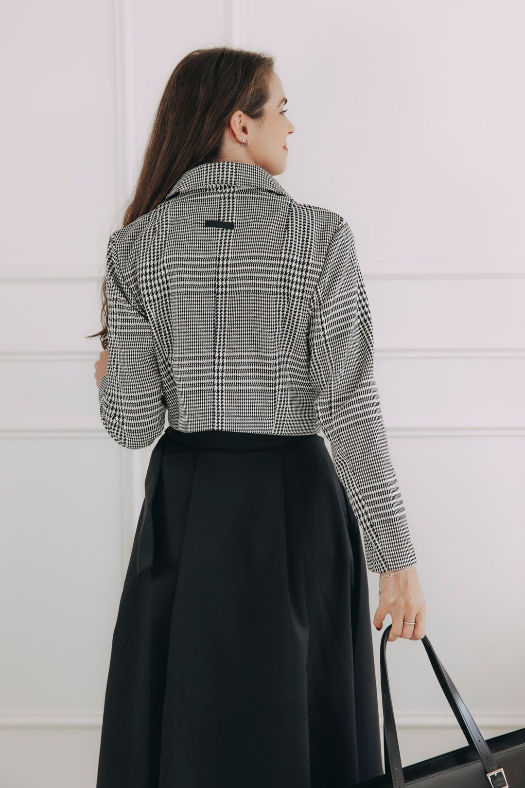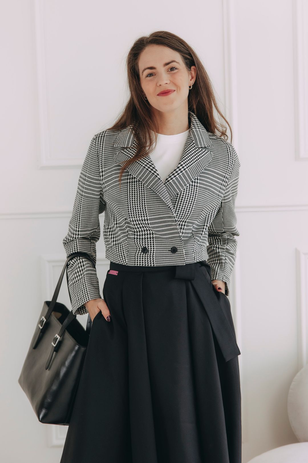 - Vzor a barva: Jemné černobílé káro - nadčasový vzor, který dodá vašemu outfitu šmrnc a eleganci.
