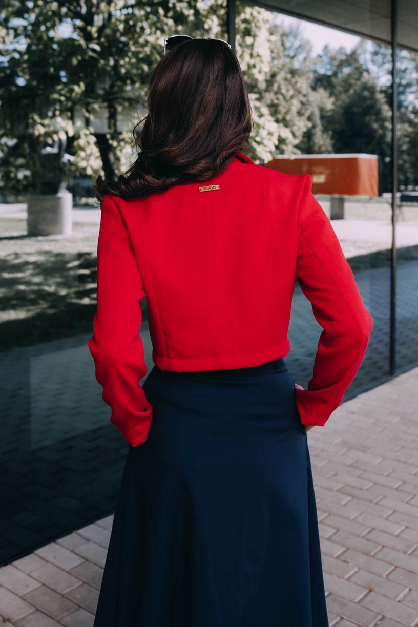 Klasické sáčko je fajn, ale někdy je potřeba trochu vystoupit z davu. S tímto úkolem si hravě poradí cropped sako Aris. Sukně nebo kalhoty s vysokým pasem tak bezvadně vyniknou. Aris se zapíná na dva knoflíčky ve spodní části a zaujme pořádným límcem, který můžete oživit broží, nebo nosit jako stojáček.