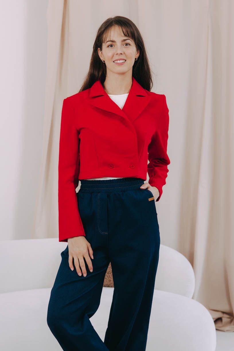 Cropnuté sáčko Aris zaujme neotřelým střihem s knoflíčky ve spodní části a výrazným límcem. Skvěle doplňuje sukně a kalhoty s vyšším pasem.
