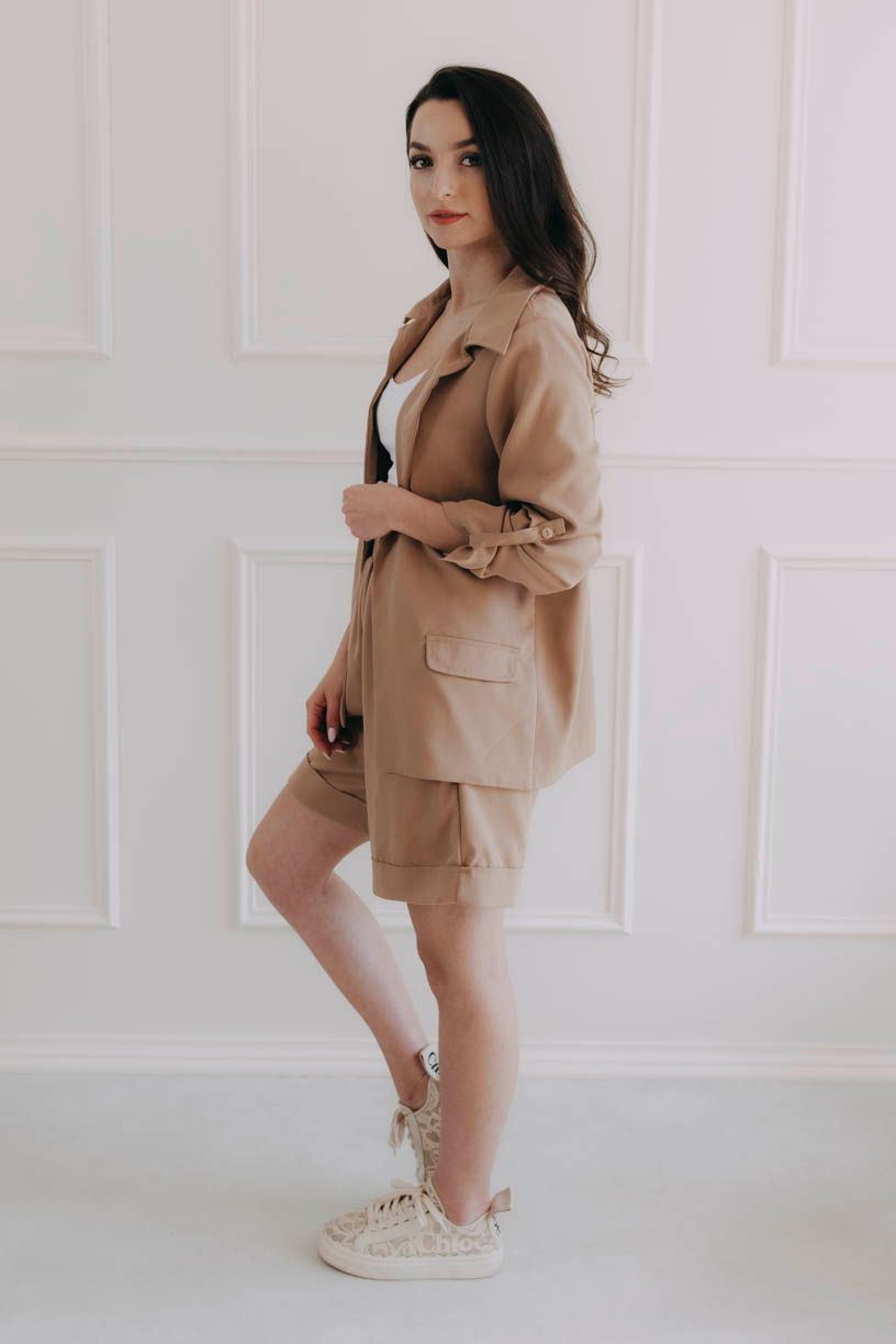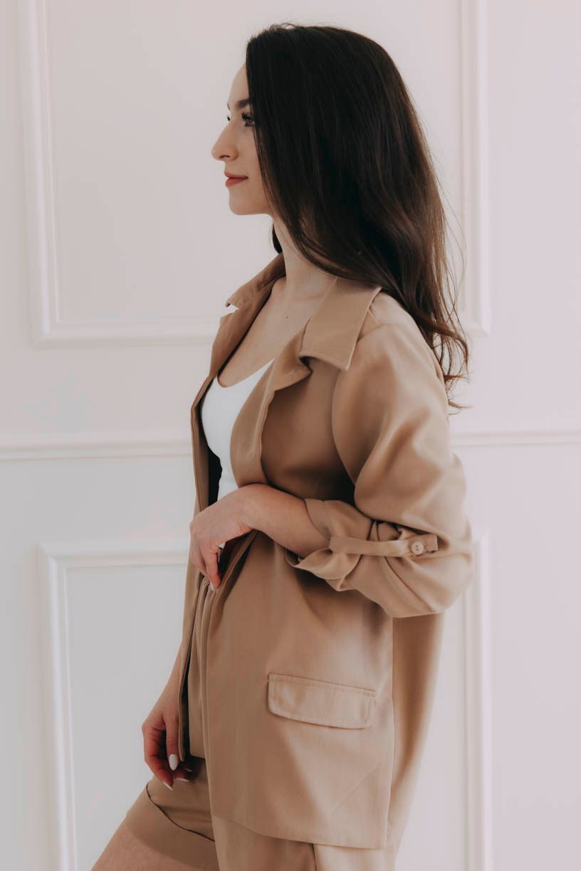 Volnější sáčko Chima s fake kapsami okouzlí sofistikovanými rukávy, které lze vyhrnout a zapnout, nebo nosit spuštěné.