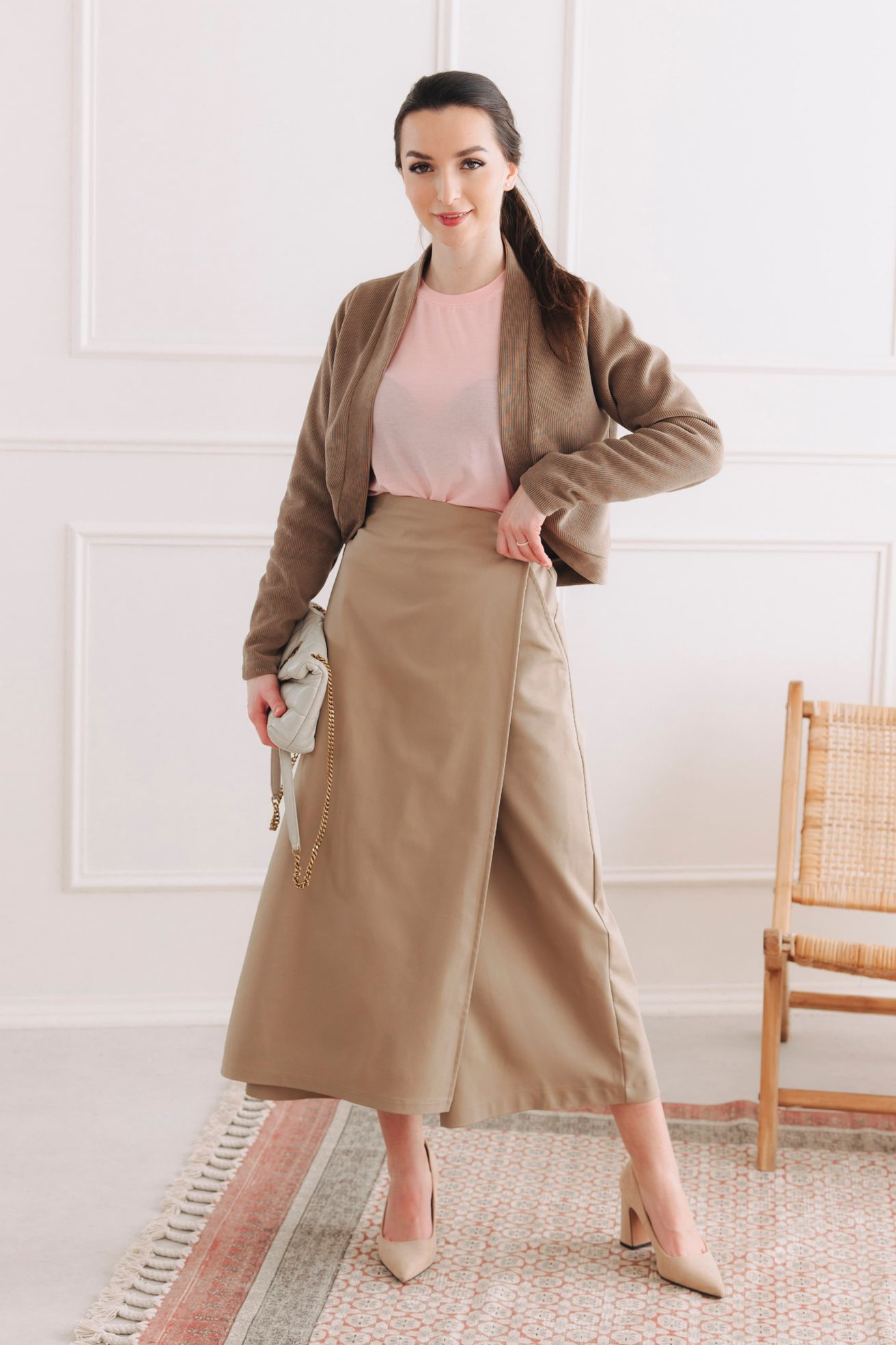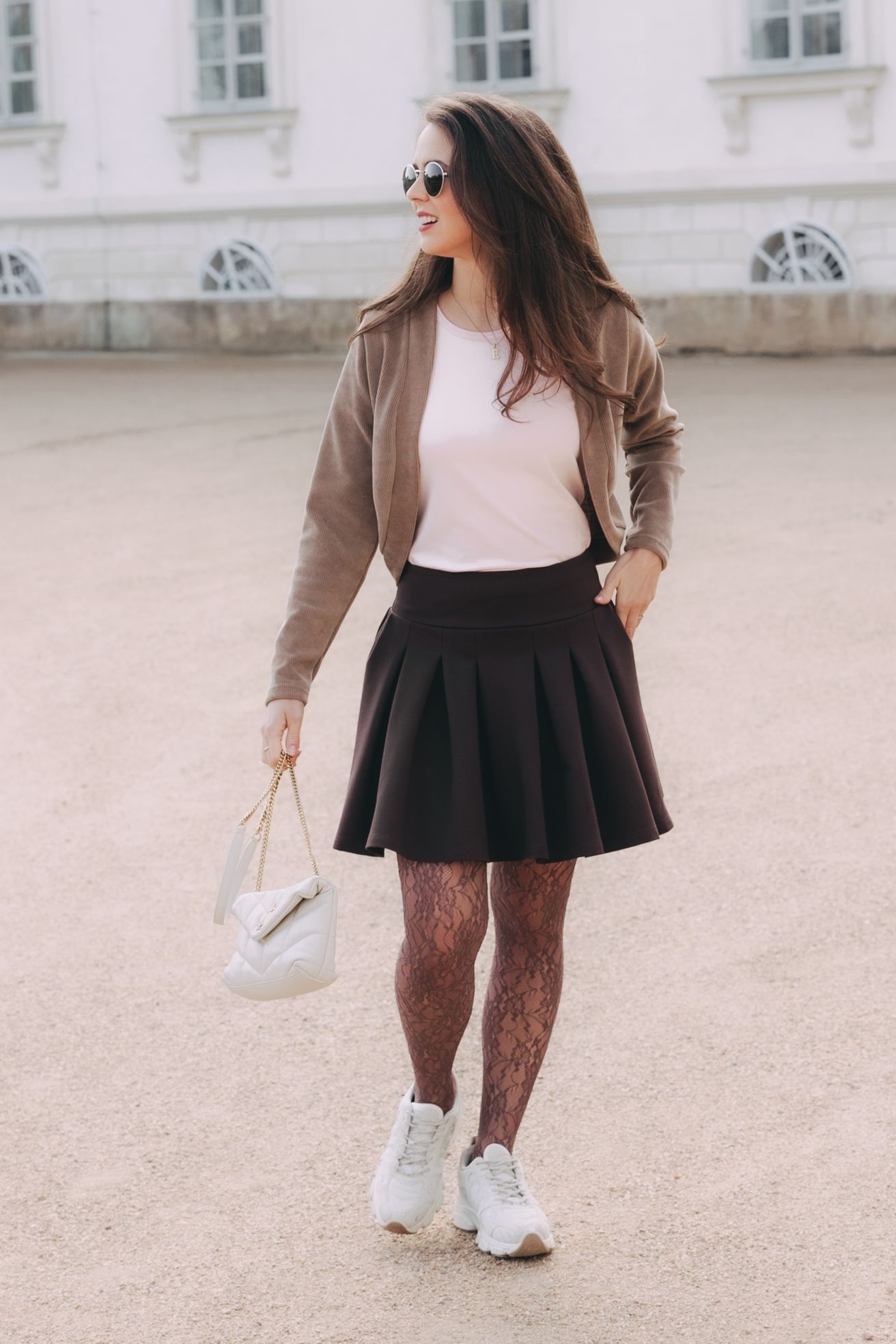 - Ležérně k sukni: Oblečte sáčko k sukni do pasu, přidejte jednoduché bílé tričko a oblíbené tenisky. Získáte uvolněný, a přitom nesmírně šik městský look.