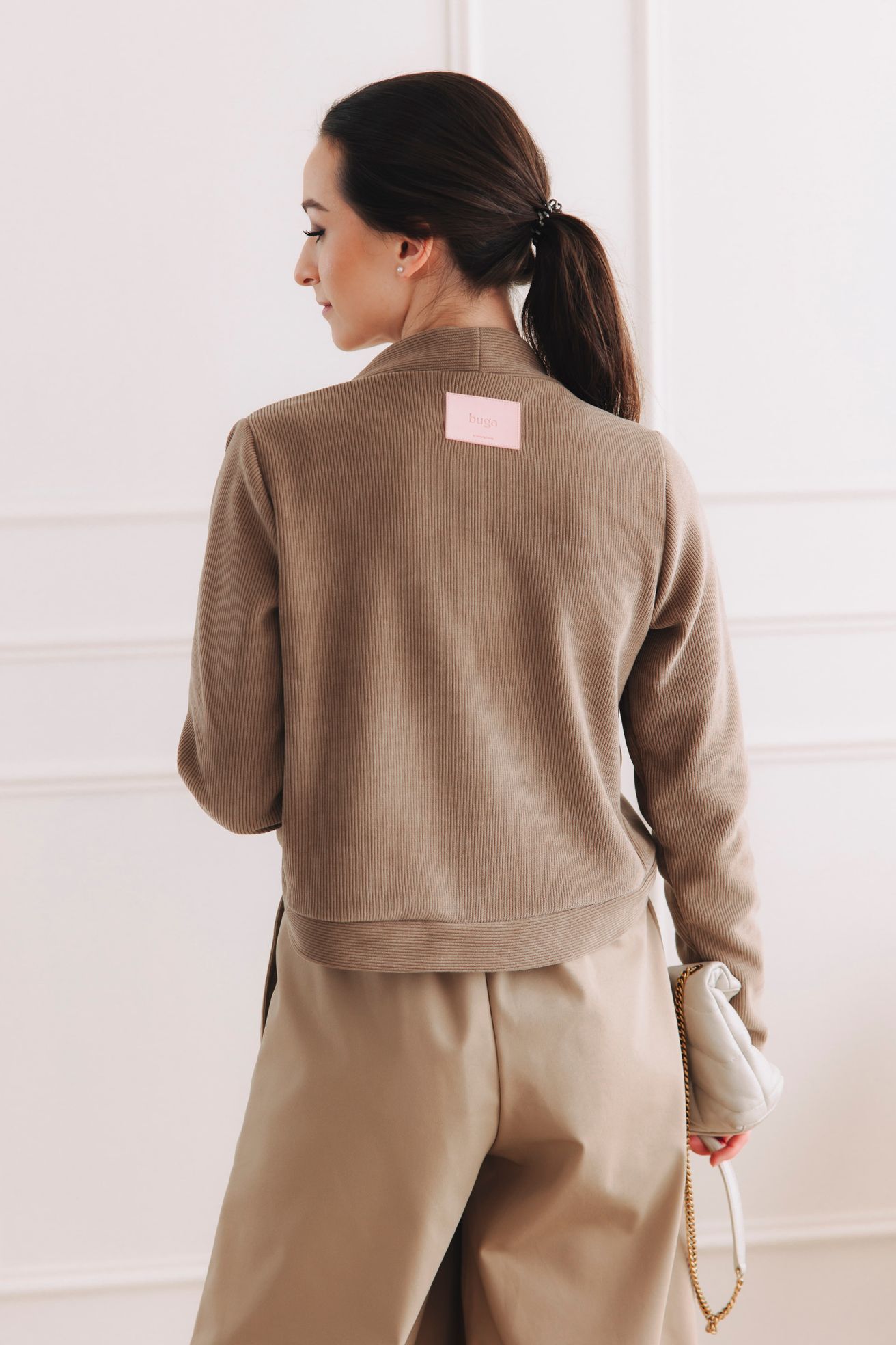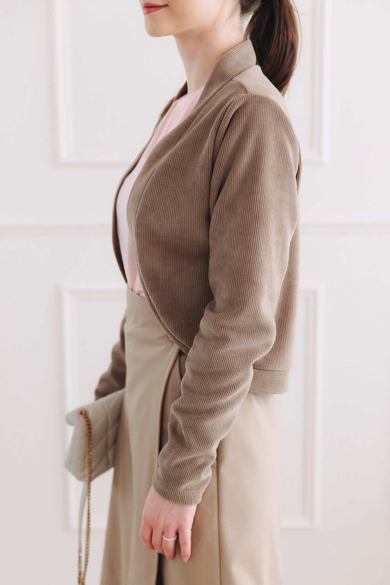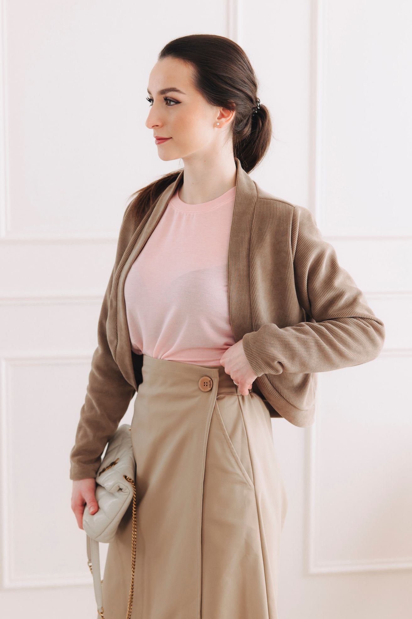 - Střih: Jabari jsme střihli a ušili jako krátké sako bez zapínání, které je v dolní části elegantně zaoblené. Tento střihový prvek postavu opticky zjemňuje, prodlužuje nohy a dává vyniknout pasu. Díky absenci ostrých hran sáčko působí velmi žensky a přirozeně kopíruje vaše křivky, ať už ho nosíte k čemukoli.