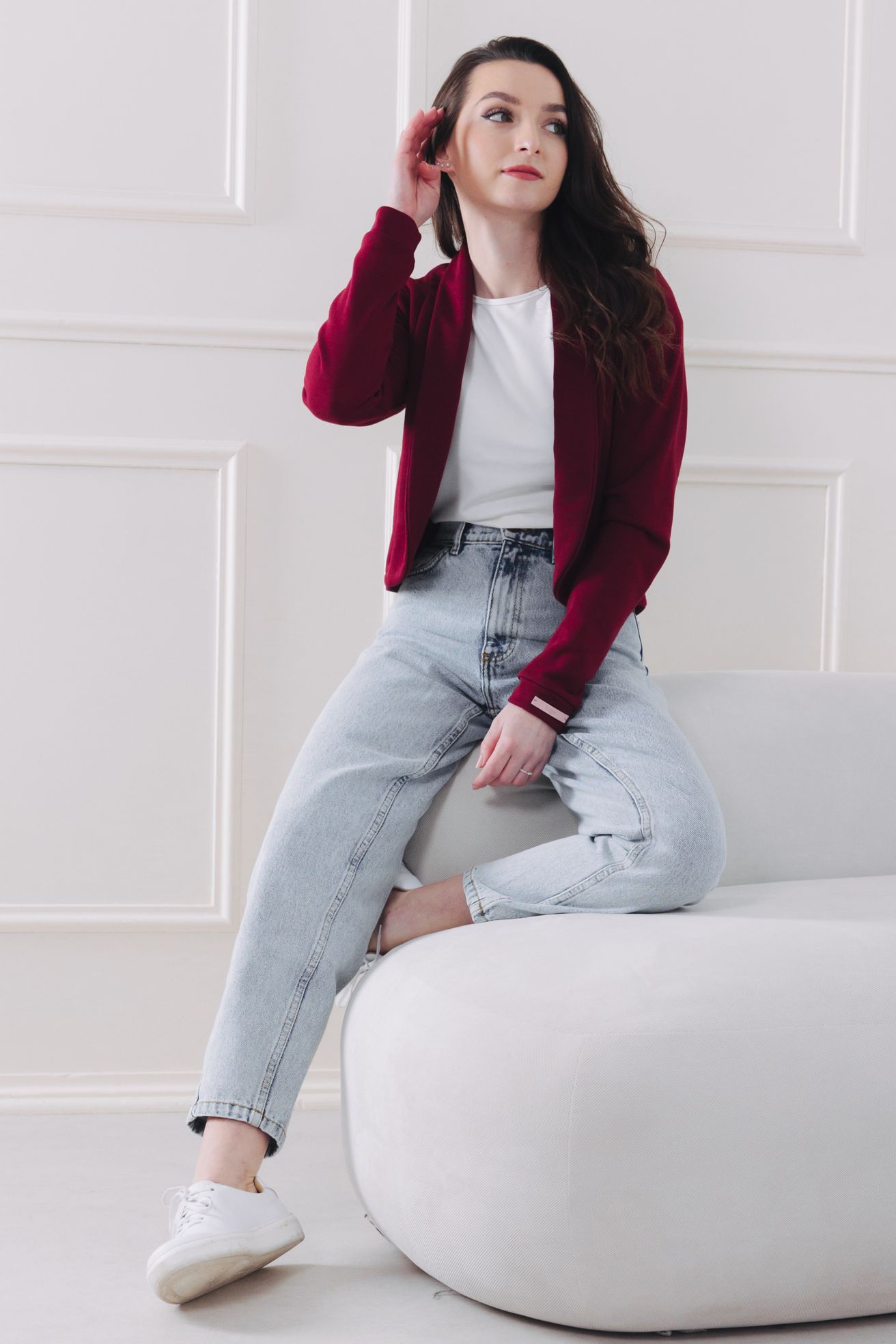Sáčko je dnes prostě stejně nepostradatelným kouskem jako príma mikča nebo příjemný svetřík. Bordo sáčko Tumia je kratší verzí oblíbeného saka Ania, takže to není jen pohodlnost, která je mu vlastní, ale i punc ležérnosti. Je přesně tou třešničkou na dortu, kterou váš minimalistický šatník hledal. Díky zkrácenému střihu a jemné tečkované struktuře dodá šmrnc každému outfitu, aniž byste musela obětovat svůj komfort. Je to zkrátka láska na první dotek i pohled.