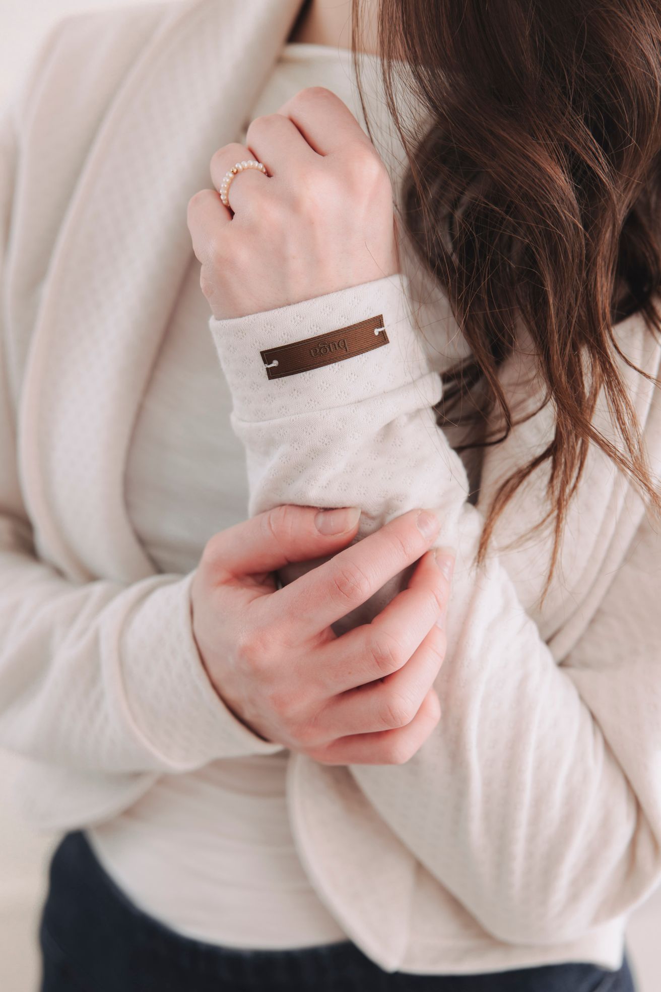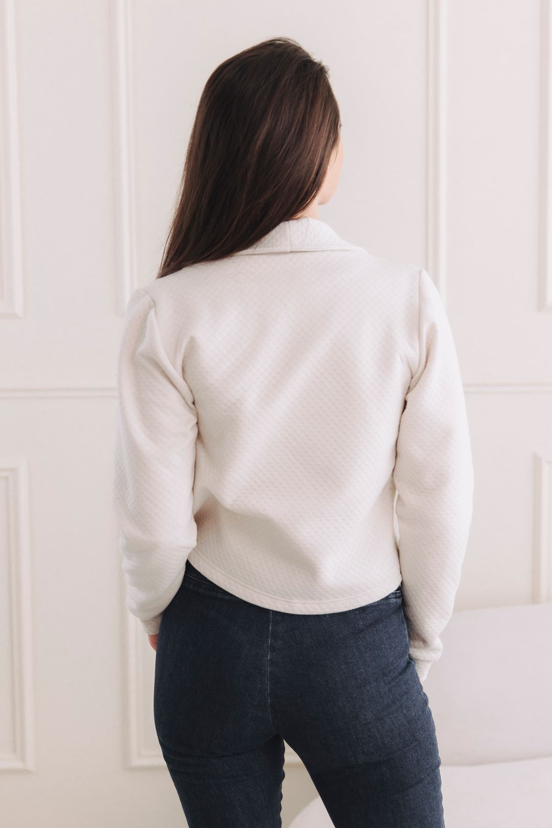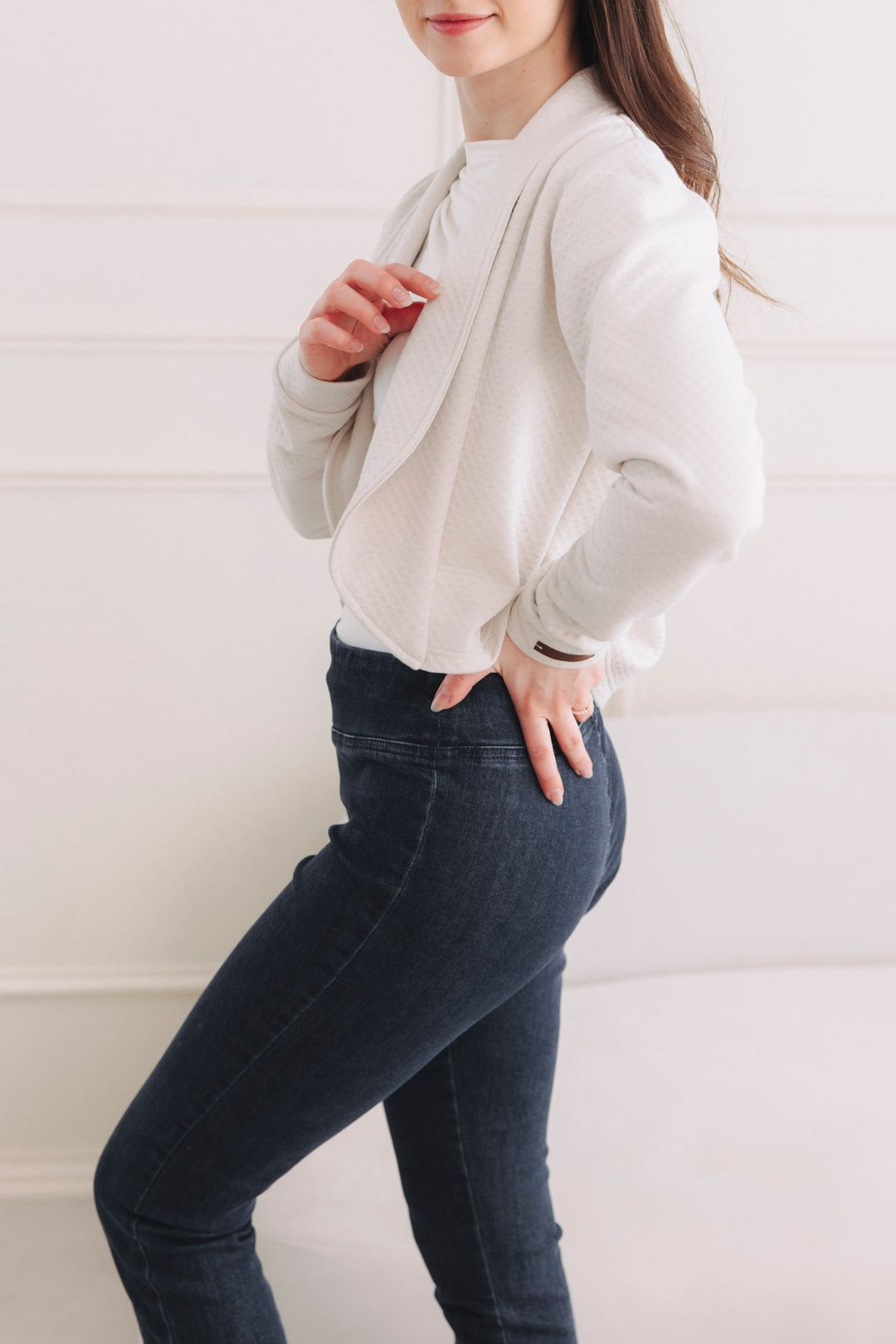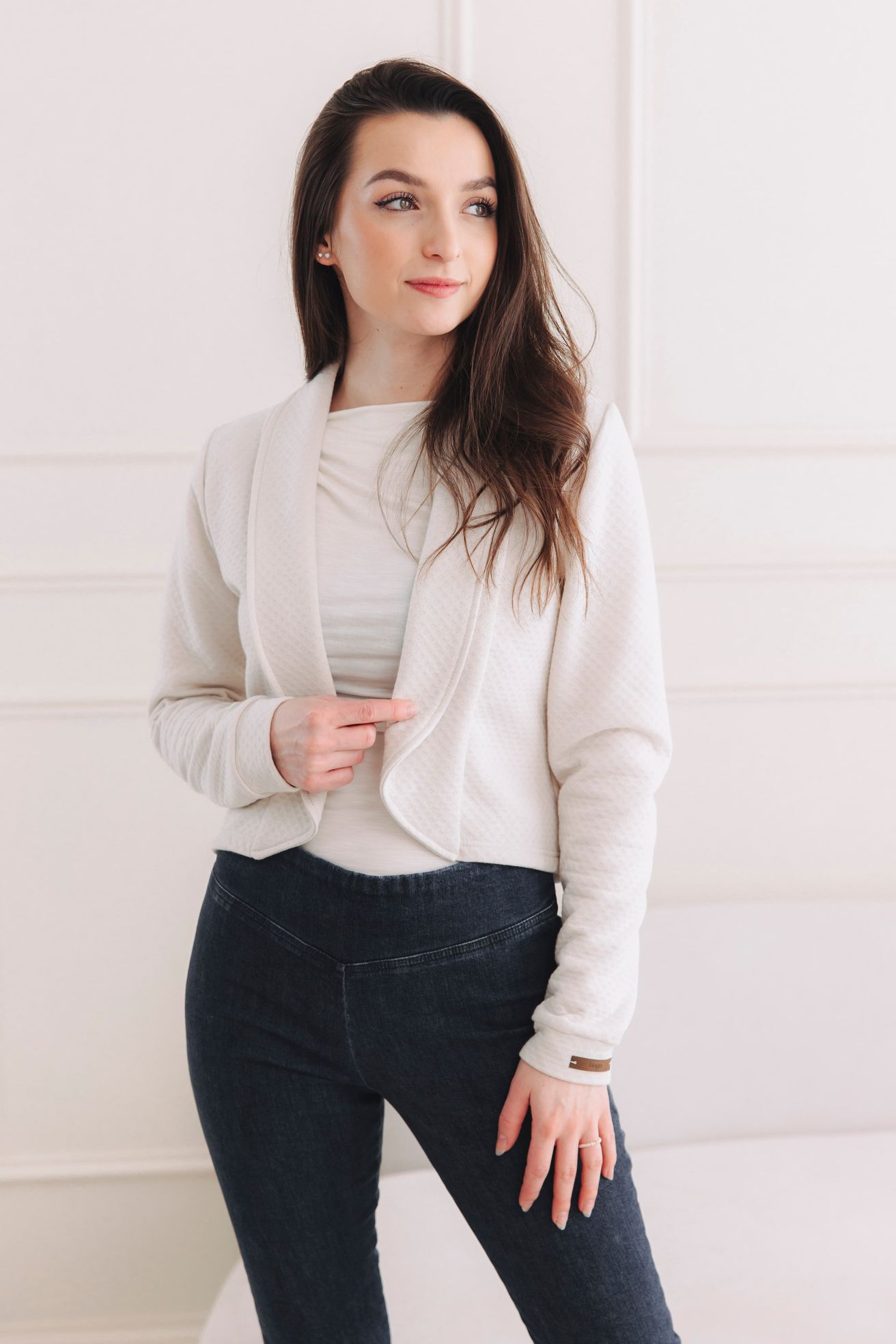 Tenhle kousek je navržen jako otevřené sako bez zapínání. Právě díky tomu krásně splývá, nepne přes hrudník a působí neuvěřitelně lehce a vzdušně – ideální pro vrstvení na trička i šaty.