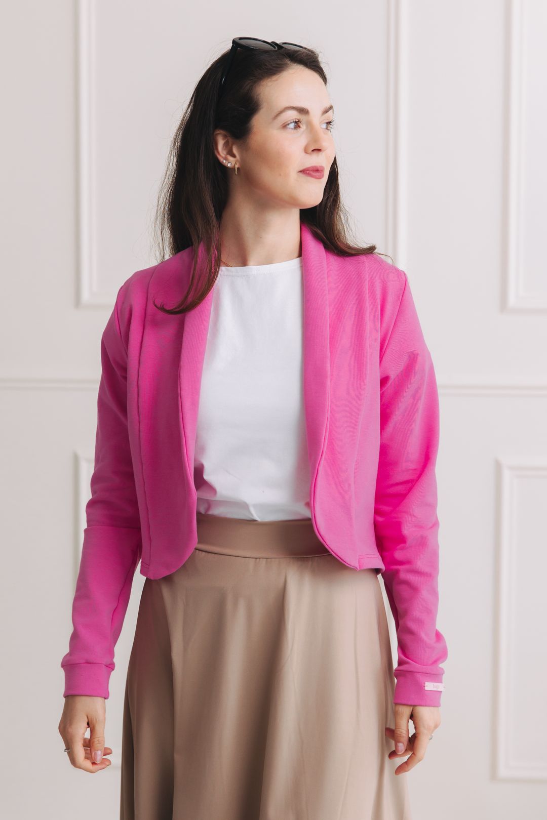 - Střih: Jeho zkrácená délka je ideální k sukním i kalhotám s vysokým pasem. Nechybí mu klasické klopy saka, což dodává celkovému vzhledu eleganci a šmrnc, i když je materiál měkký a pohodlný.