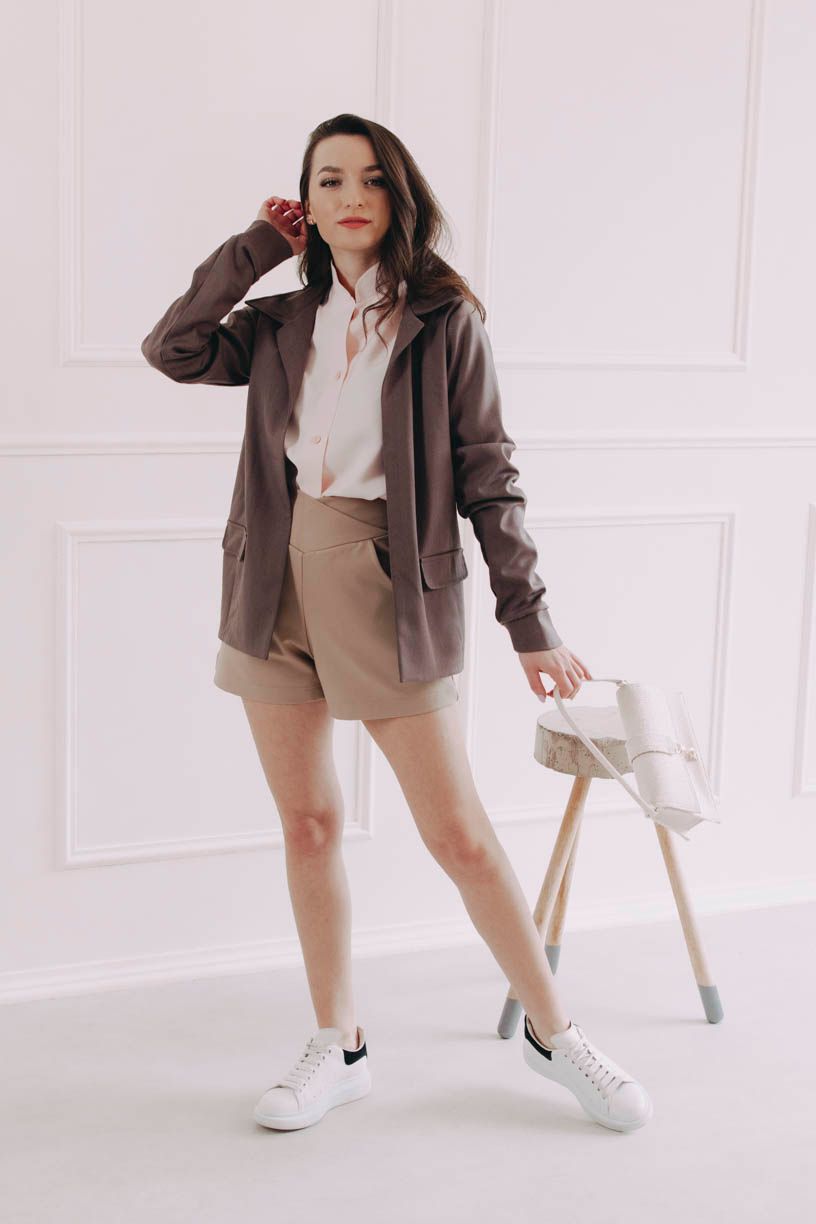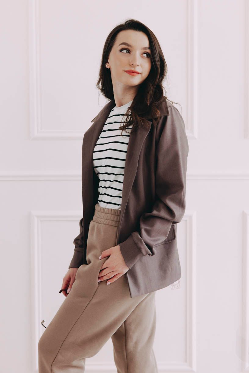 Střihově je Ikenna trošku kontrastní – klasická léga a klopa u fake kapsy jsou elegantními prvky, které naše Péťa sofistikovaně doplnila mocnými a tak trochu oversized rukávy.