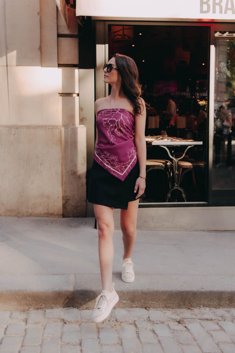Luxusní hedvábný šátek je must have každé ženy, která se inspiruje francouzskou módou. Přes ramena, kolem krku i jako top dokonale oživí každý outfit.