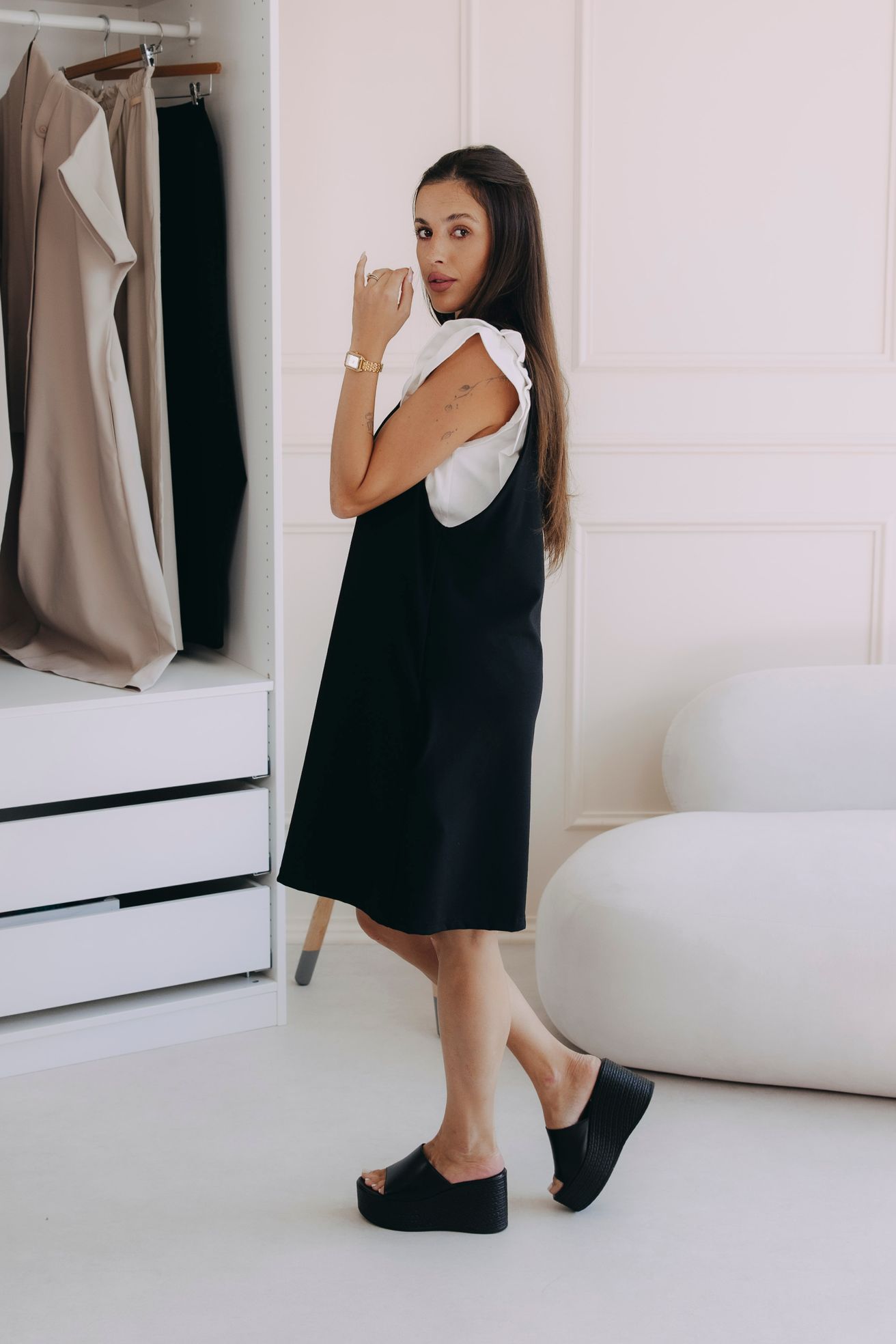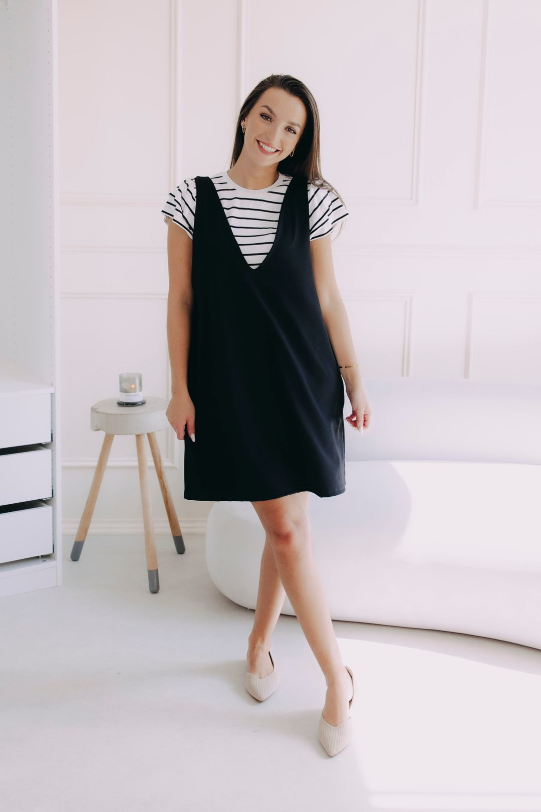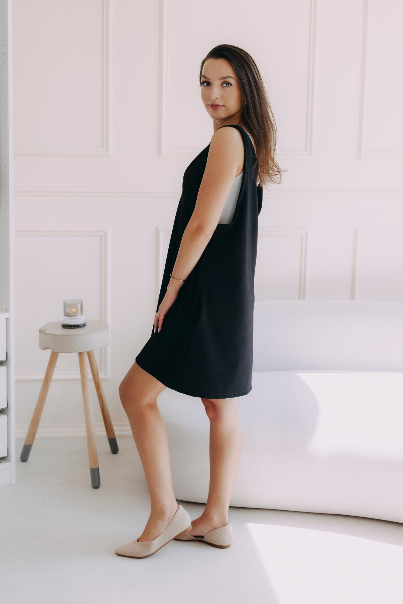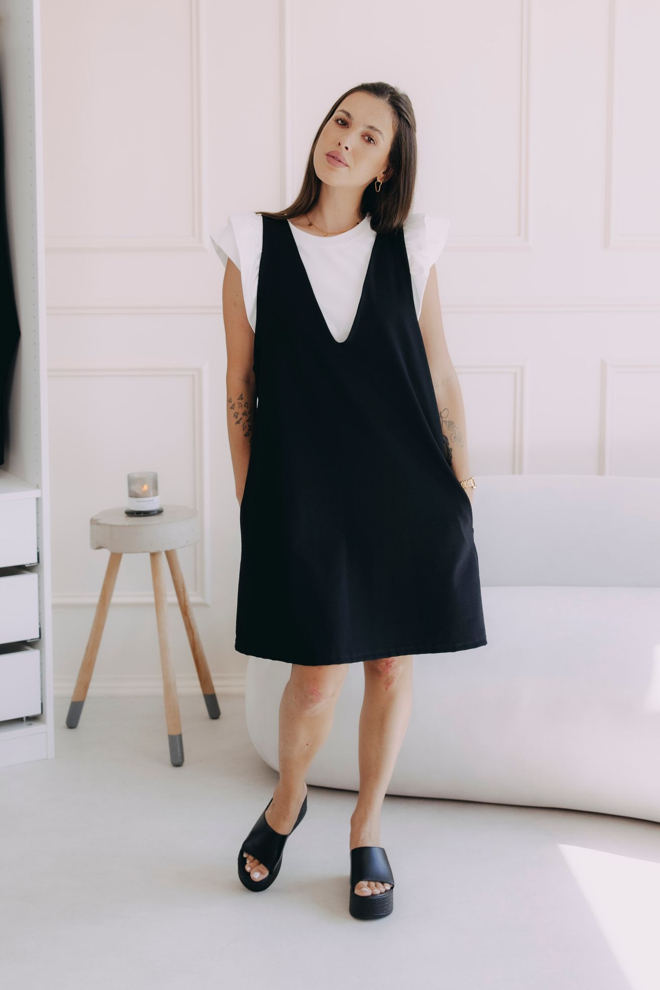 Lulama Black je esencí nadčasové elegance. Tato šatovka s minimalistickým střihem, hlubokým výstřihem a praktickými kapsami je spolehlivým základem pro váš kapsulový šatník.