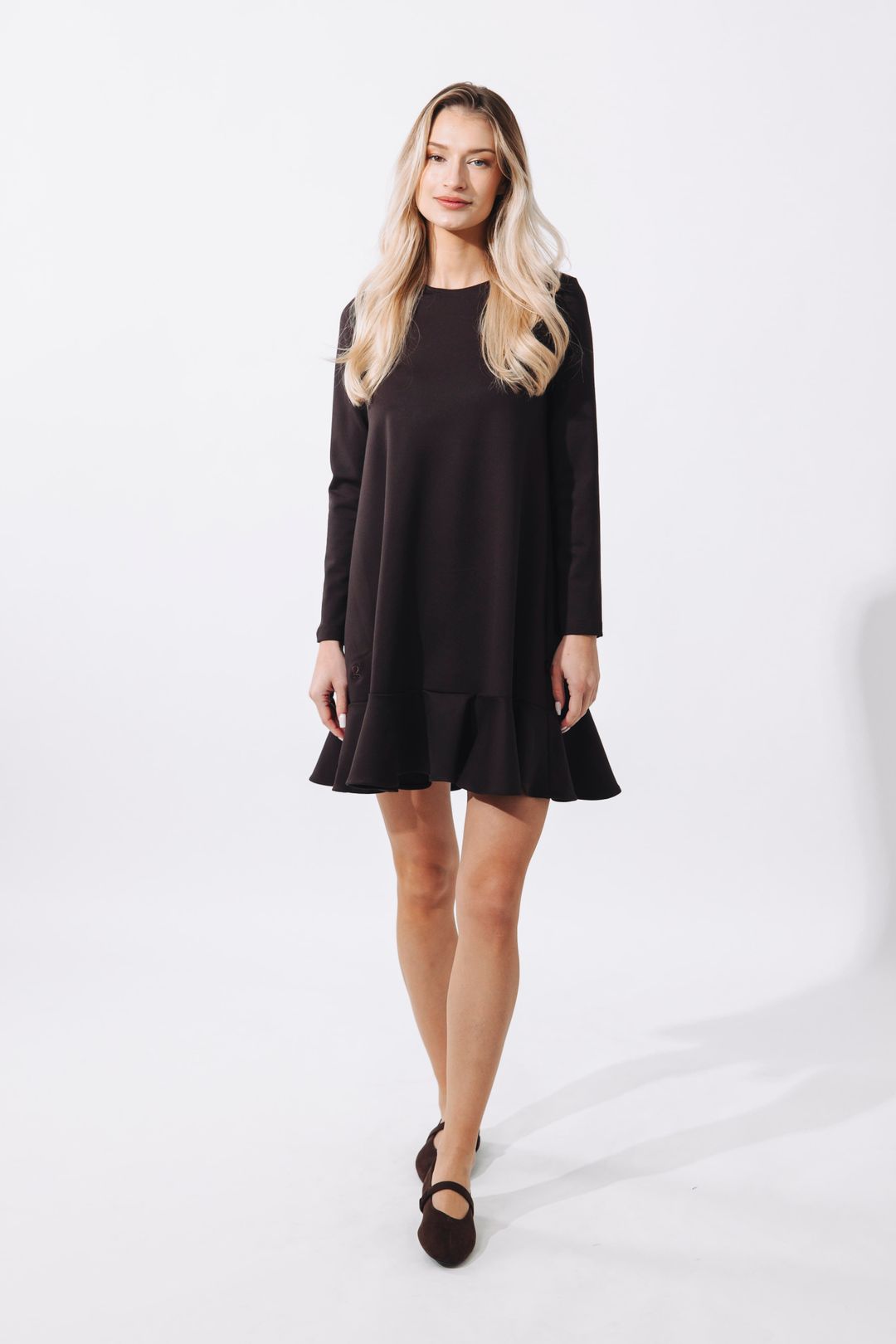 Když podzim zaklepe na dveře, není nic lepšího než obléci si něco, co zahřeje tělo i duši. Představujeme vám naše hnědé šaty s volánovou sukní, které mají jednu zvláštní schopnost – umí vykouzlit stejný úsměv jako váš první hrnek ranní kávy. Náhoda? Ale kdeže. Tyhle šaty jsou navrženy s nápadem a láskou, ušity v Čechách a prošité důrazem na každý detail. Výsledek? Model, ve kterém se budete cítit sebevědomě, svobodně a tak žensky, že byste se nejraději roztočila uprostřed parku a chytala paprsky slunce.
