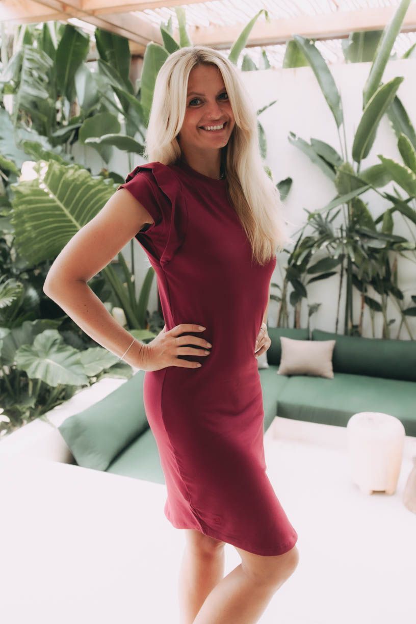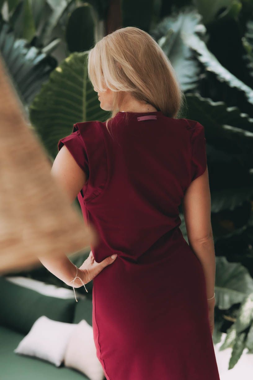 - Detaily rukávů: Místo klasických rukávů šaty zaujmou nápadným detailem v podobě navrstvených rukávů, které připomínají malé volánky. Dodávají šatům hravost a originalitu, aniž by ubíraly na eleganci.