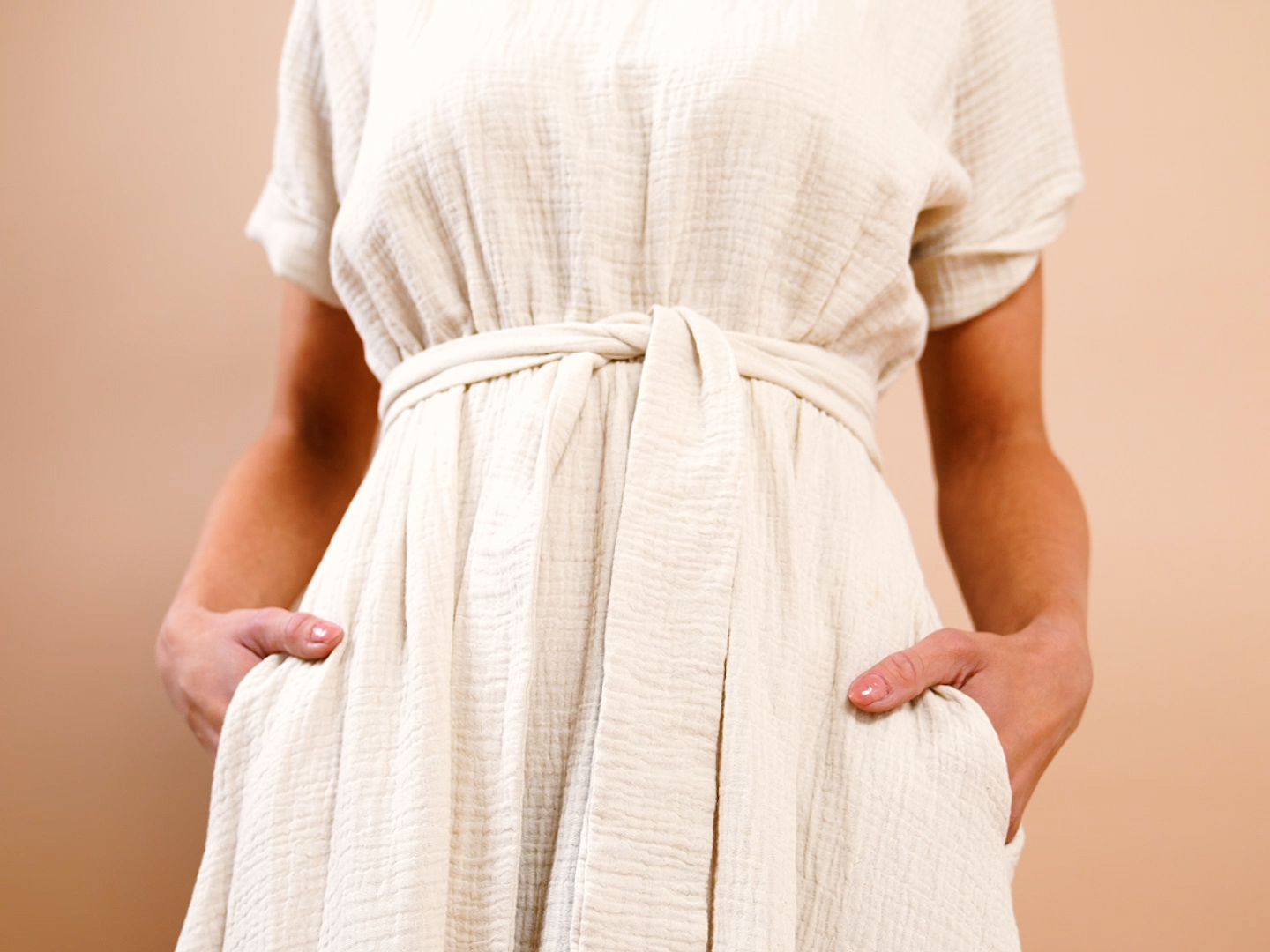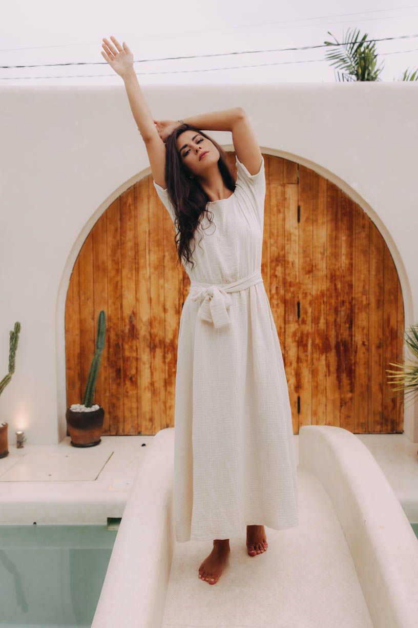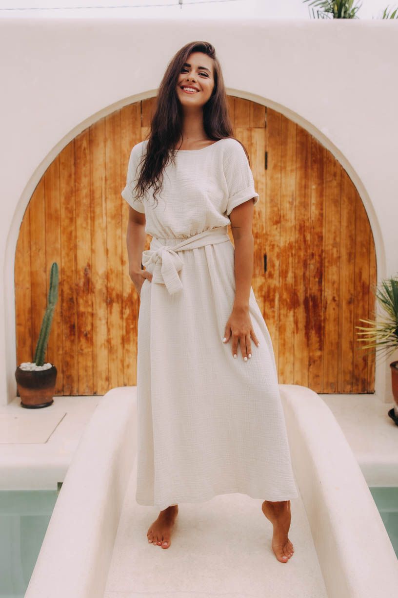 Šaty Boho mají příjemný volný střih, v pase decentní gumičku, kterou můžete ovázat látkovým opaskem, nápaditě řešené krátké rukávy a samozřejmě praktické kapsy. Kvalitní len s viskózou oceníte jak při celodenním nošení, tak i v parných dnech.