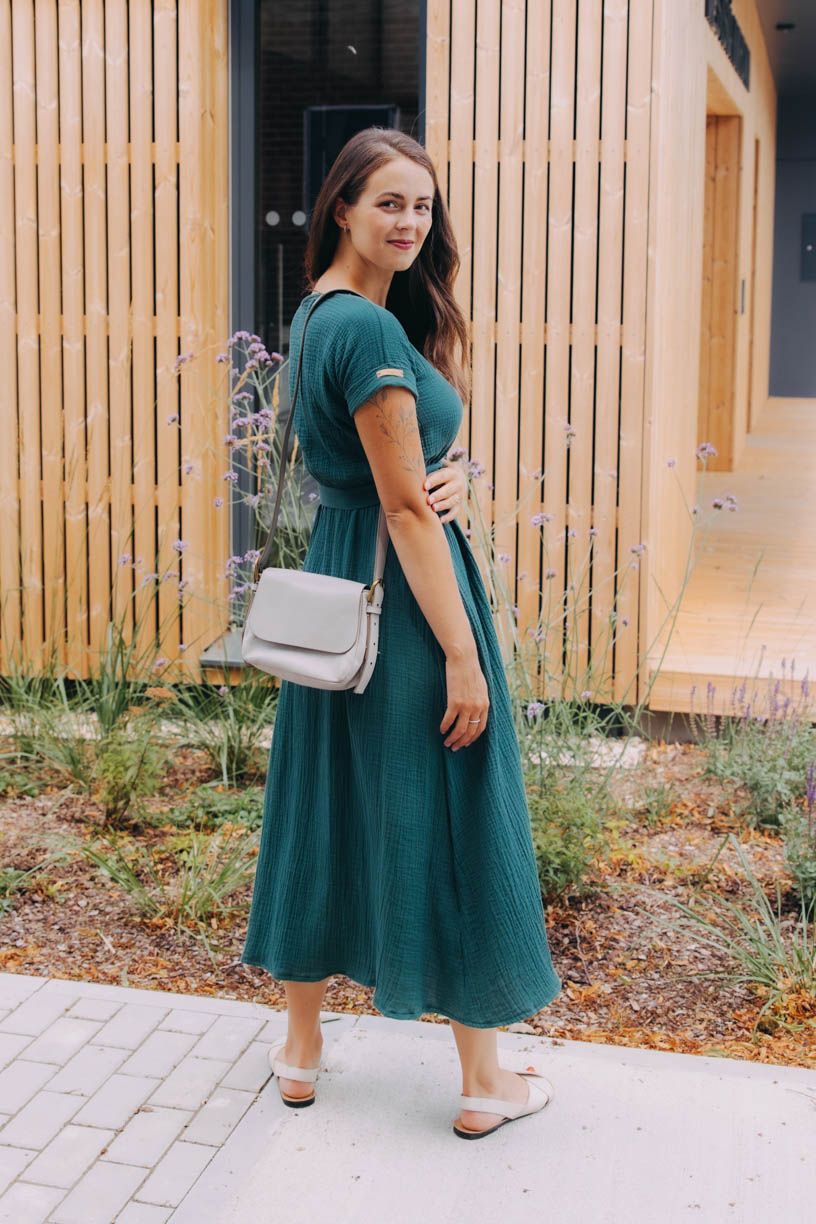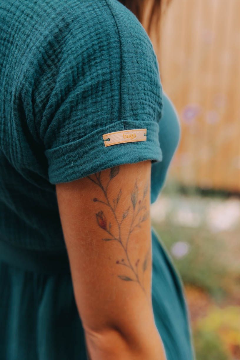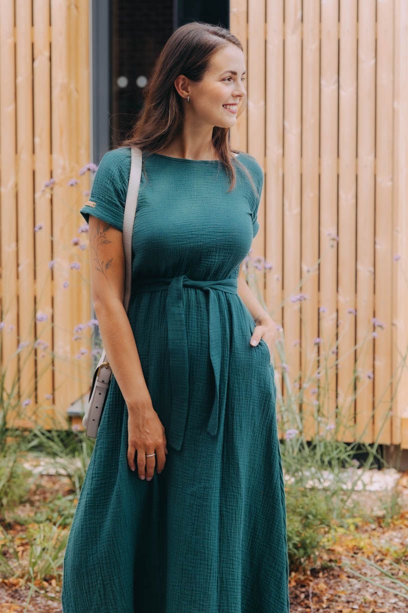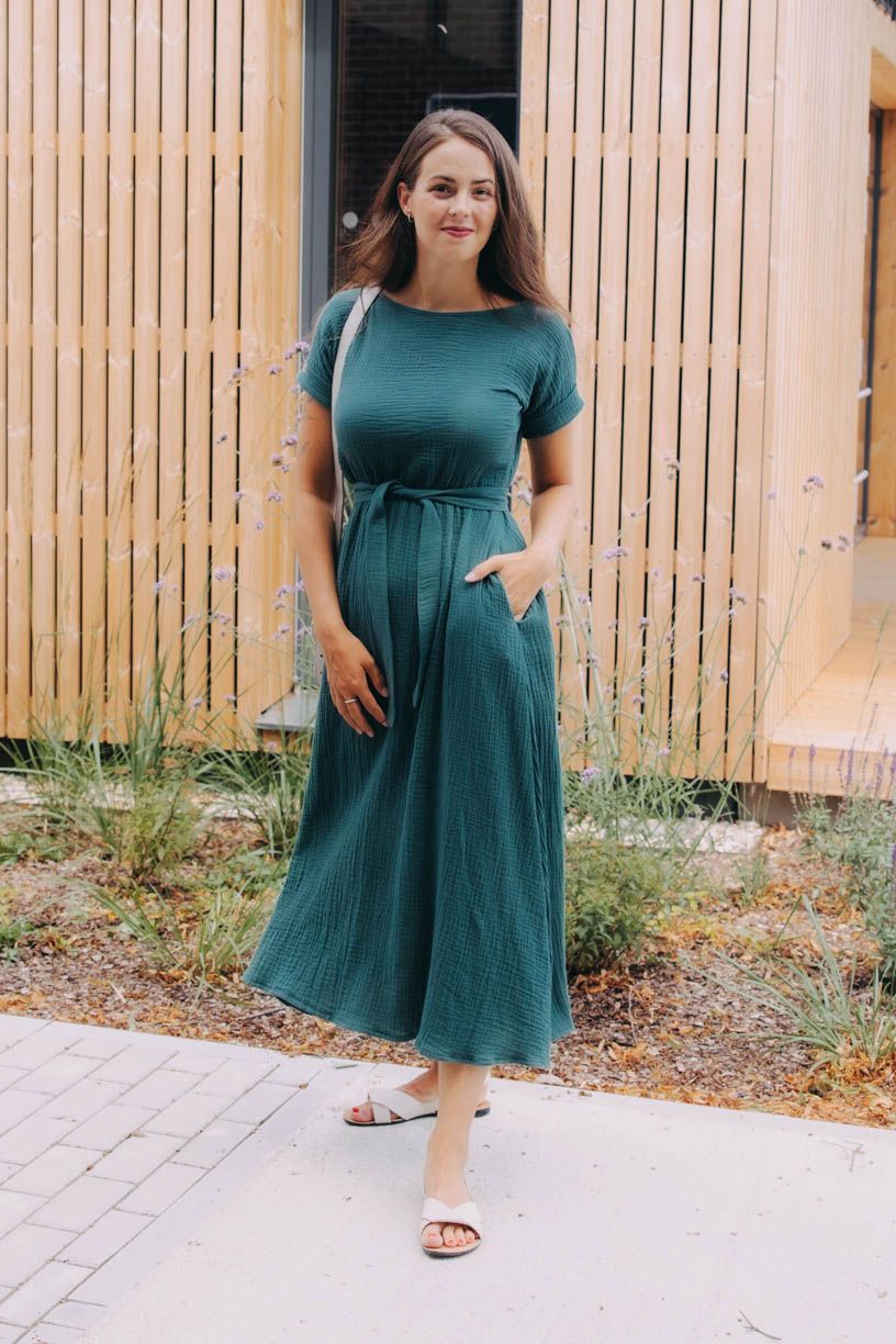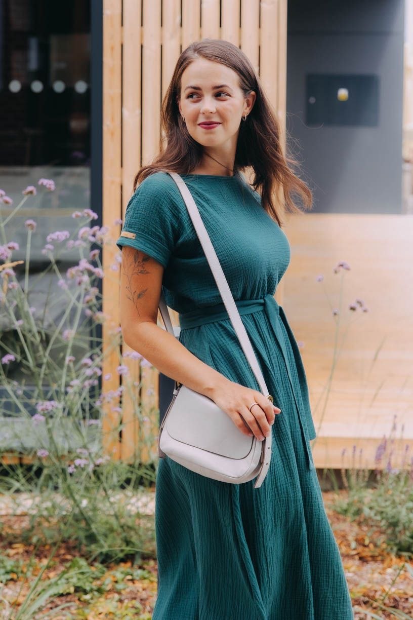 Šaty Boho mají příjemný volný střih, v pase decentní gumičku, kterou můžete ovázat látkovým opaskem, nápaditě řešené krátké rukávy a samozřejmě praktické kapsy. Kvalitní mušelín oceníte jak při celodenním nošení, tak i v parných dnech.