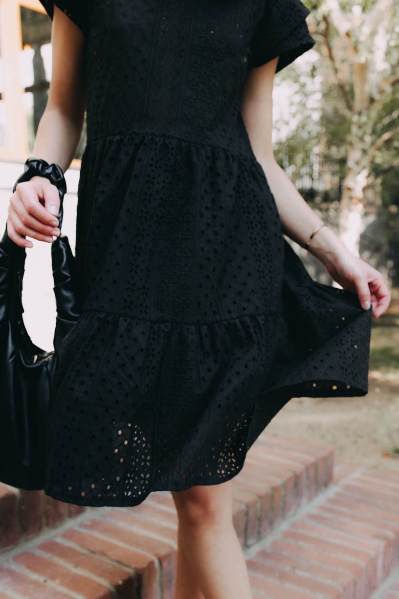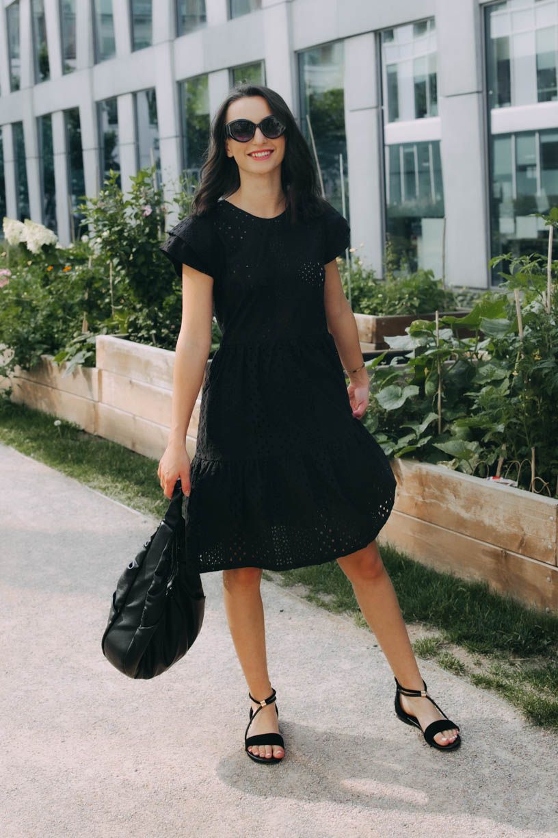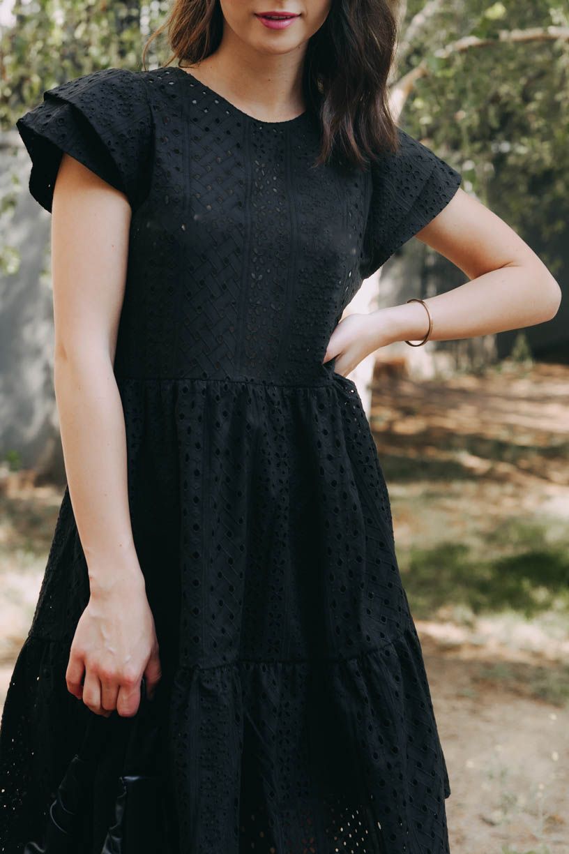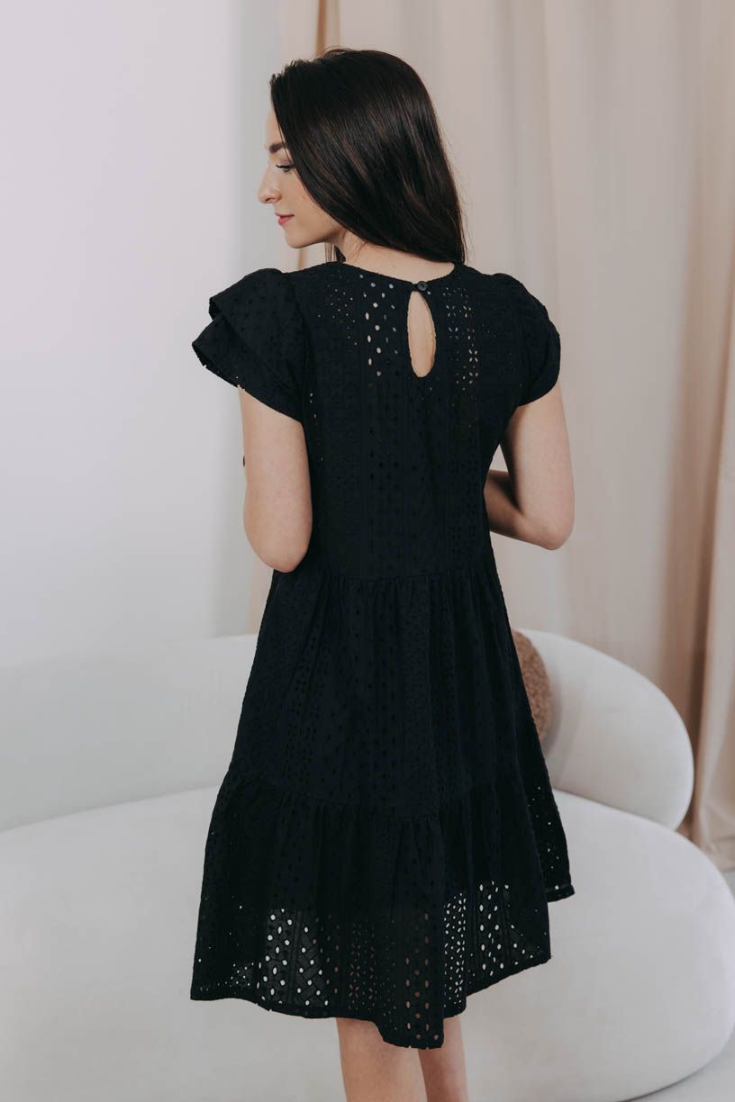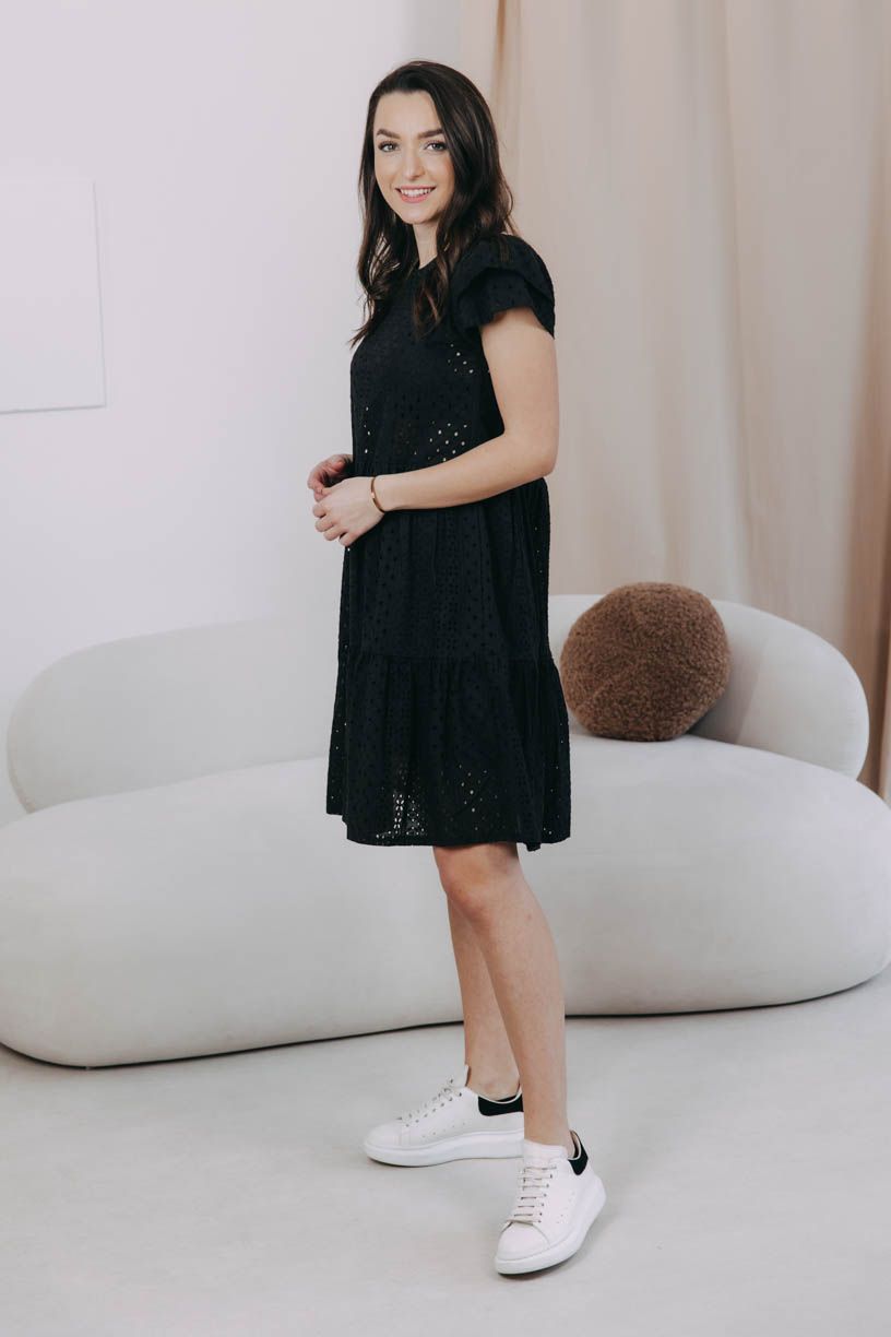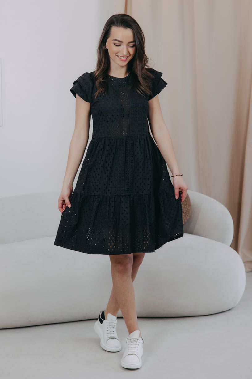 Černé volánové šaty Esme ušité z příjemné kytičkové madeiry jsou ideálním kouskem na vaše letní romantická dobrodružství.