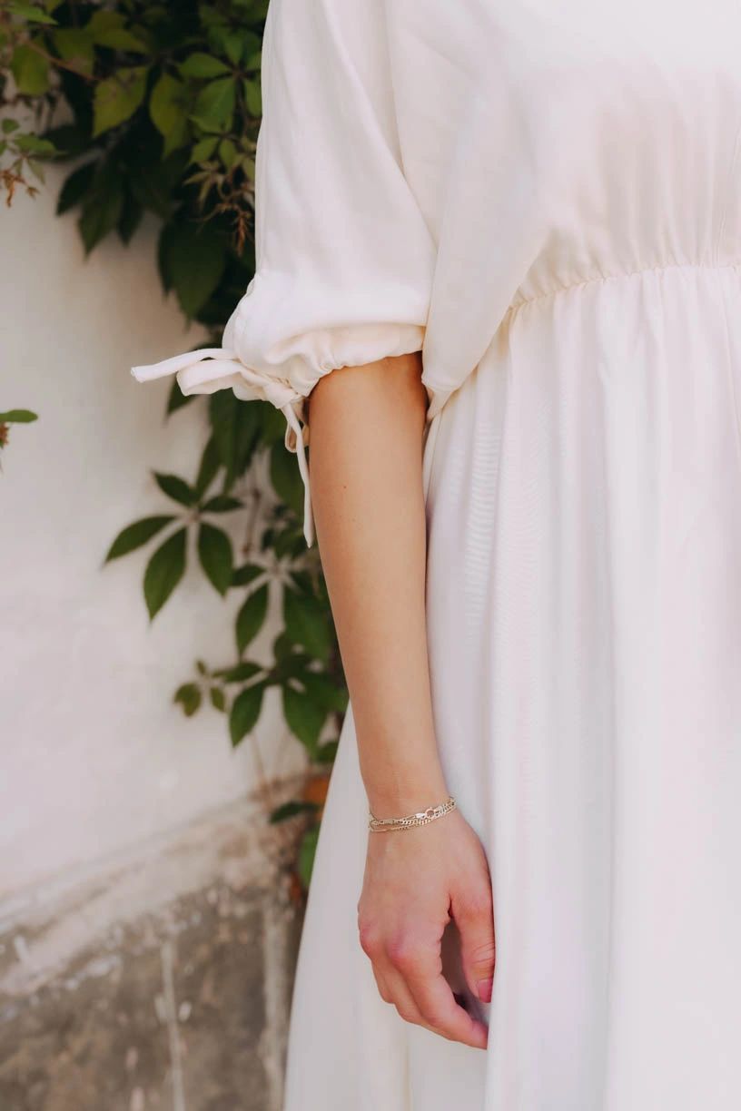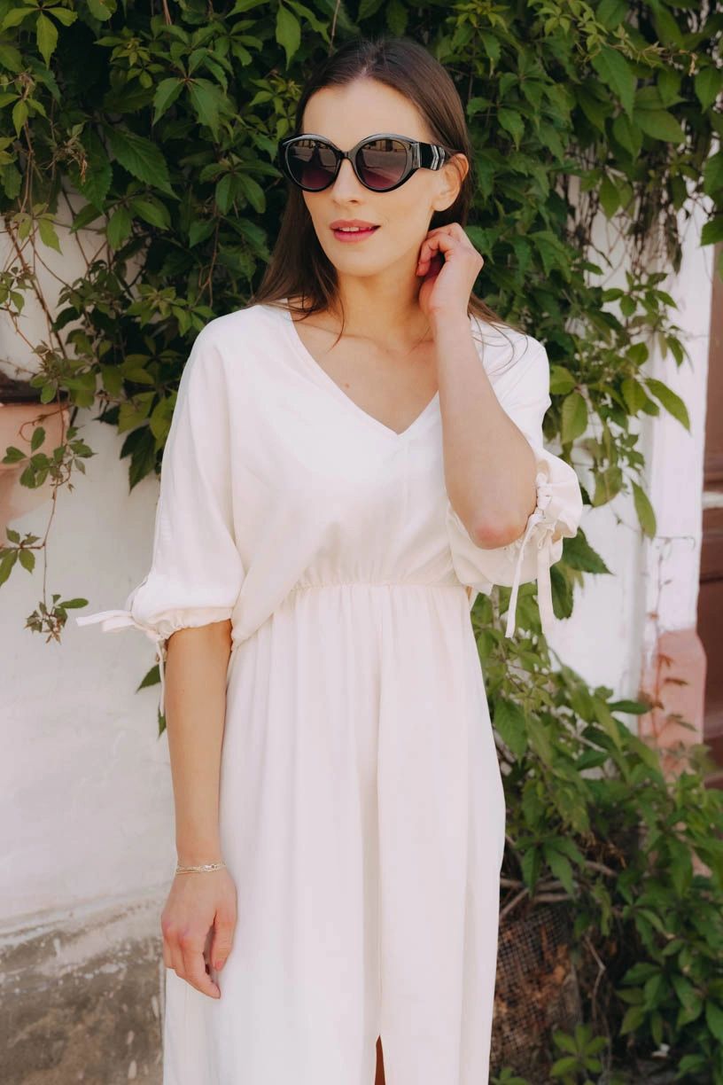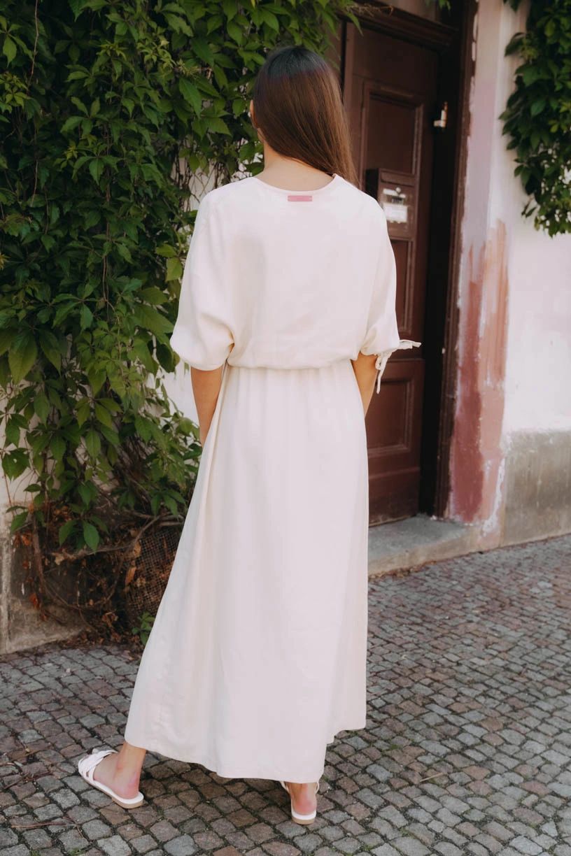 Véčkový výstřih dodává šatům sofistikovaný vzhled a zvýrazní vaši ženskost. Rukávy šatů se dají zavázat, což vám umožní přizpůsobit si je podle nálady – můžete je nosit volně pro ležérní vzhled, nebo s mašličkou či uzlíkem pro strukturovanější efekt. V pase je pružná guma, která jemně tvaruje vaši siluetu a zajišťuje pohodlné nošení během celého dne. Přední rozparek uprostřed dodává šatům šmrnc a eleganci, přičemž zajišťuje pohodlí při chůzi a volnost pohybu.