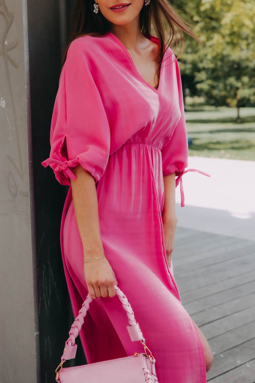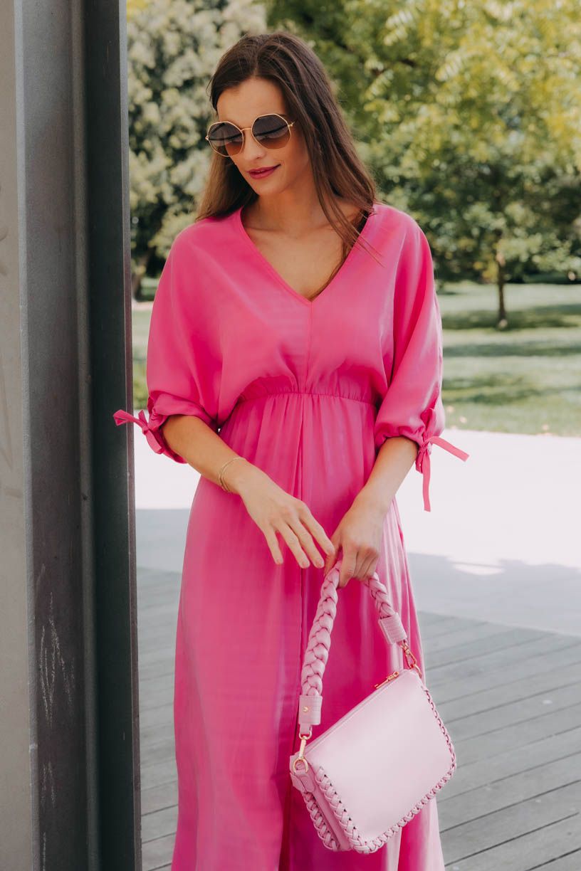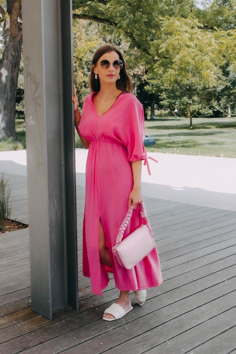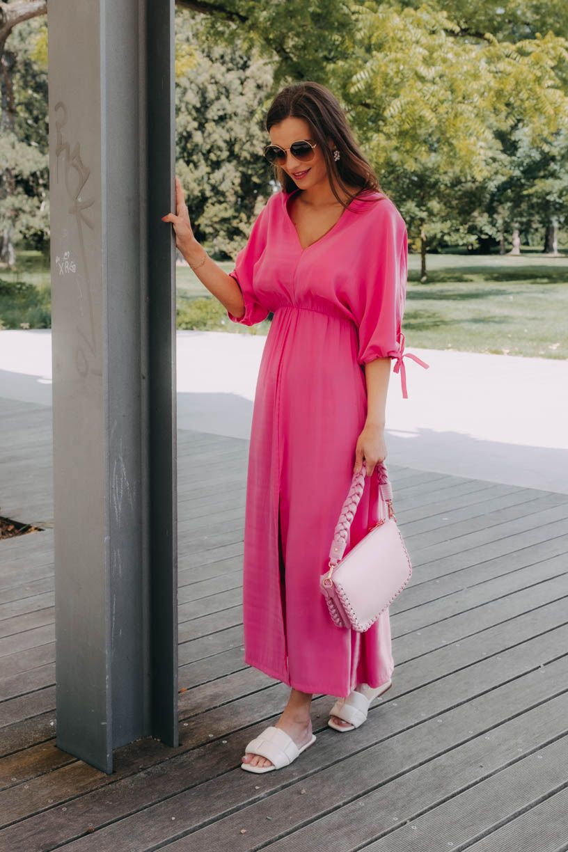 Véčkový výstřih dodává šatům sofistikovaný vzhled a zvýrazní vaši ženskost. Rukávy šatů se dají zavázat, což vám umožní přizpůsobit si je podle nálady – můžete je nosit volně pro ležérní vzhled, nebo s mašličkou či uzlíkem pro strukturovanější efekt. V pase je pružná guma, která jemně tvaruje vaši siluetu a zajišťuje pohodlné nošení během celého dne. Přední rozparek uprostřed dodává šatům šmrnc a eleganci, přičemž zajišťuje pohodlí při chůzi a volnost pohybu.