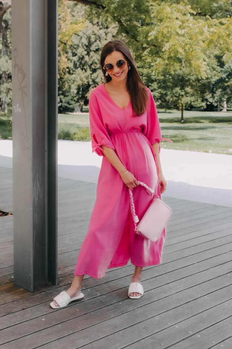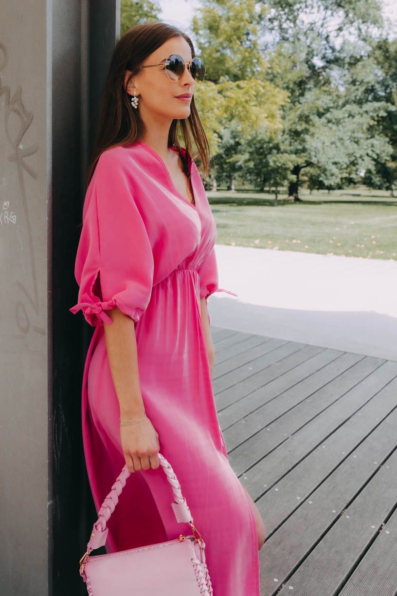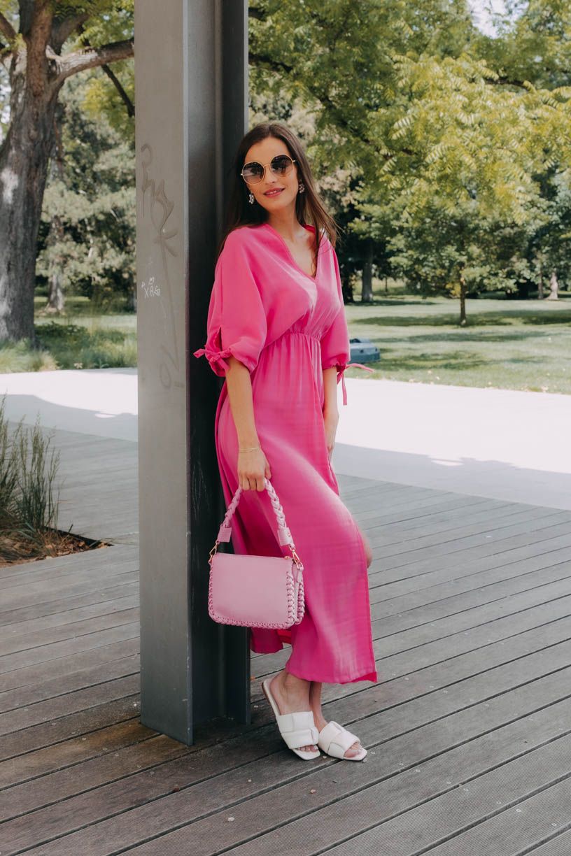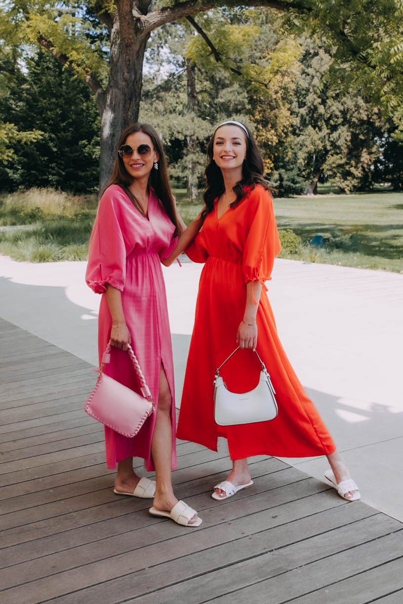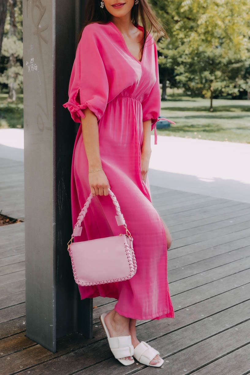 Véčkový výstřih dodává šatům sofistikovaný vzhled a zvýrazní vaši ženskost. Rukávy šatů se dají zavázat, což vám umožní přizpůsobit si je podle nálady – můžete je nosit volně pro ležérní vzhled, nebo s mašličkou či uzlíkem pro strukturovanější efekt. V pase je pružná guma, která jemně tvaruje vaši siluetu a zajišťuje pohodlné nošení během celého dne. Přední rozparek uprostřed dodává šatům šmrnc a eleganci, přičemž zajišťuje pohodlí při chůzi a volnost pohybu.