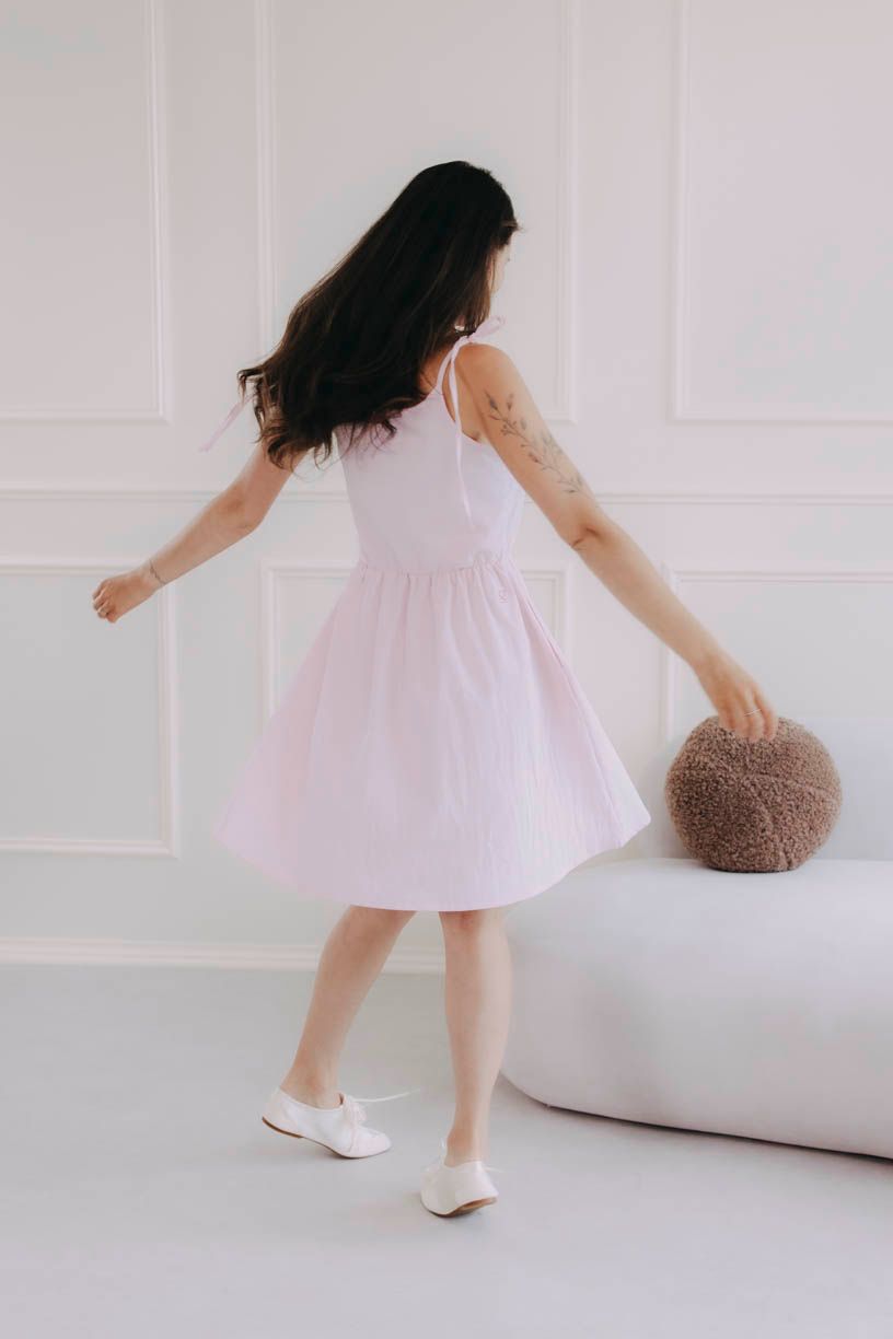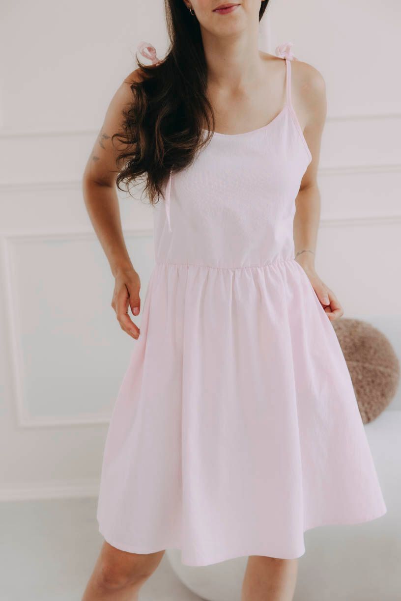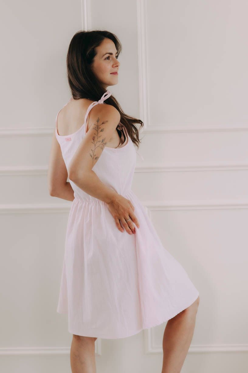 Šaty Imani ztělesňují něžnou krásu, lehkost a pohodlí v každém kroku. Jsou důkazem, že v jednoduchosti je síla. Úzká ramínka na zavazování jim dodávají hravost a dívčí rozvernost. Příjemná bavlna, pružné řasení v pase a áčková sukně zajišťují maximální pohodlí i volnost pohybu. Délka těsně nad kolena decentně odhalí nohy, aniž by bylo potřeba se neustále hlídat.