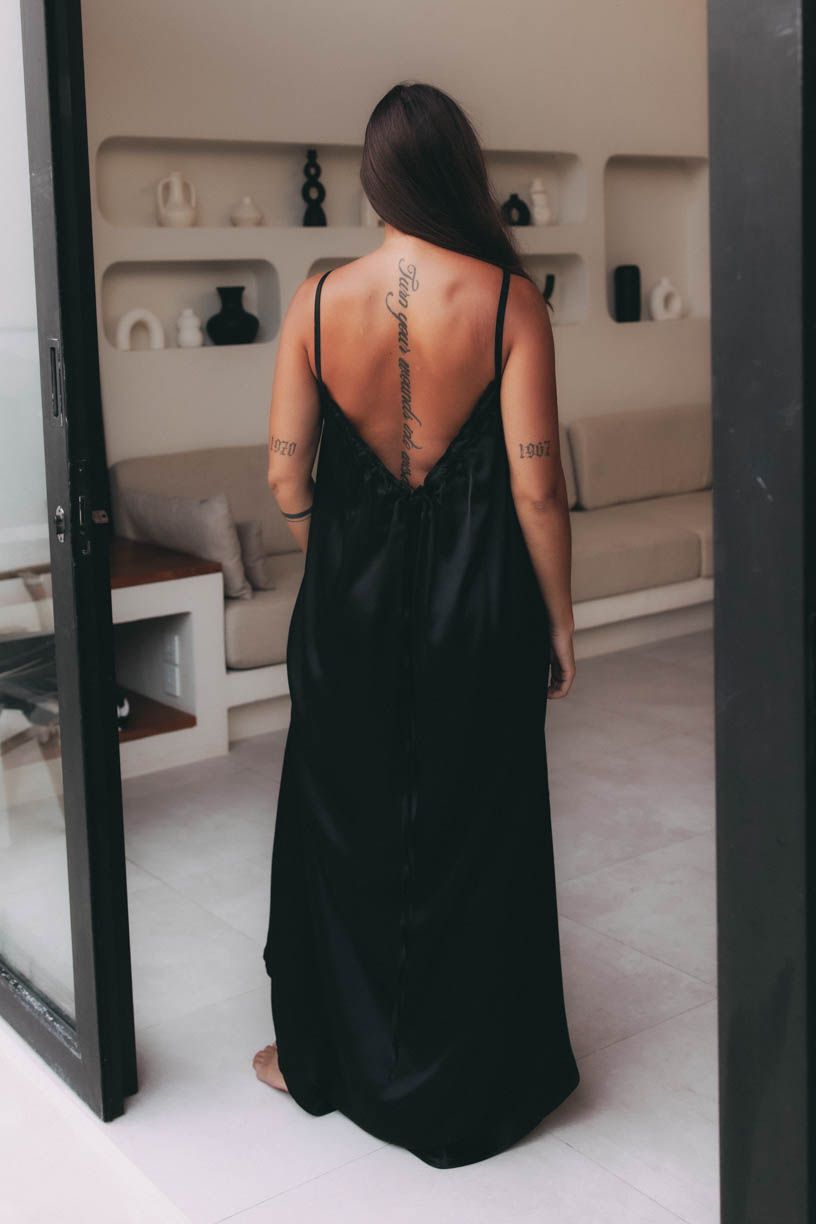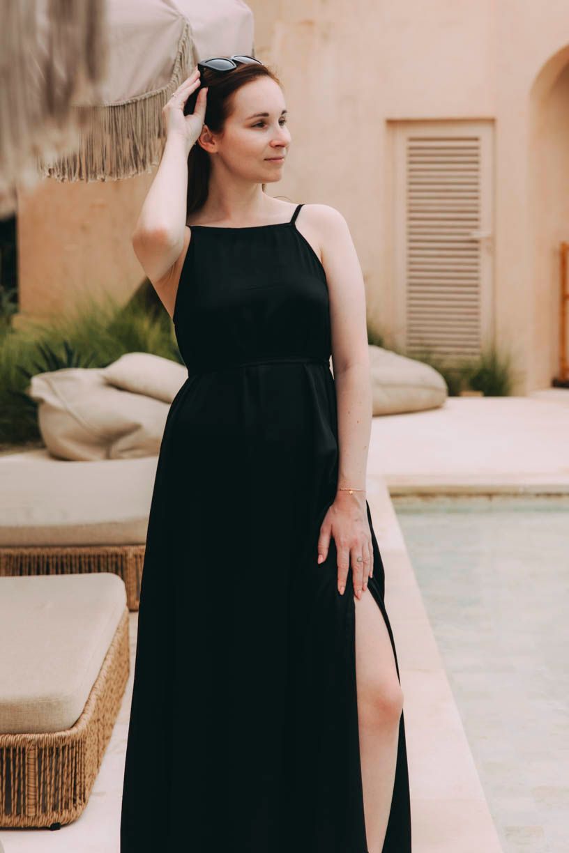 - Střih: Šaty jsou dlouhé až na zem, ale lehké a vzdušné. Jednoduchého střihu, a přitom prudce sofistikované. Decentní, a přesto velmi sexy. Rozparek ke koleni je tak akorát. Pohrajte si se šňůrkou a vytvářejte celou řadu nápaditých outfitů. Ponechte odhalená záda àla víla, anebo ji ovažte kolem pasu a zdůrazněte svou ženskou siluetu.