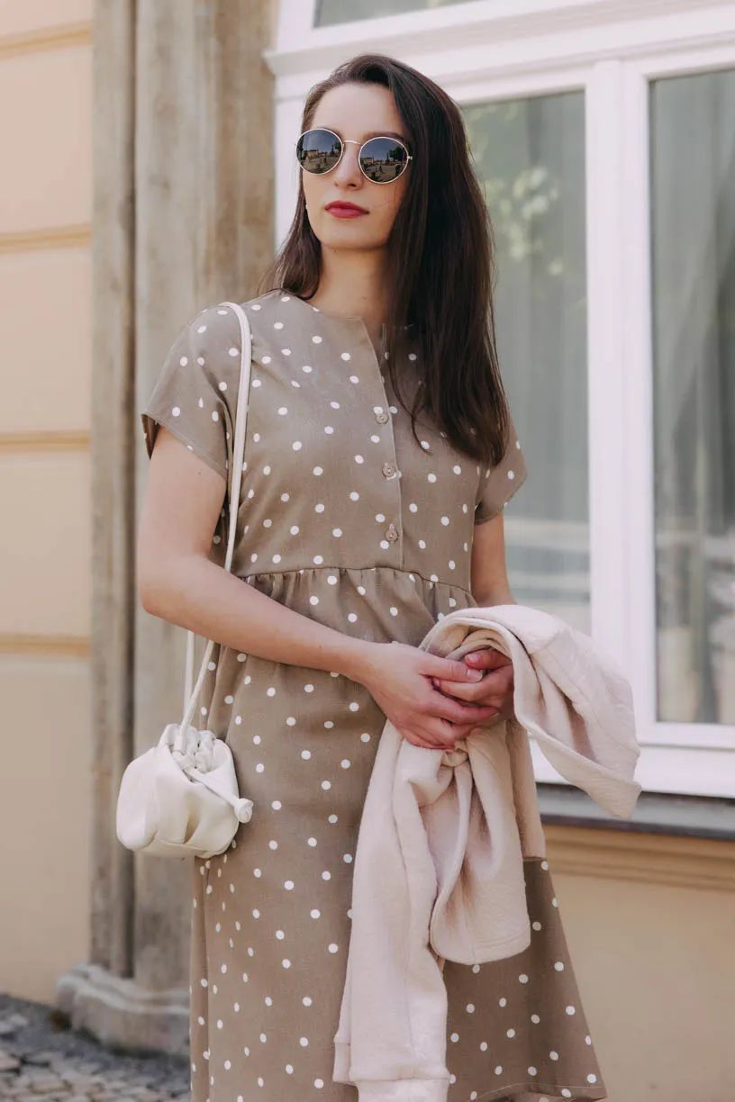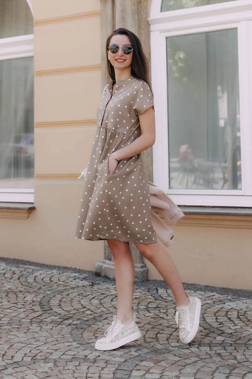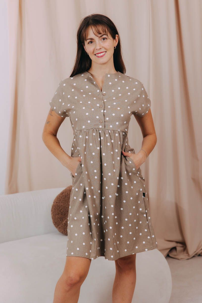 Vzdušnou viskózu oceníte stejně jako volný střih hlavně v teplých dnech. Šaty jsou prostřižené pod prsy, volně padají až nad kolena. Šikovně zakryjí i větší bříško či širší boky. Stihly se osvědčit mezi maminkami, které si pochvalují rozepínací horní díl na kojení.