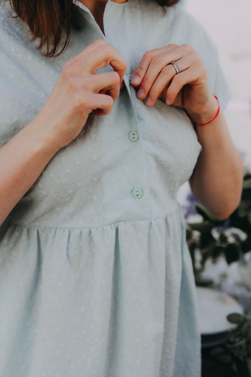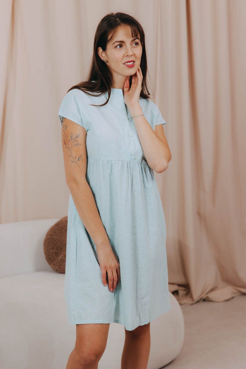 Vzdušnou bavlnu oceníte stejně jako volný střih hlavně v teplých dnech. Šaty jsou prostřižené pod prsy a volně padají až nad kolena. Šikovně zakryjí i větší bříško či širší boky. Stihly se osvědčit mezi maminkami, které si pochvalují rozepínací horní díl na kojení.
