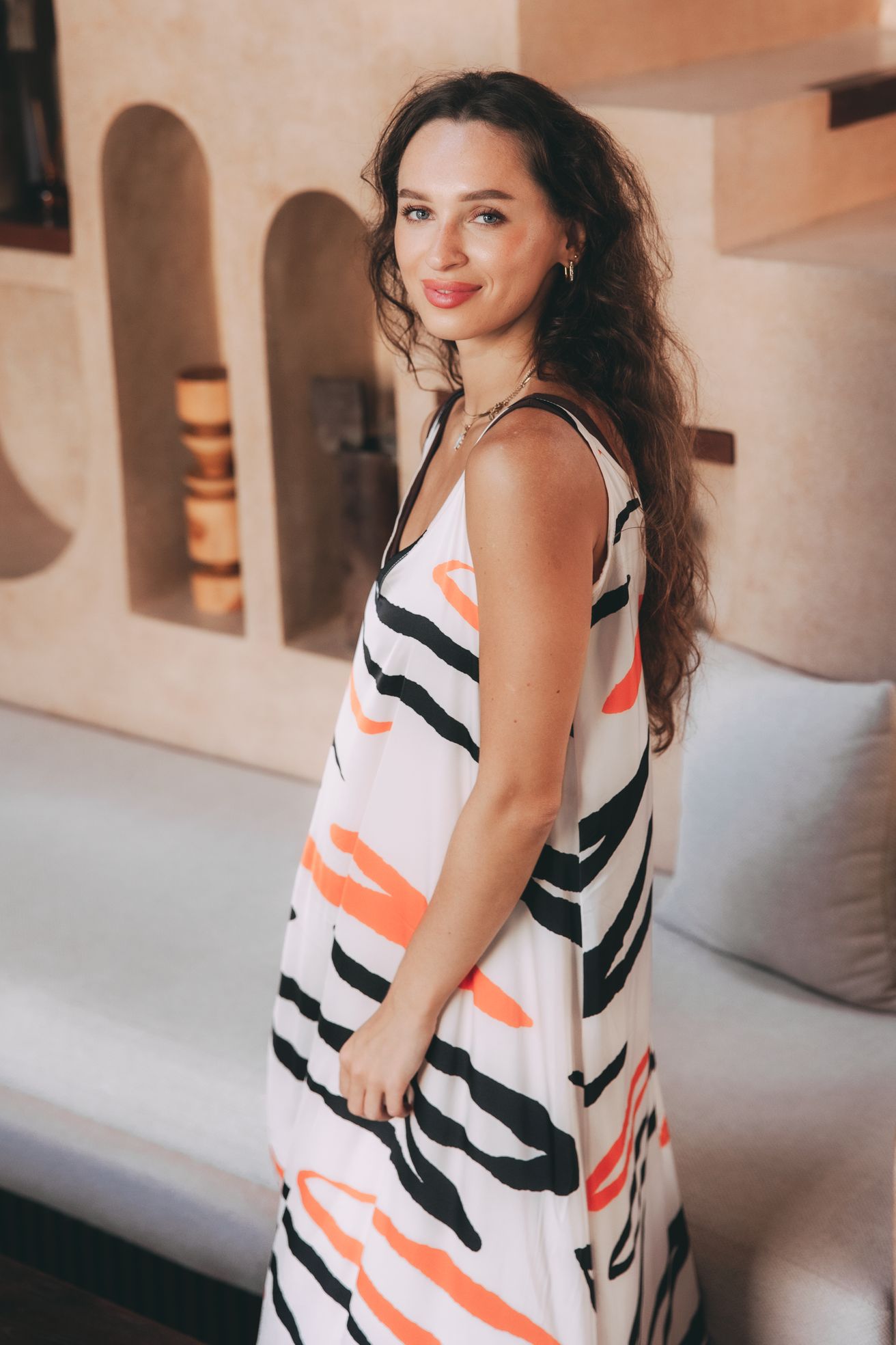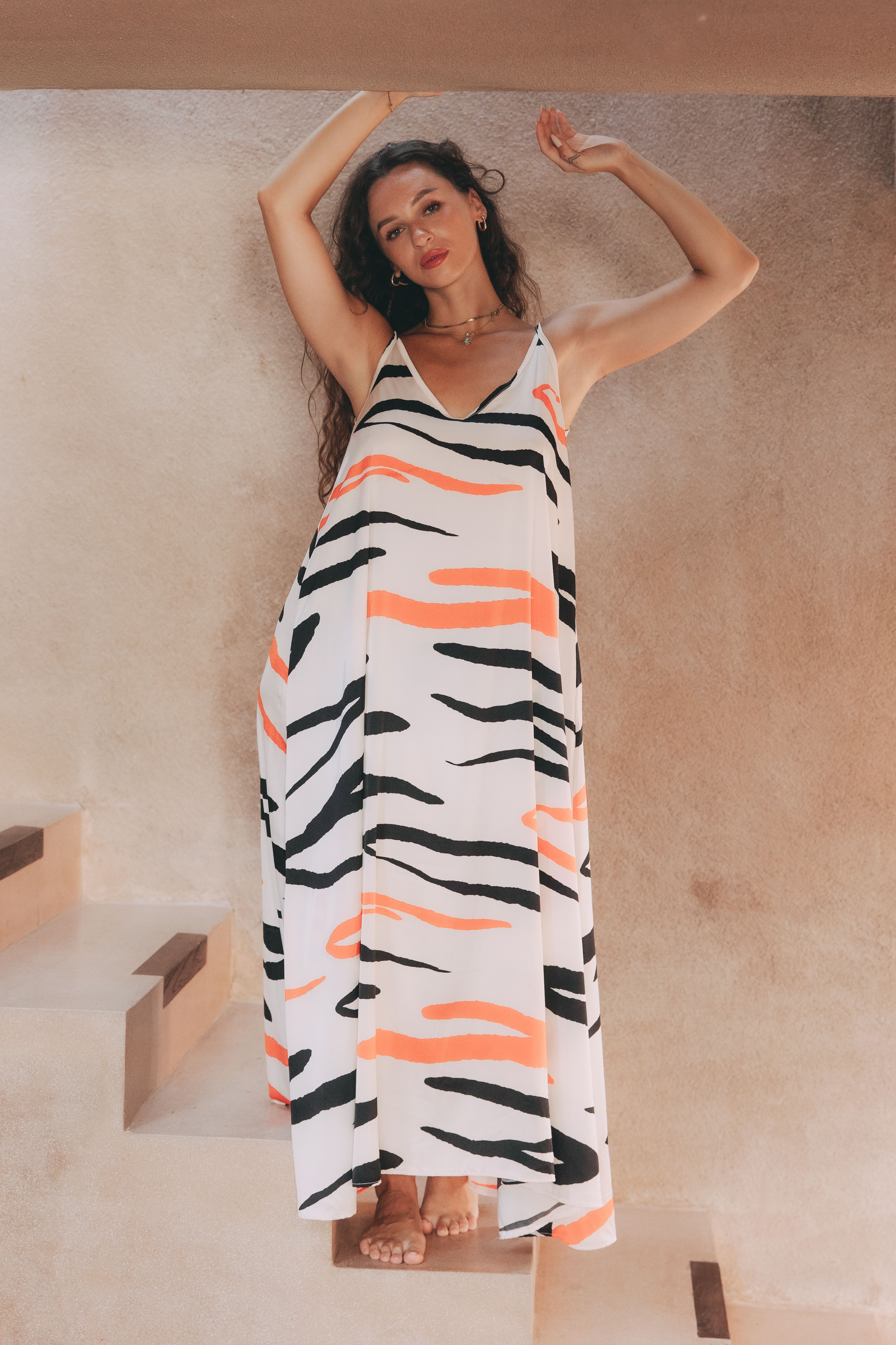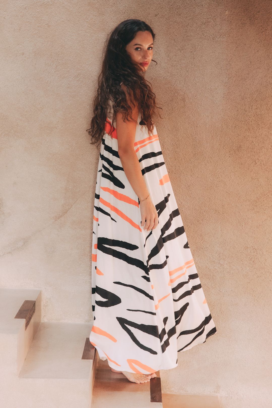 Šaty Latifa z naší limitované edice jsou tou nespoutanou esencí svobody, na kterou jste čekala. Mají rozevlátý áčkový střih, který s lehkostí tančí kolem těla, a tenká ramínka sbíhající se do rafinovaného véčka.