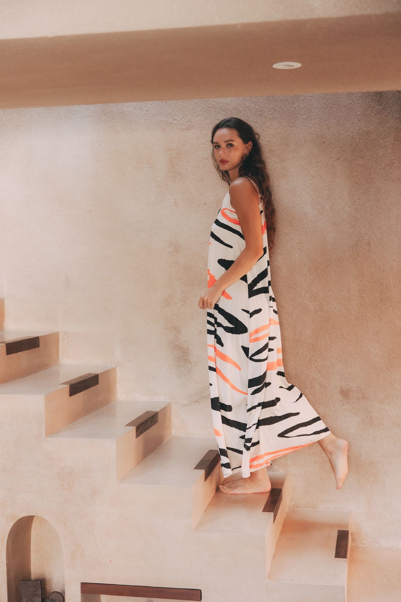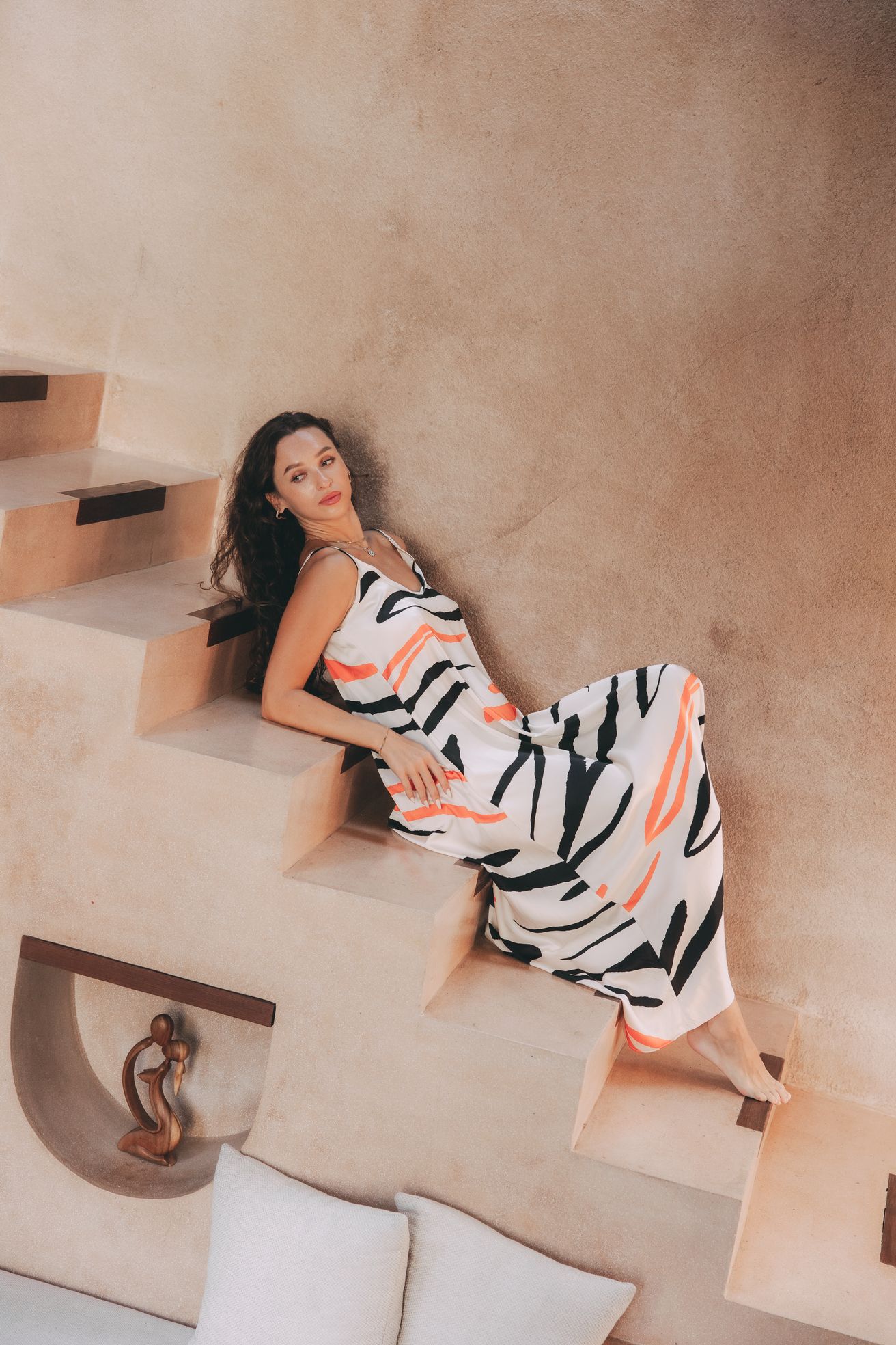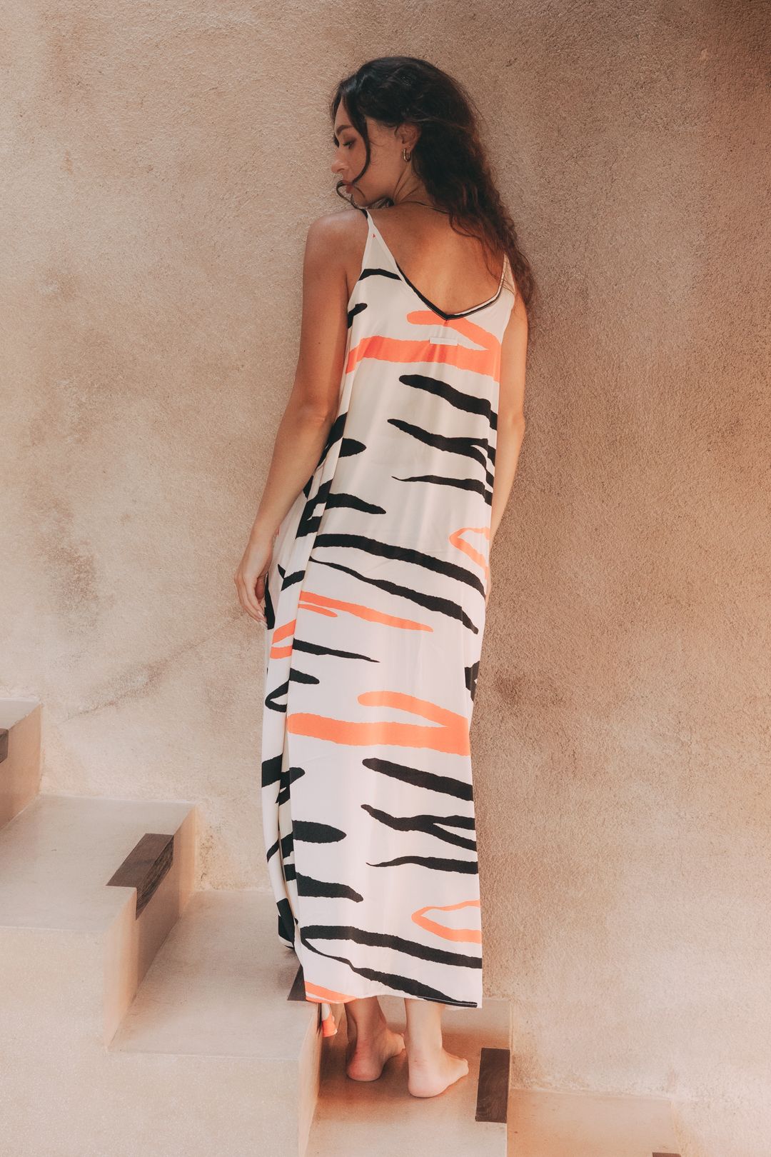 Šaty Latifa z naší limitované edice jsou tou nespoutanou esencí svobody, na kterou jste čekala. Mají rozevlátý áčkový střih, který s lehkostí tančí kolem těla, a tenká ramínka sbíhající se do rafinovaného véčka.