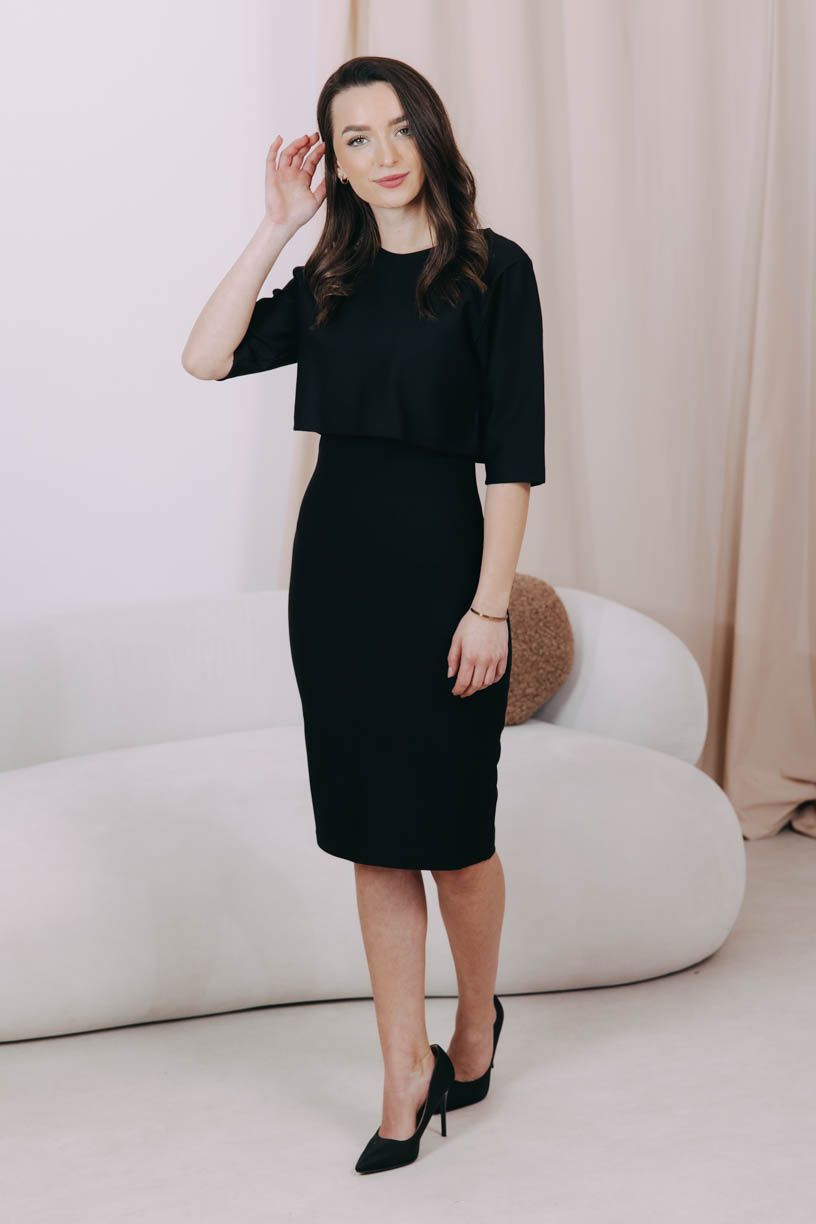 Obepnuté černé šaty Mandisa s délkou ke kolenům, rozparkem a kulatým výstřihem plus crop top Azmera – jasný basic pro všechny milovnice módního minimalismu.