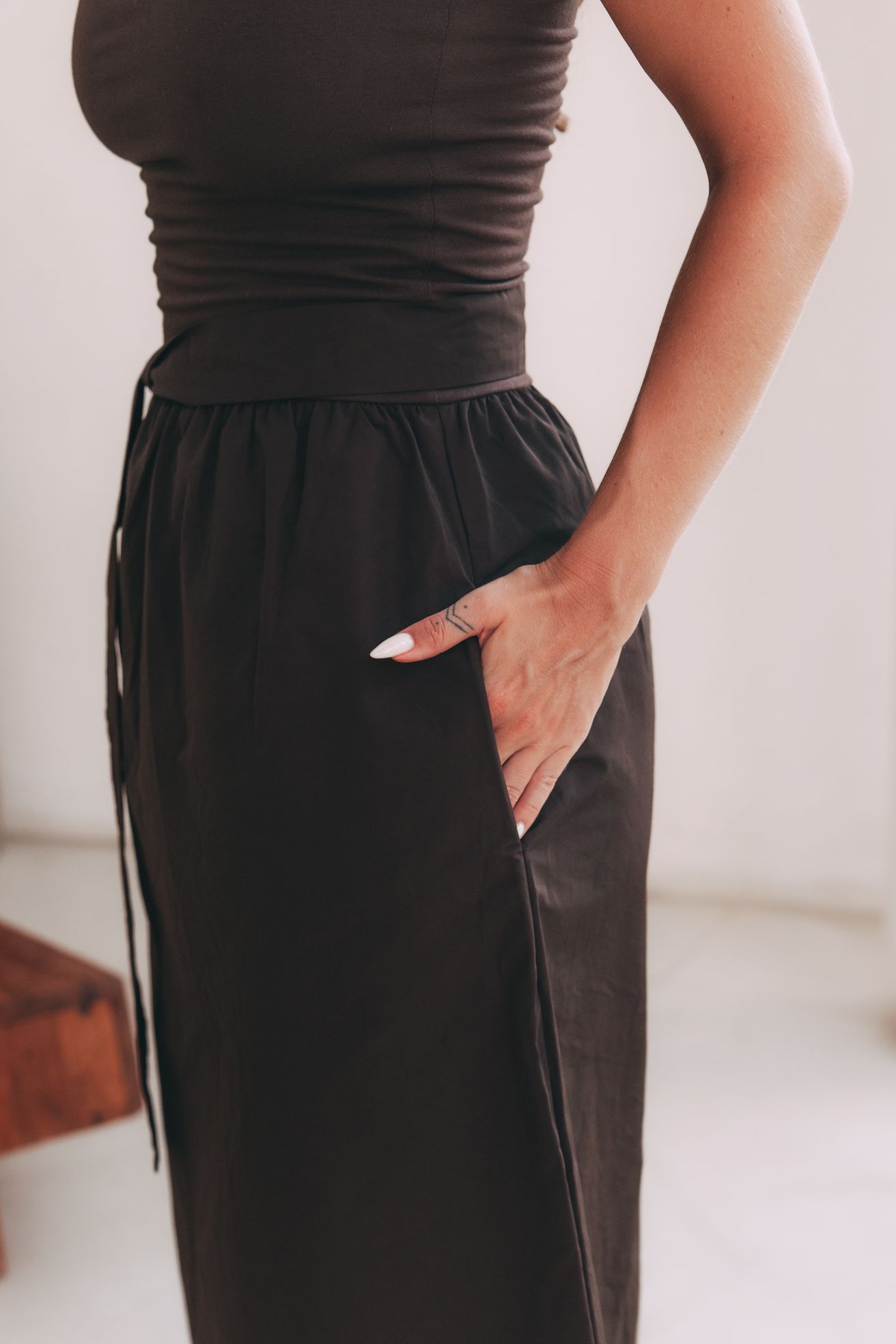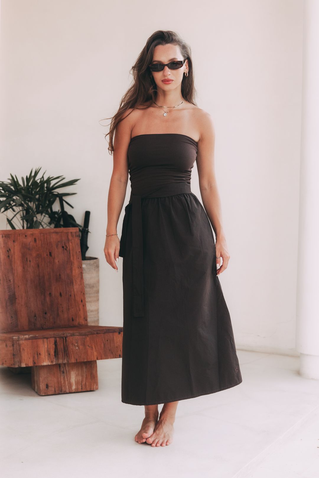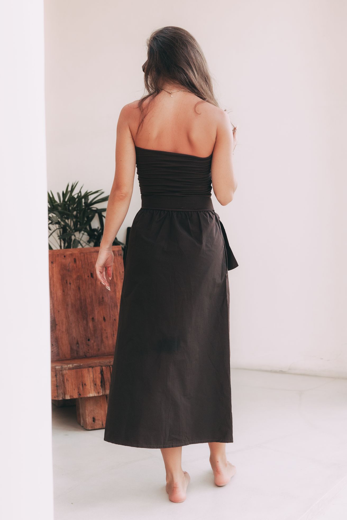 Existují kousky, které nepotřebují hlasitá gesta, aby si podmanily prostor. Šaty Mumbi jsou přesně takové – jsou definicí tichého luxusu a sebevědomí, které nemusí nic vysvětlovat. V jejich čokoládově hnědém odstínu se snoubí hloubka, elegance a stoprocentní ženskost.