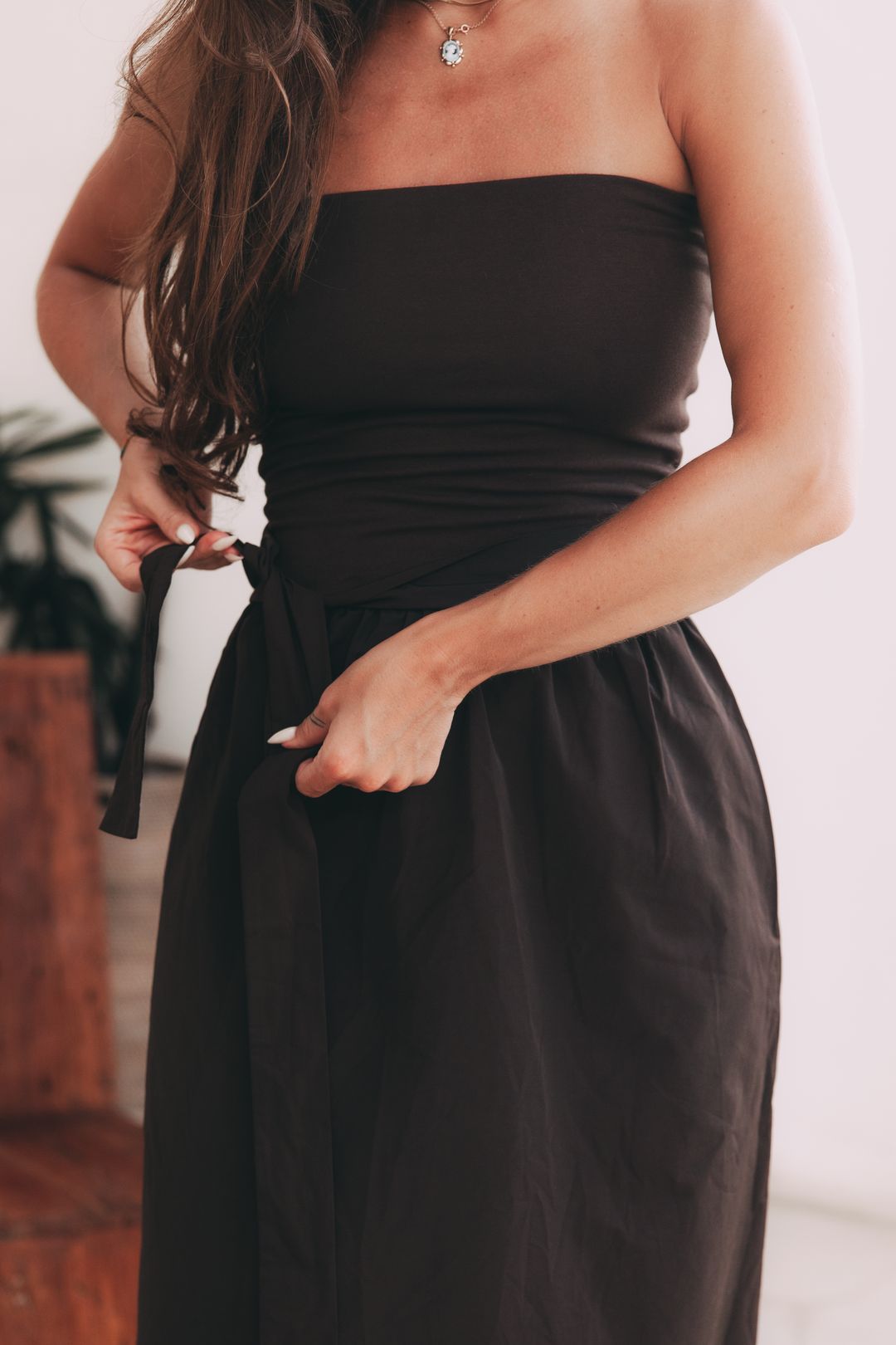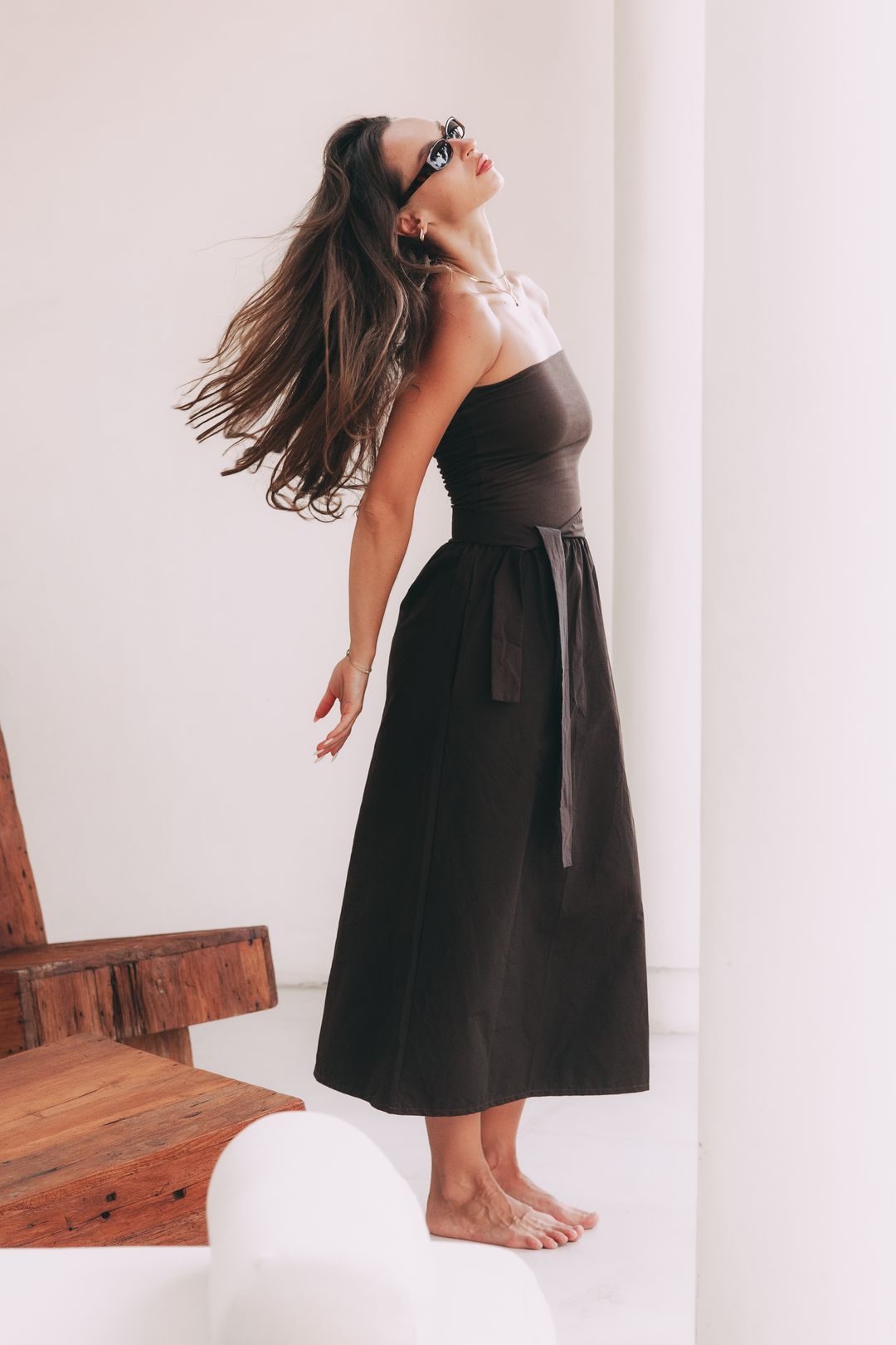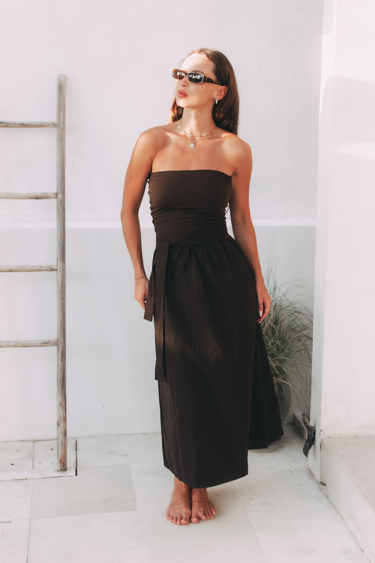 Existují kousky, které nepotřebují hlasitá gesta, aby si podmanily prostor. Šaty Mumbi jsou přesně takové – jsou definicí tichého luxusu a sebevědomí, které nemusí nic vysvětlovat. V jejich čokoládově hnědém odstínu se snoubí hloubka, elegance a stoprocentní ženskost.