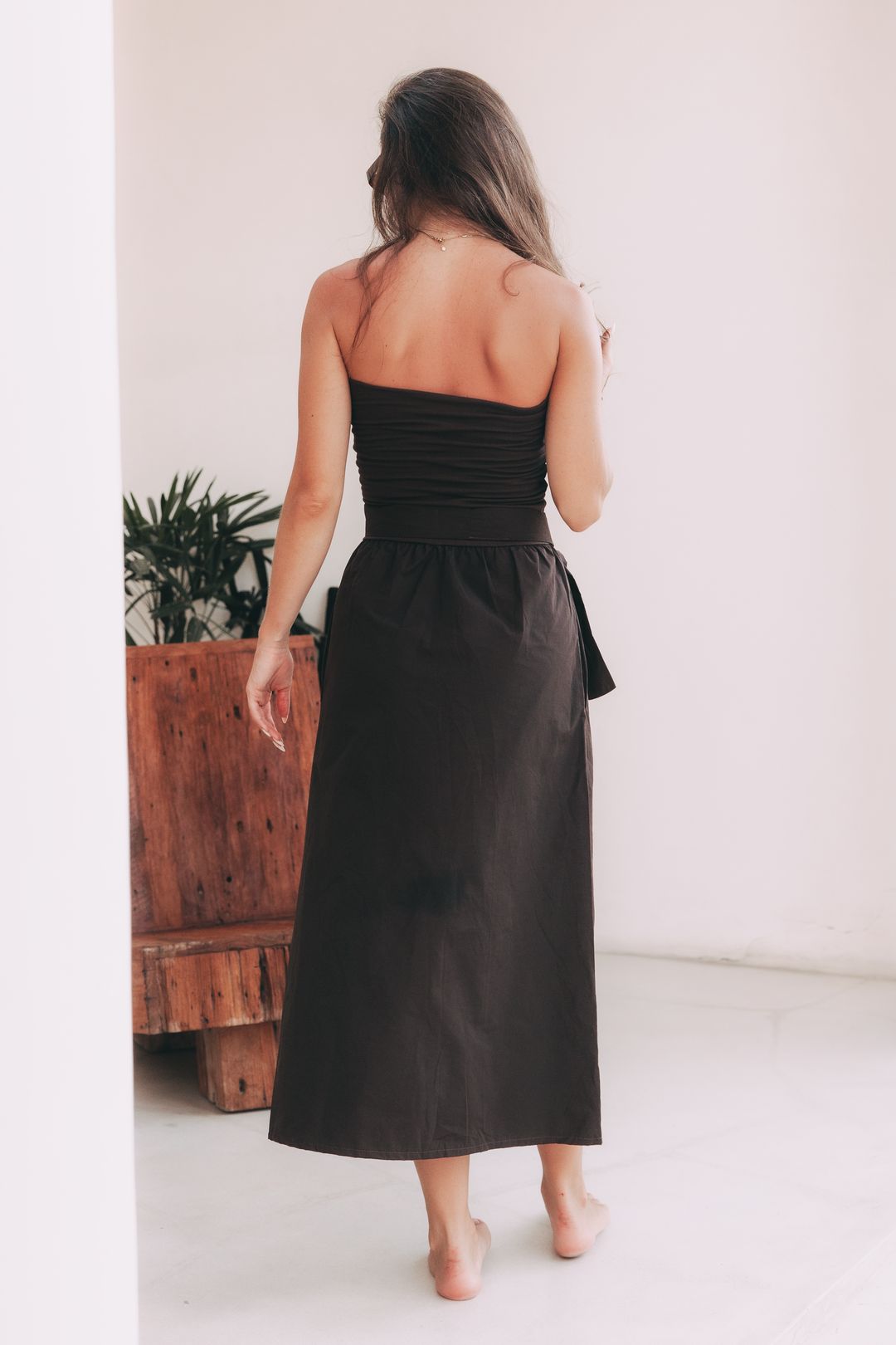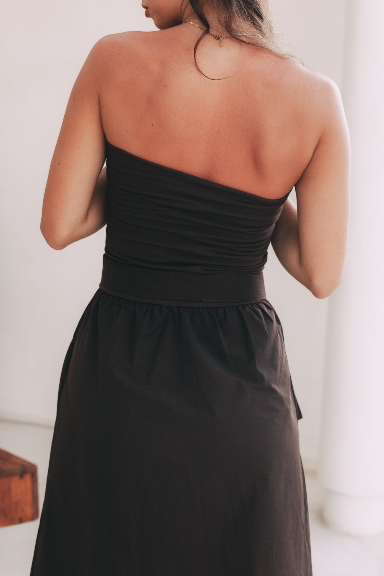 Objevte dokonalou rovnováhu mezi minimalismem a ženskostí. Midi šaty Mumbi bez ramínek jsou navrženy pro ženy, které ocení nadčasový střih a čisté linie.