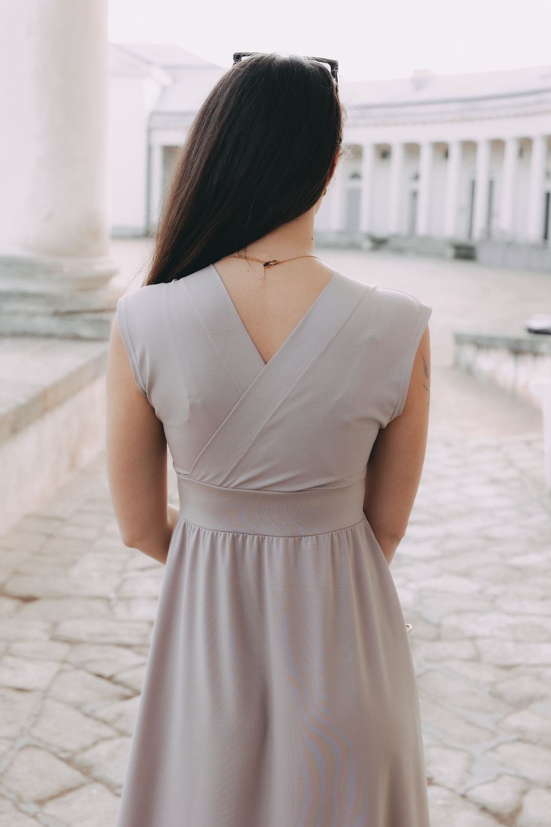 - Na svatbu či zahradní párty: Doplňte šaty jemnými zlatými šperky, páskovými sandálky na podpatku a výraznějším líčením. Pro chladnější večer přehoďte přes ramena náš blejzr Leila Creeme a užijte si tak párty v pohodlí třeba až do ranních hodin.