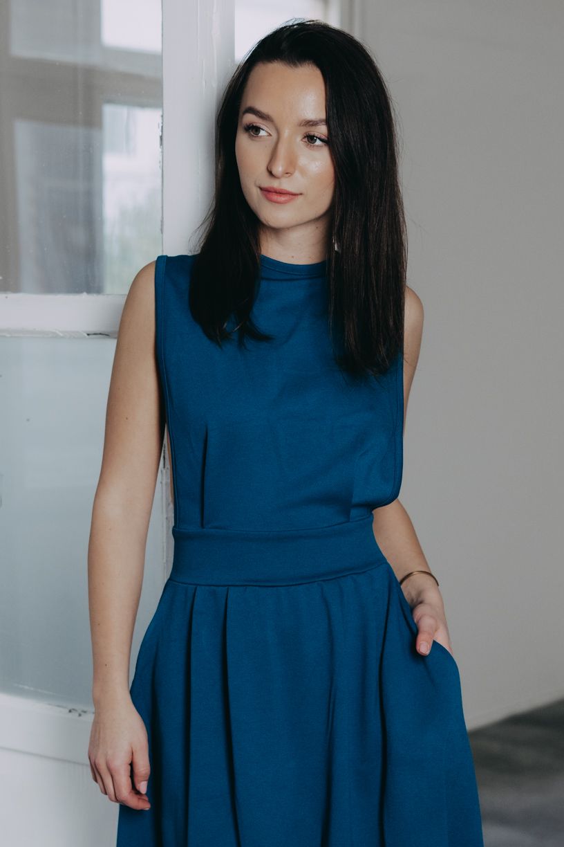 Šaty Safira dokážou dokonale zmást. Proč? Zepředu vypadají jako vypasované áčkovky bez rukávů, zatímco z boku a zezadu jsou spíš tak trochu laclového střihu. Sukně v midi délce v sobě ukrývá nezbytné kapsy, kam schováte ruce či pár drobností, a které šatům dodávají punc ležérní elegance.