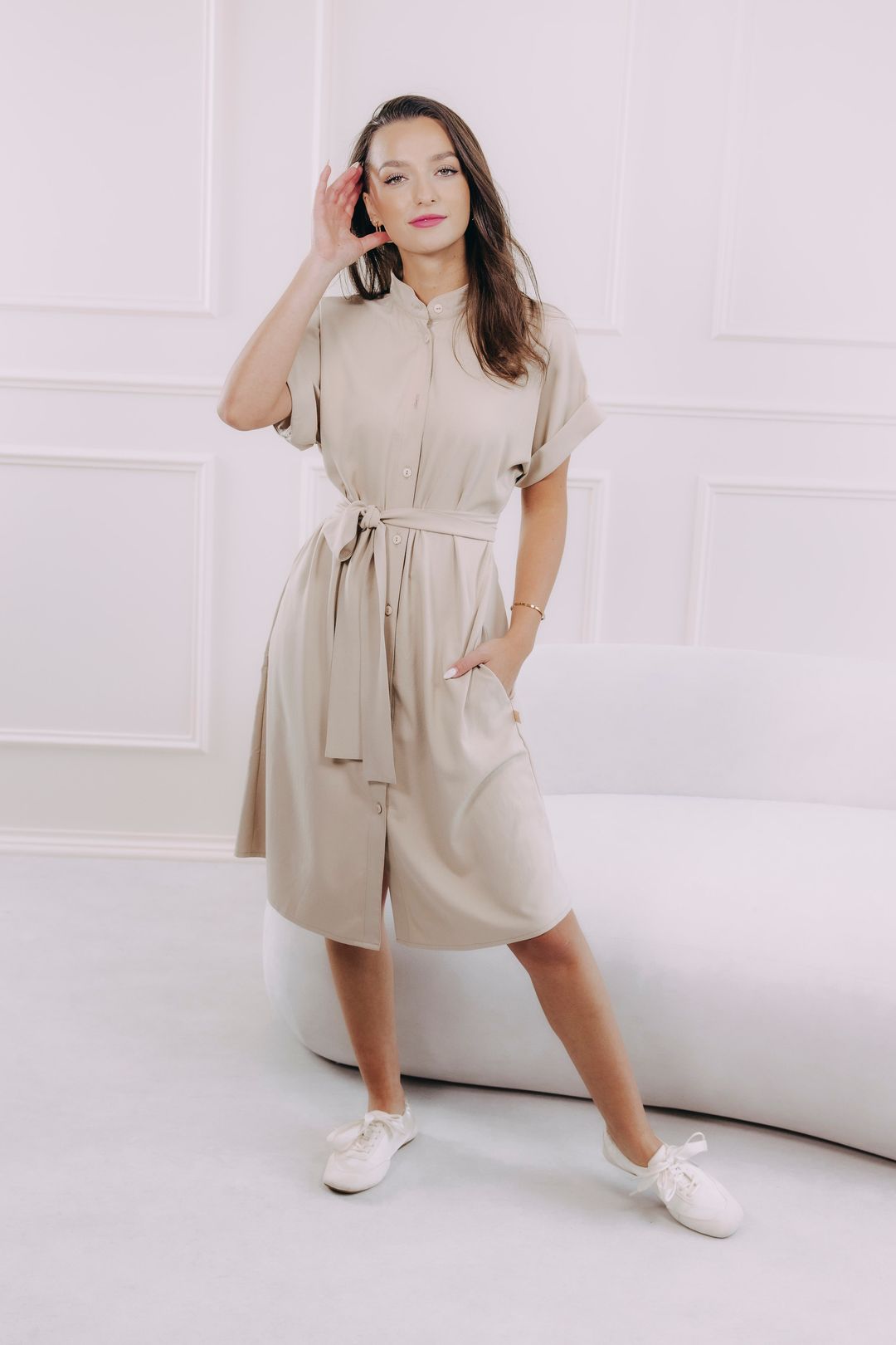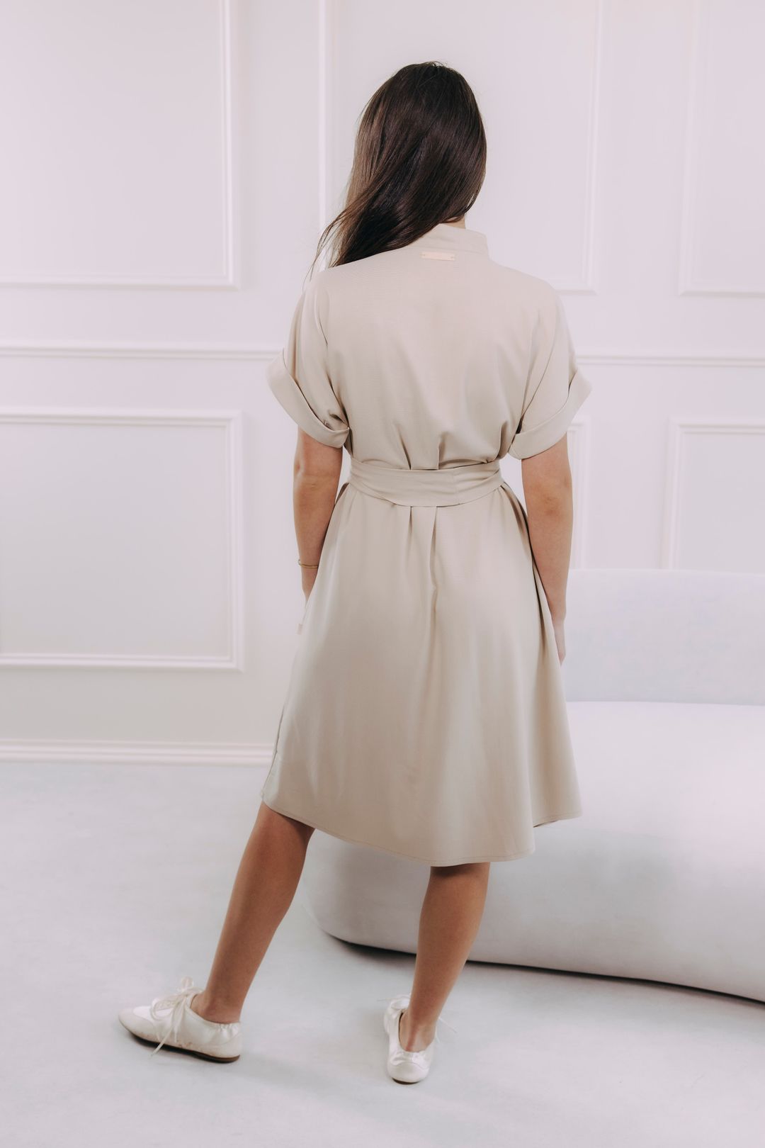 - Praktičnost: Délka ke kolenům, ohrnuté rukávy a decentní praktické kapsy, které nijak nenarušují siluetu.