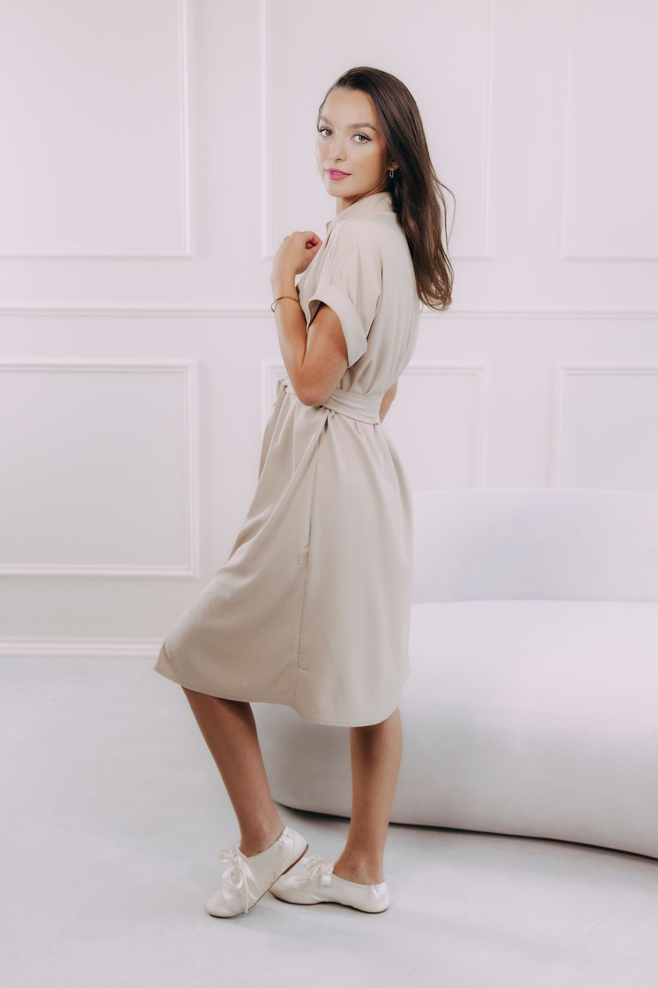 - Decentní detaily: Mají hravé kapsy, límeček a knoflíčky, s nimiž si můžete pohrát podle nálady. Pásek krásně podtrhne siluetu a skvěle ladí s ohrnutými rukávy.