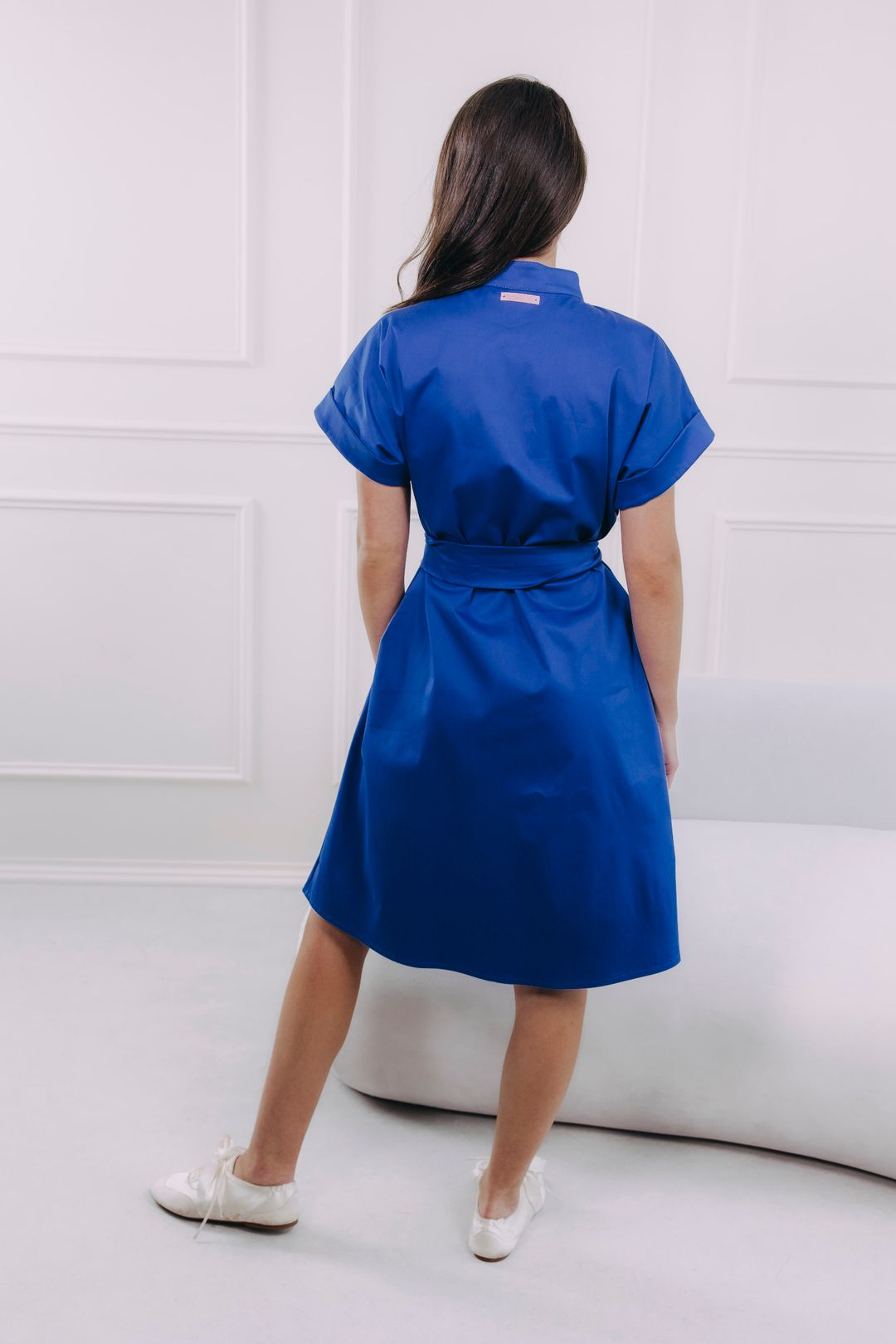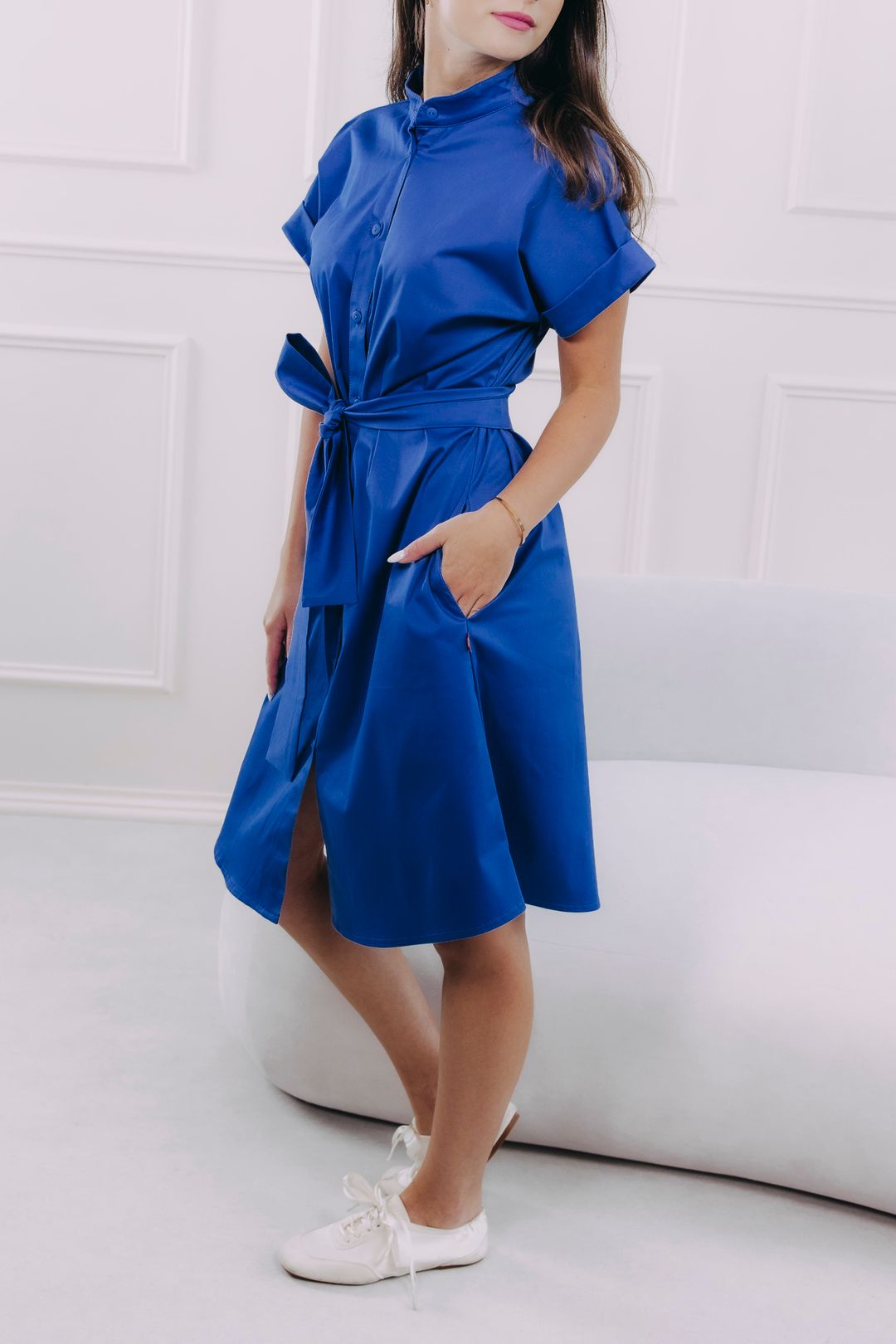 - Praktičnost: Délka ke kolenům, ohrnuté rukávy a decentní praktické kapsy, které nijak nenarušují siluetu.