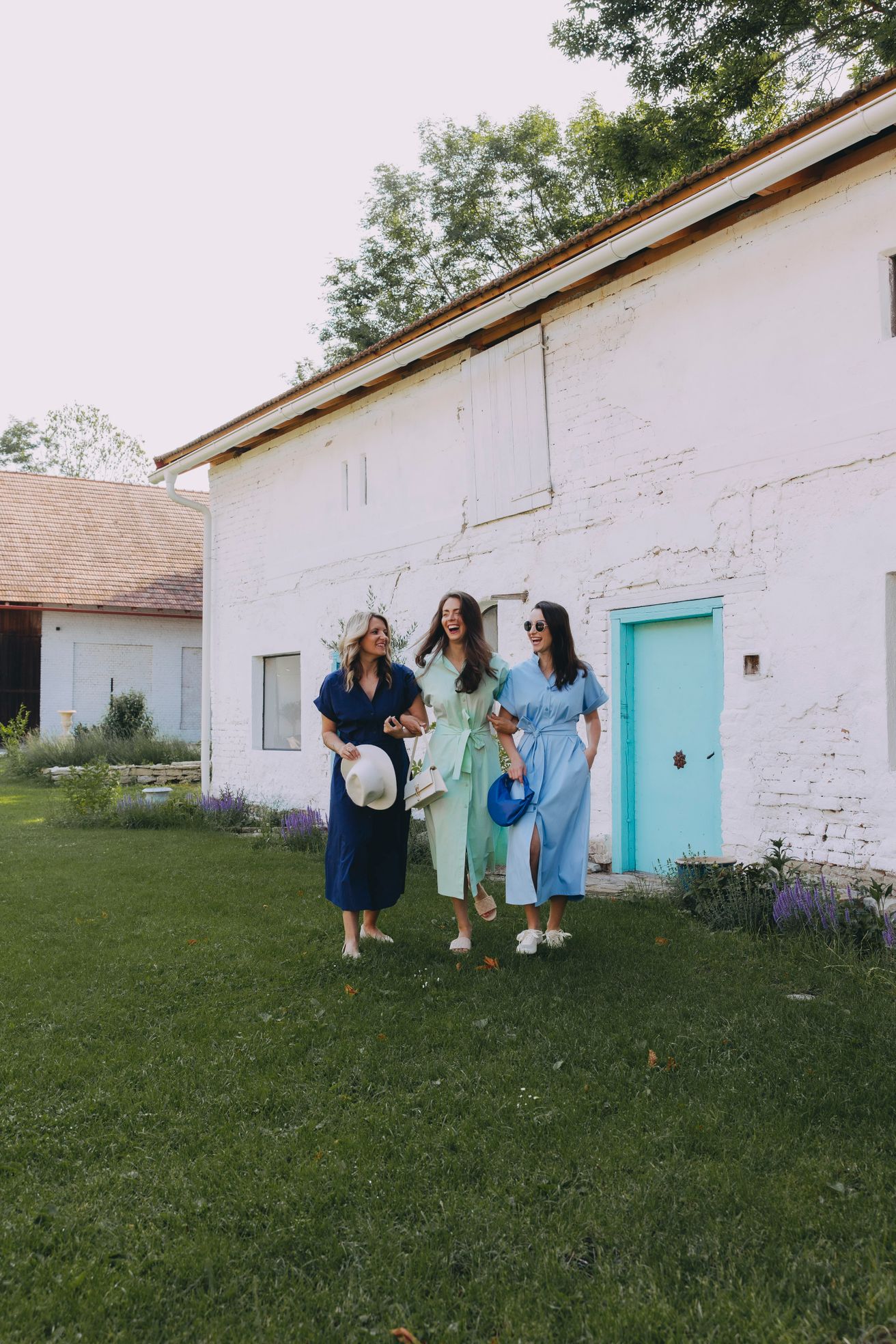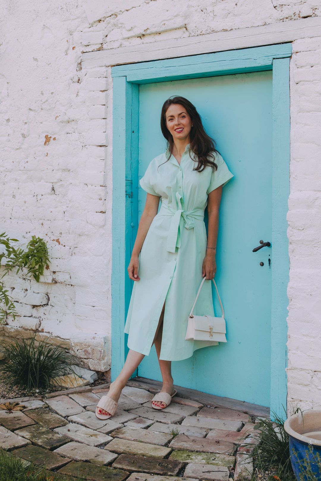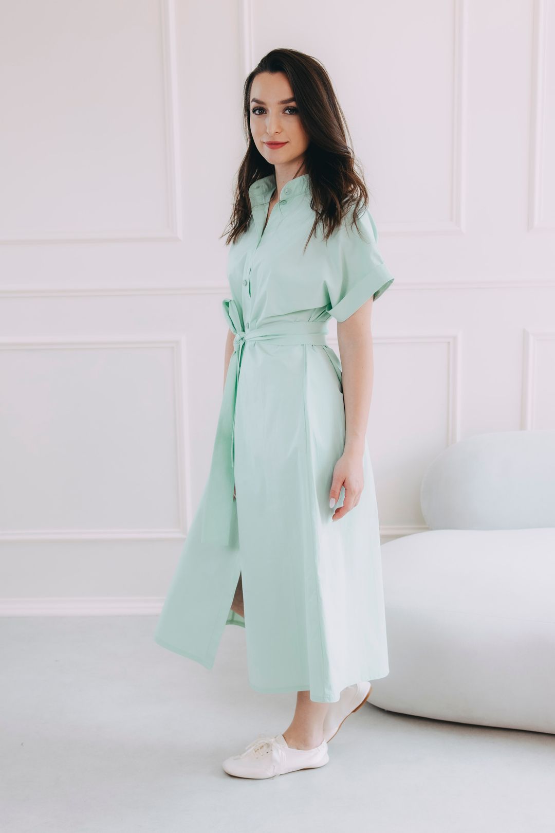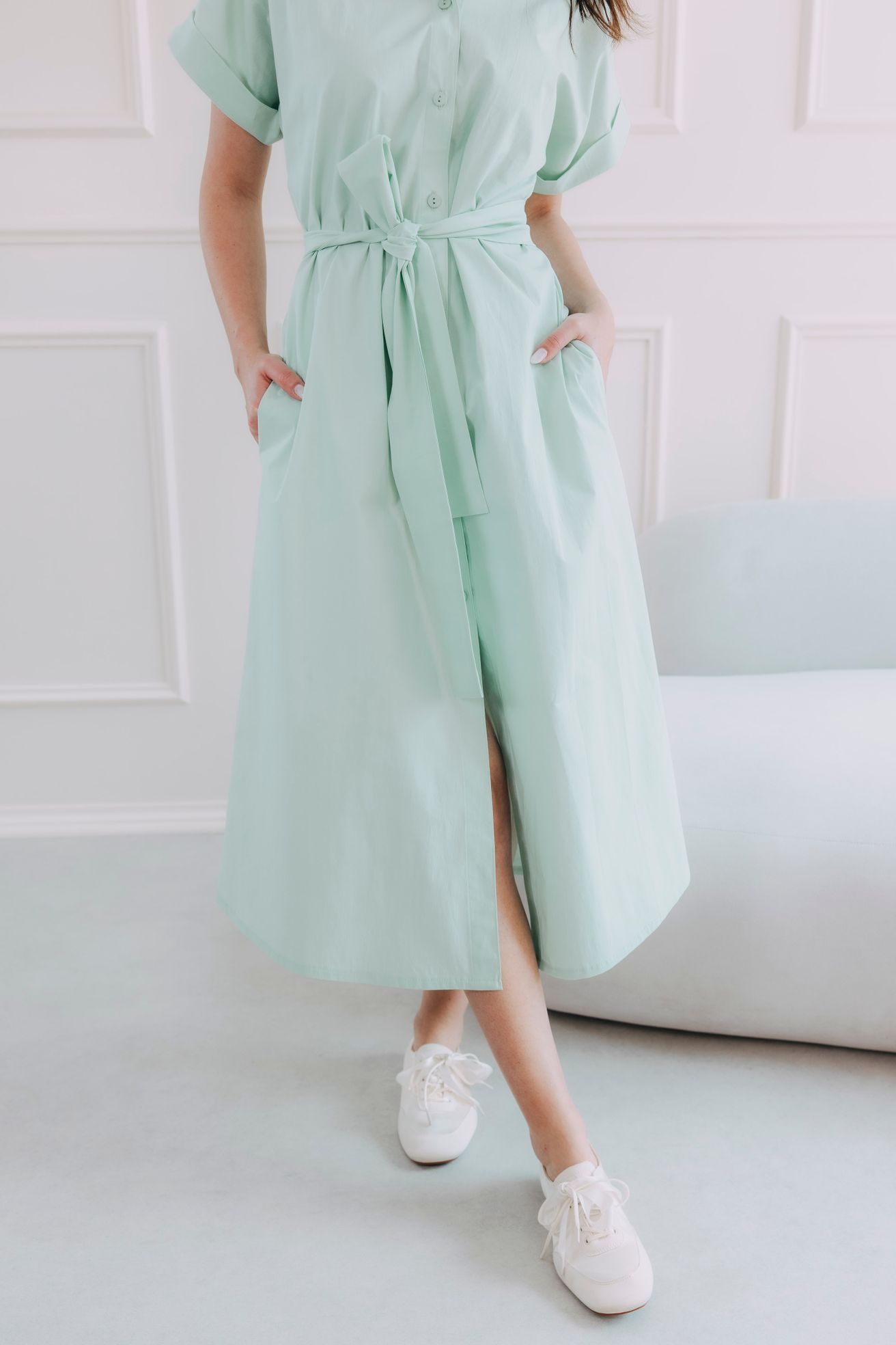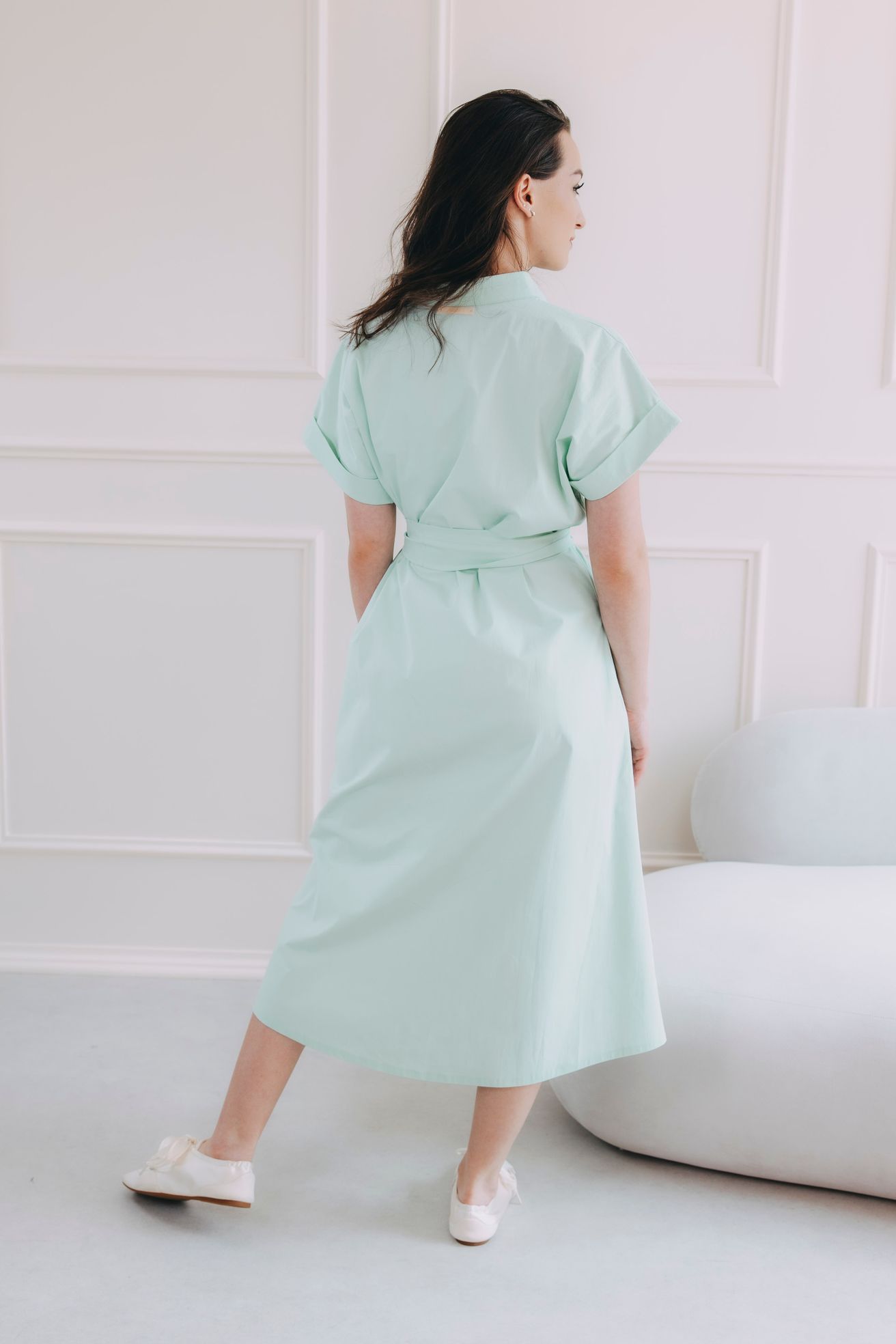 • Rukávy: Jejich ohrnuté konce dodávají šatům lehce ležérní nádech.
