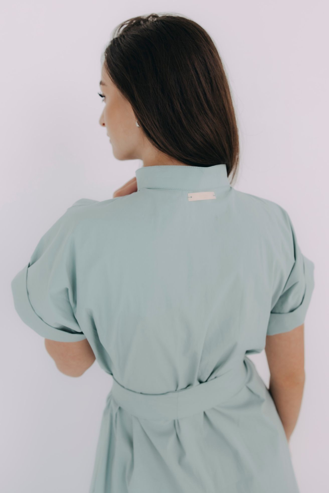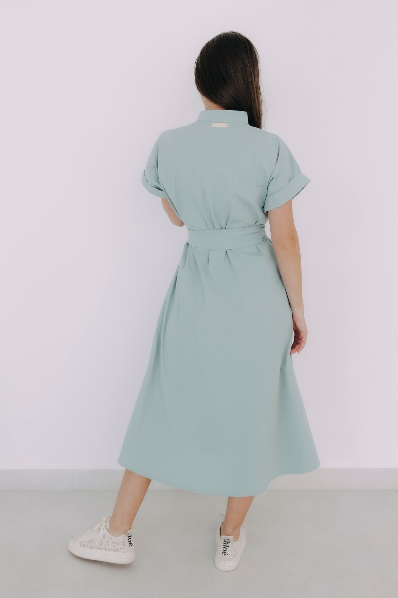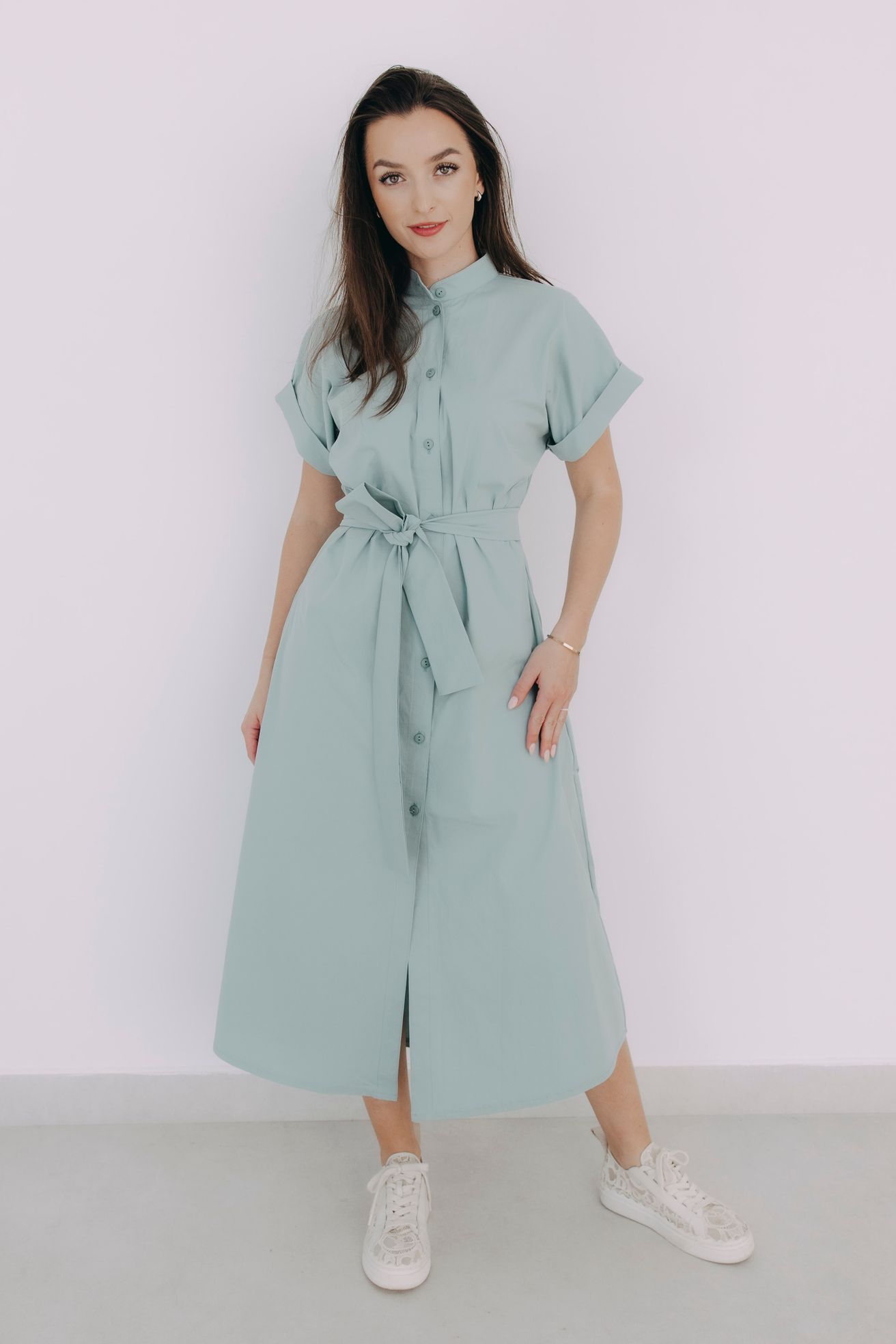 - Rukávy: Jejich ohrnuté konce dodávají šatům lehce ležérní nádech.