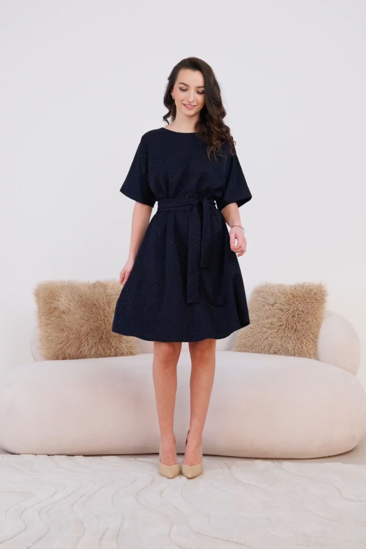 Šaty Sia jsou přesně tím typem outfitu, ve kterém zazáříte na vánočním večírku i u štědrovečerního stolu. Jsou elegantní, jednoduché, a přitom tak sofistikované. Každá z vás si je zamiluje pro jejich volnost oversized střihu (který neobepíná) s dlouhou stuhou, která definuje pas. Kvalitní nemačkavá látka s třpytkami působí nenuceně, ale přitom velmi žensky. Vsaďte v letošní sezóně večírků a plesů na tyto temně modré šaty s kamínky a nechte vyniknout svou výjimečnost.