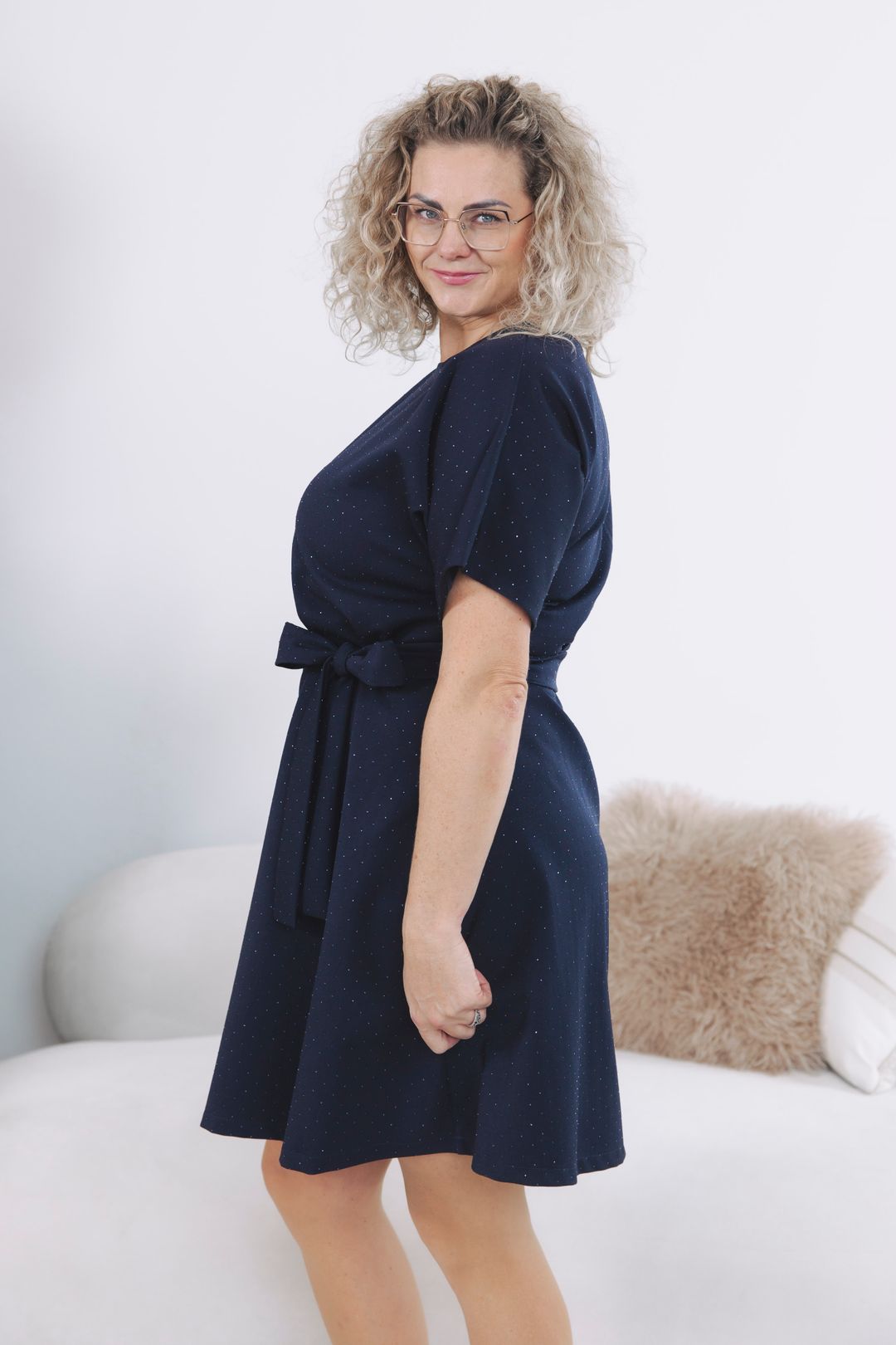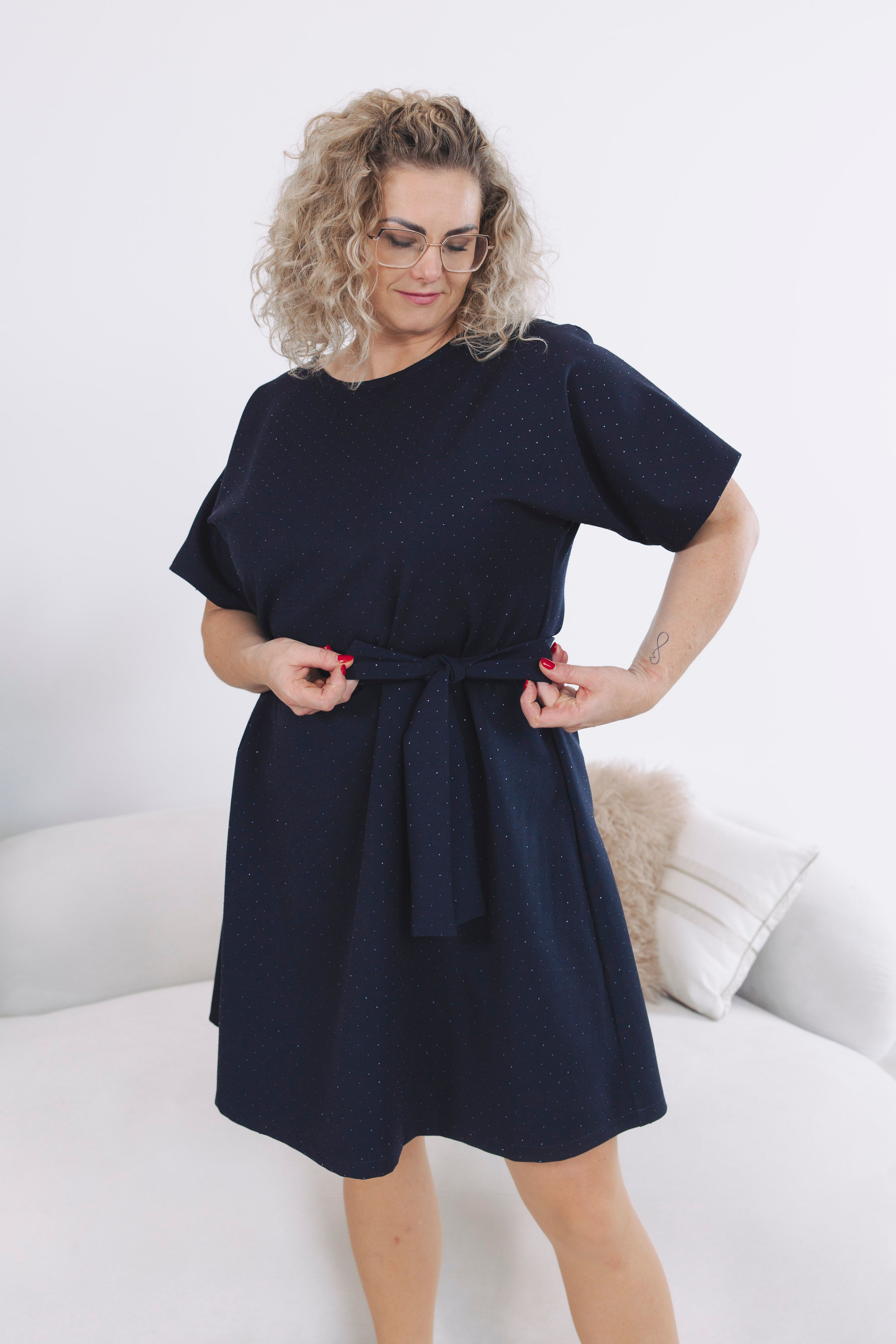 Nebojte se sáhnout po menší velikosti – střih je volnější a pásek v pase udělá zázraky. Díky němu si šaty upravíte tak, aby lichotily přesně vaší postavě.
