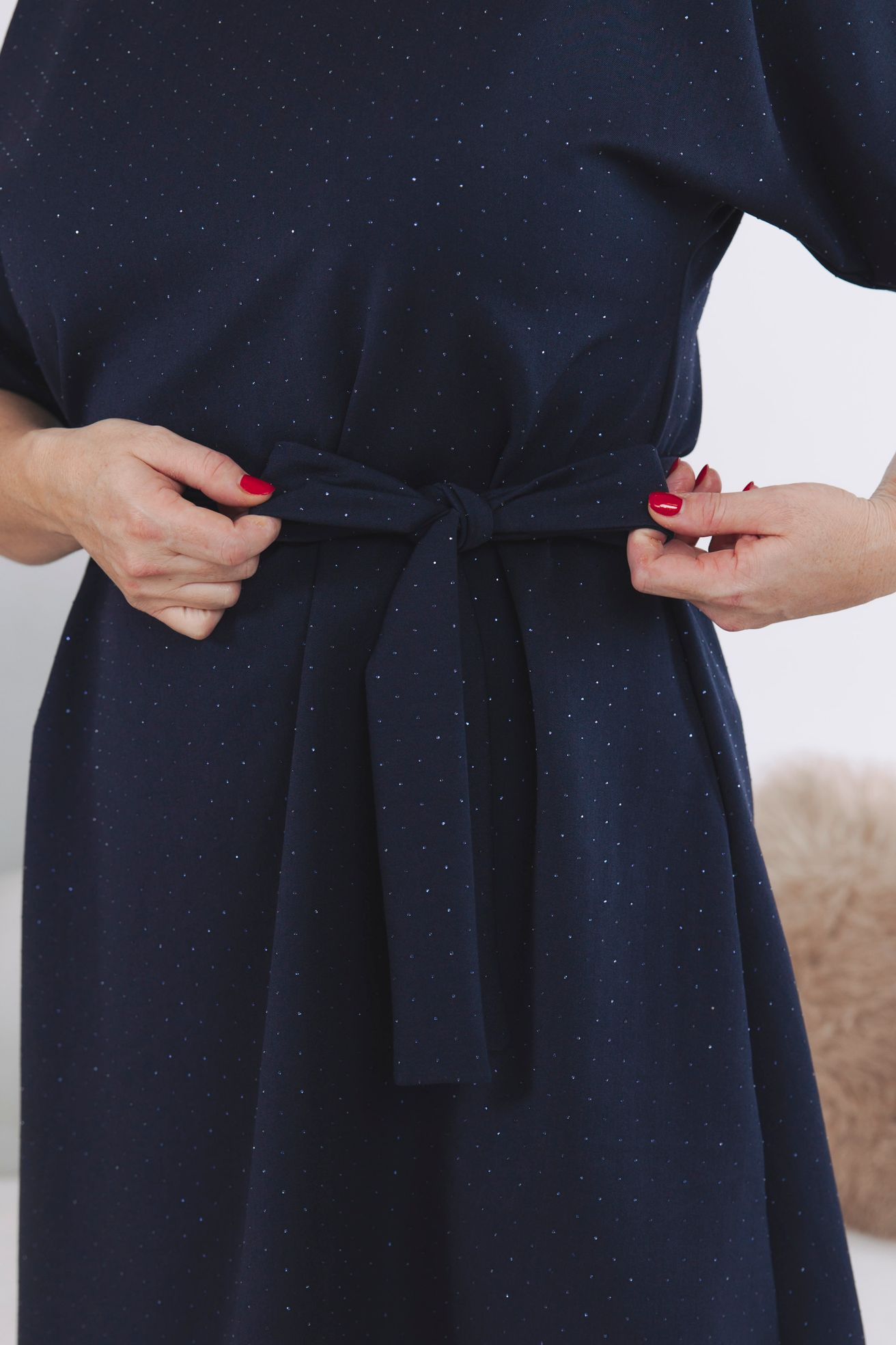 Šaty Sia jsou přesně tím typem outfitu, ve kterém zazáříte na vánočním večírku i u štědrovečerního stolu. Jsou elegantní, jednoduché, a přitom tak sofistikované. Každá z vás si je zamiluje pro jejich volnost oversized střihu (který neobepíná) s dlouhou stuhou, která definuje pas. Kvalitní nemačkavá látka s třpytkami působí nenuceně, ale přitom velmi žensky. Vsaďte v letošní sezóně večírků a plesů na tyto temně modré šaty s kamínky a nechte vyniknout svou výjimečnost.