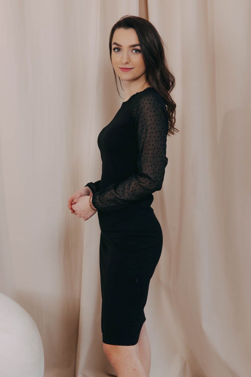 Šaty jsme oživili jemnými hravými tečkami, abychom jako ženy nebyly stále vážné a myslely na to, že radost se skrývá v malých detailech. Rukávy si pohodlně vyhrnete až k loktům.