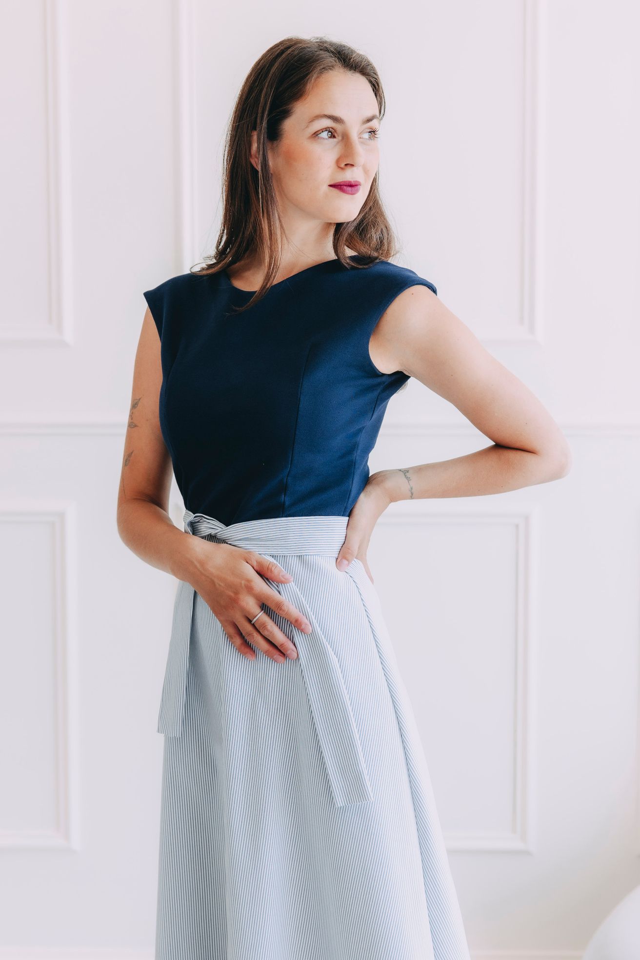 - Střih: Elegantní vrchní díl připomíná pouzdrové šaty s výstřihem do V, širokými ramínky. Jemné záševky krásně tvarují postavu. Lehká áčková sukně s páskem zvýrazní pas a dodá na ženskosti.