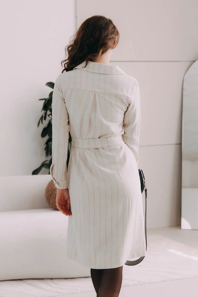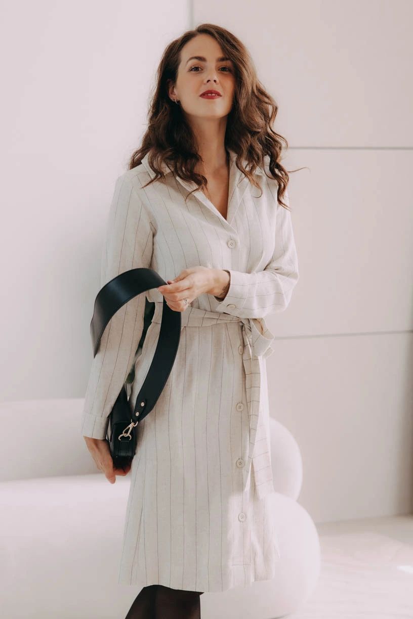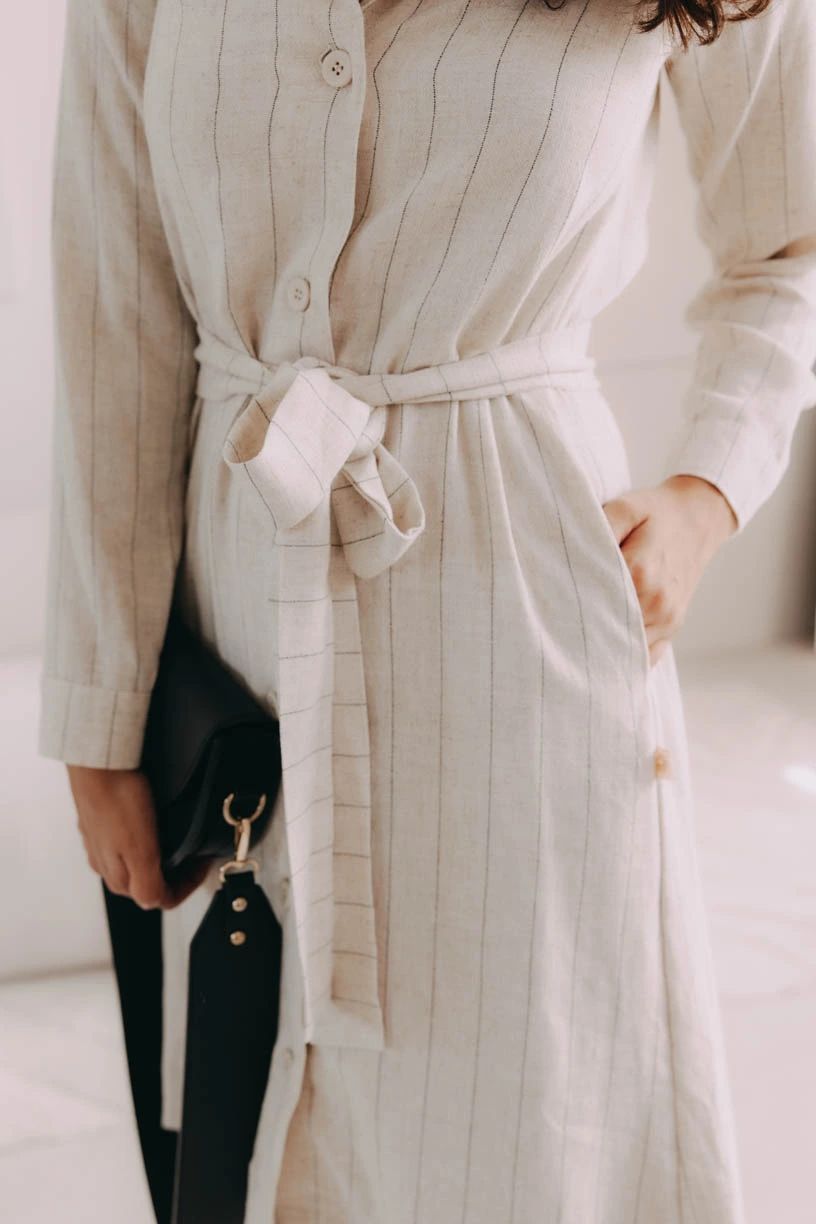 Musíte uznat, že naše šaty Thaba jsou opravdu povedený kousek do šatníku. Mix viskózy se lnem jsme spojili s pohodlným košilovým střihem, který s oblibou nosily i módní ikony Audrey Hepburn a Grace Kelly. Vsadíme se, že padnou do oka i vám. Na elegantní výstřih do V plynule navazuje řada knoflíků, které se táhnou po celé přední části. Rukávy jsou vyhrnuty do úzké manžety, kterou si můžete stáhnout na předloktí. Střih po kolena lichotí jakékoli postavě a s volně přiloženým páskem v barvě šatů si pěkně vytvarujete pas.