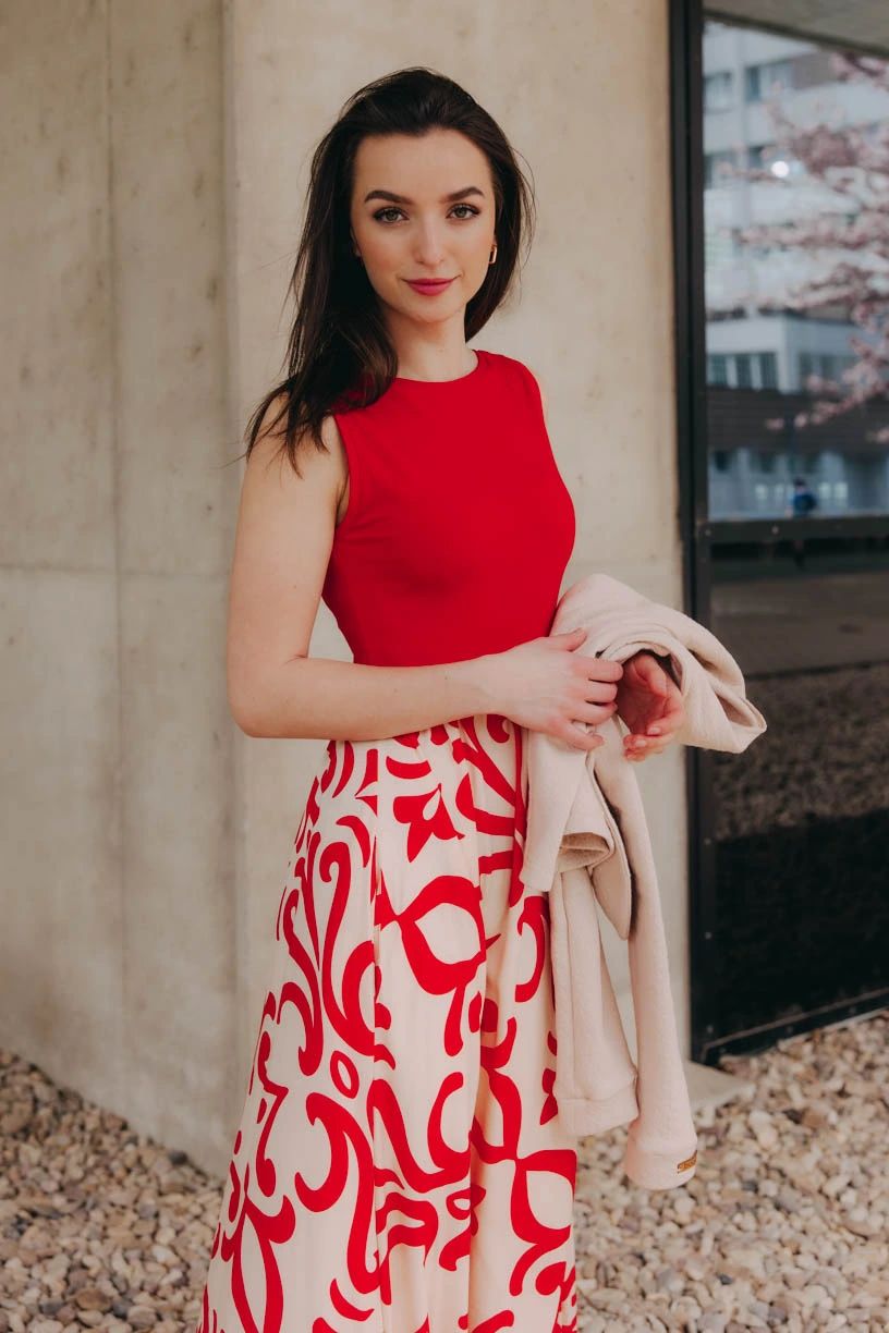 - Střih: skvěle padnoucí top přestřižený pod prsy, sukně do „áčka“