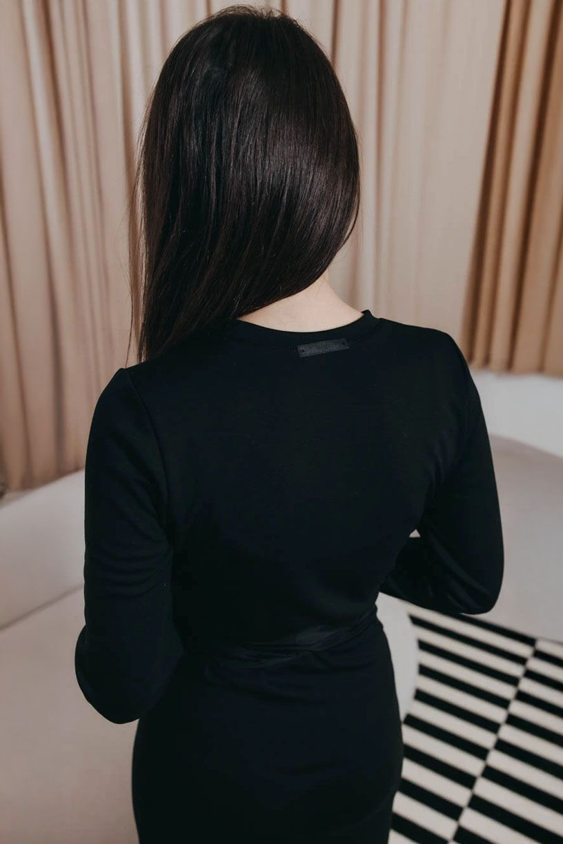 Černé šaty Jared jsou ztělesněním nadčasové elegance. Jejich přiléhavý střih krásně obepne postavu, zatímco materiál s vysokou gramáží  dodáva šatům pevnost a umožňuje tvarovaní pasu přesně podle vašich představ.