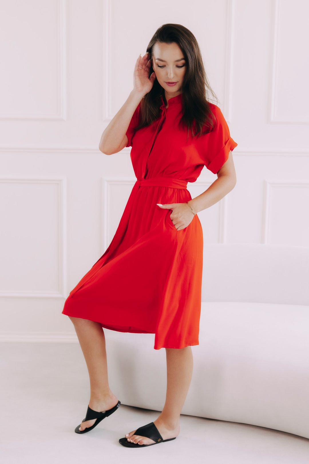 - Nenucený šmrnc a styl: Ohrnuté rukávky tvoří drobný, leč nepřehlédnutelný detail, který dodává šatům sofistikovaný vzhled.