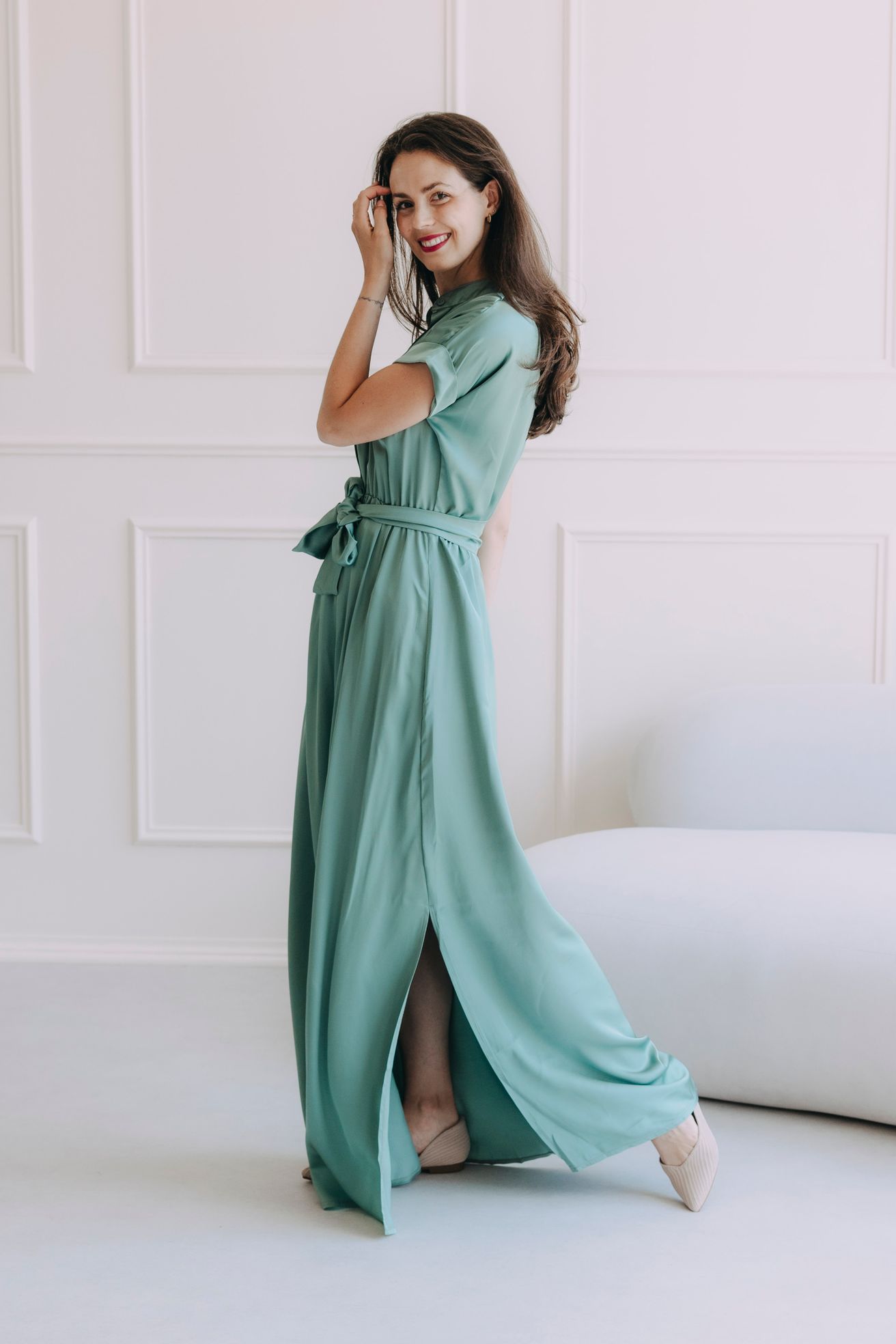 - Střih: Dlouhá linie šatů vytváří elegantní siluetu, která s lehkostí lichotí každé postavě. Je to střih, který oslavuje ženské křivky a krásně prodlouží postavu.