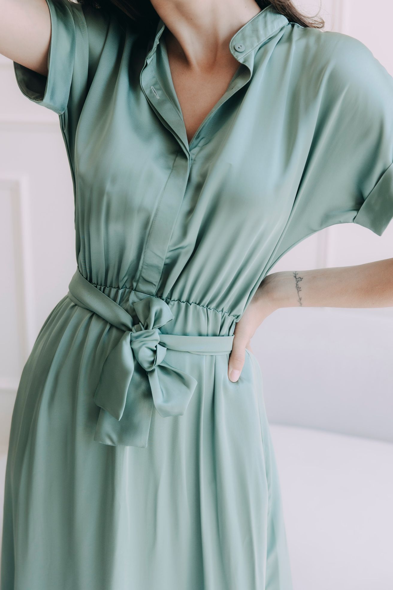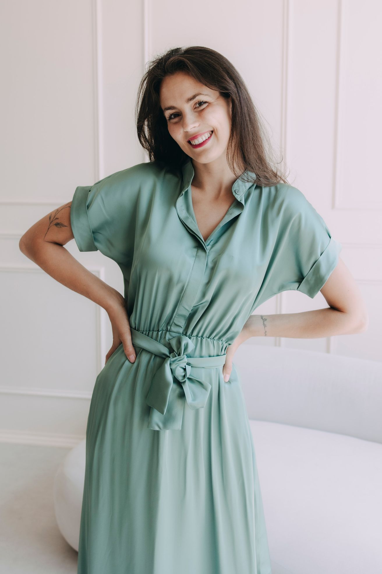 - Hra se stylem: Díky rafinovaně skrytým knoflíčkům ve vrchní části můžete mít šaty zapnuté až ke krku pro formálnější vzhled, nebo je nechat ležérně rozepnuté „na pohodu“. Decentně a zajímavě zakončené rukávky a zavazovací pásek na ozdobu dodají šatům osobitost a kouzlo.